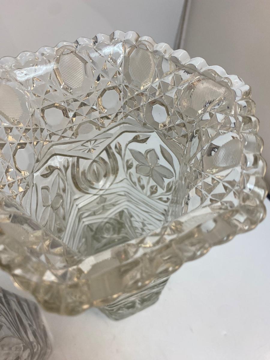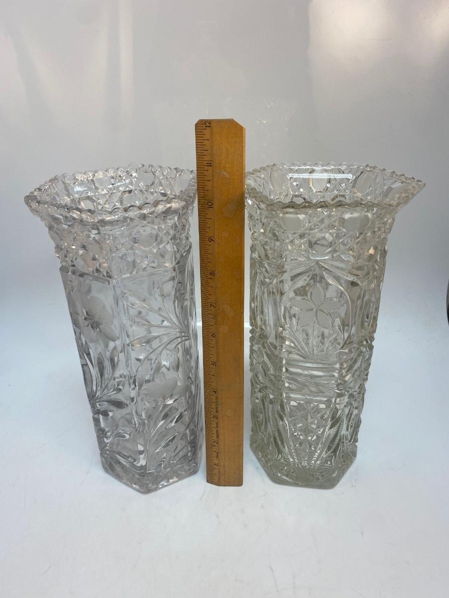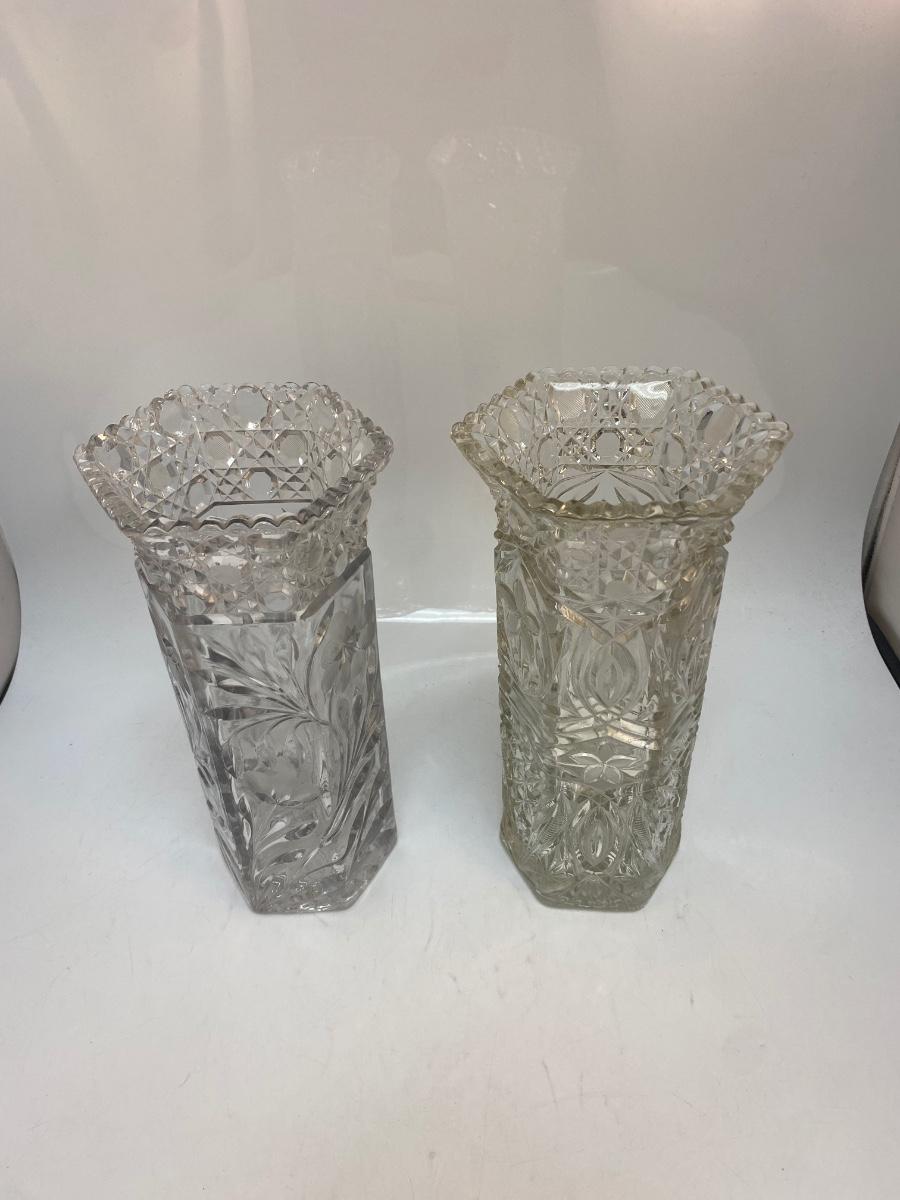 Pair of Similar Cut Etched Crystal Flower Vases Sawtooth Edge Different Floral Patterns