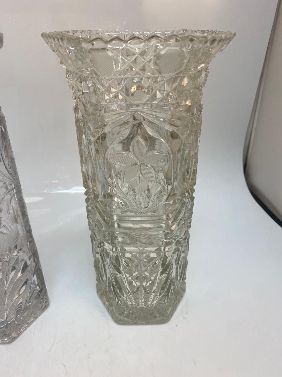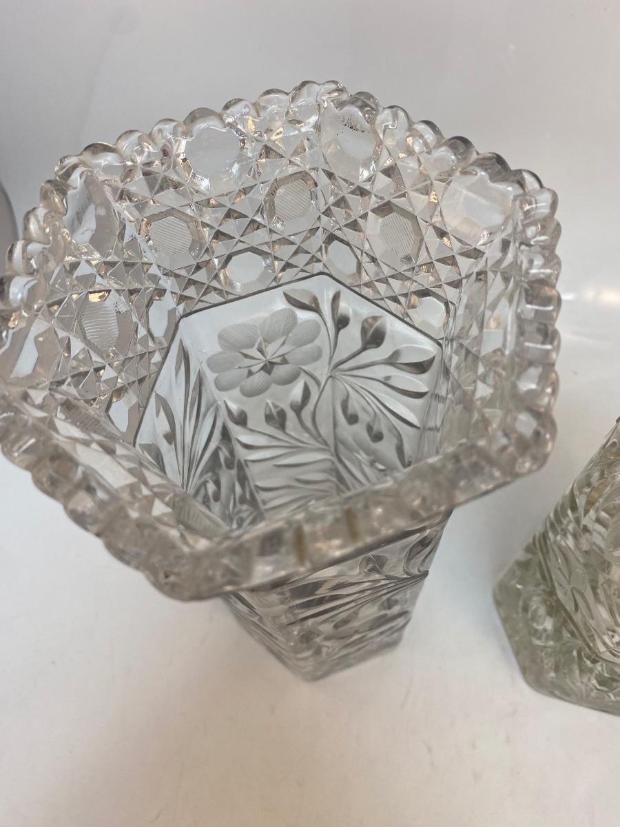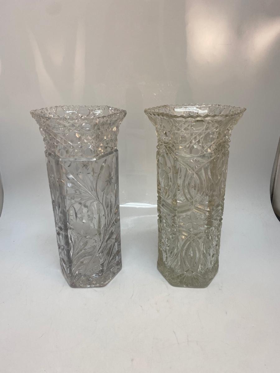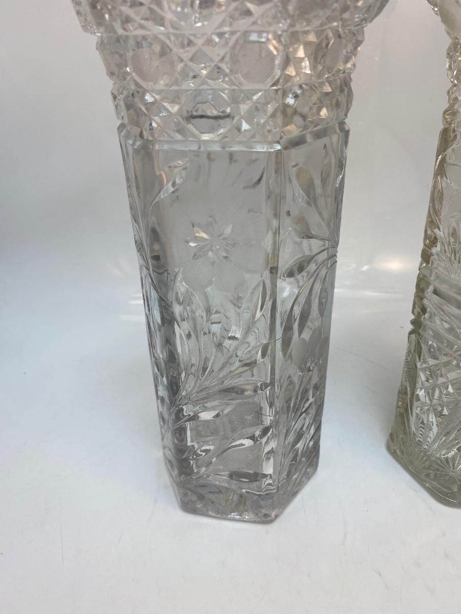 Pair of Similar Cut Etched Crystal Flower Vases Sawtooth Edge Different Floral Patterns