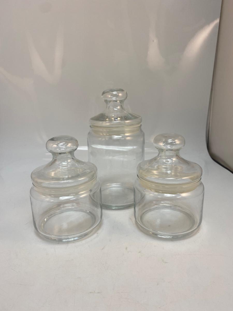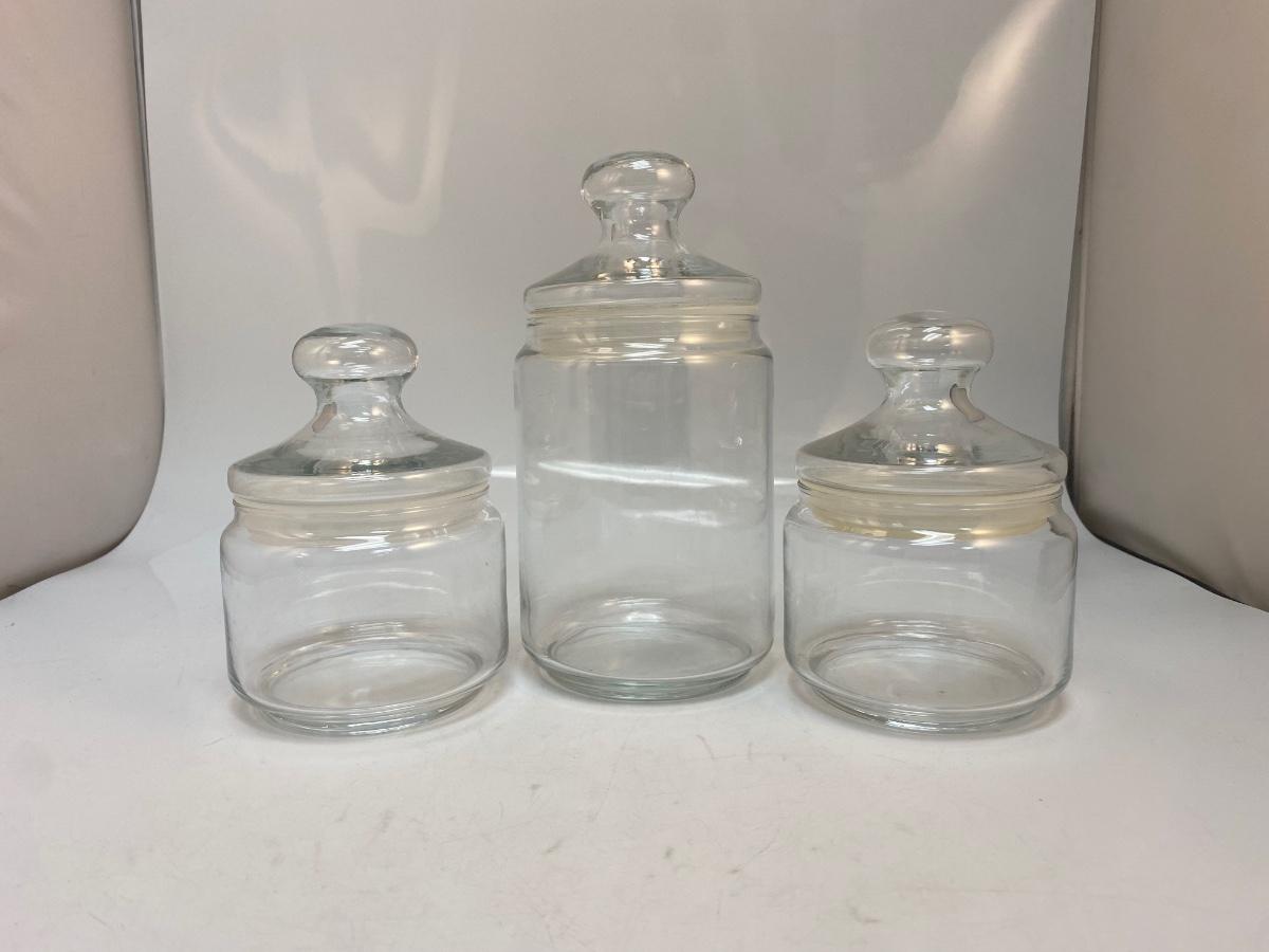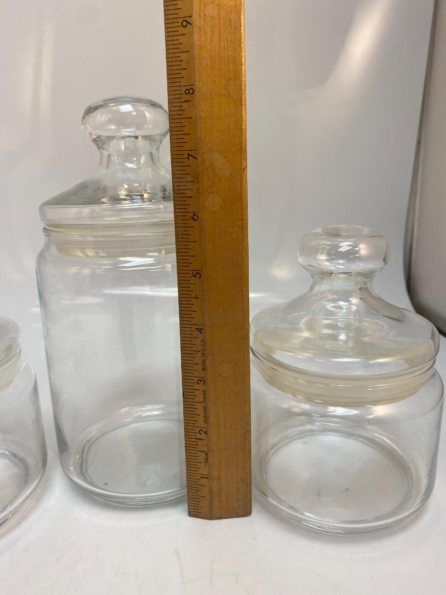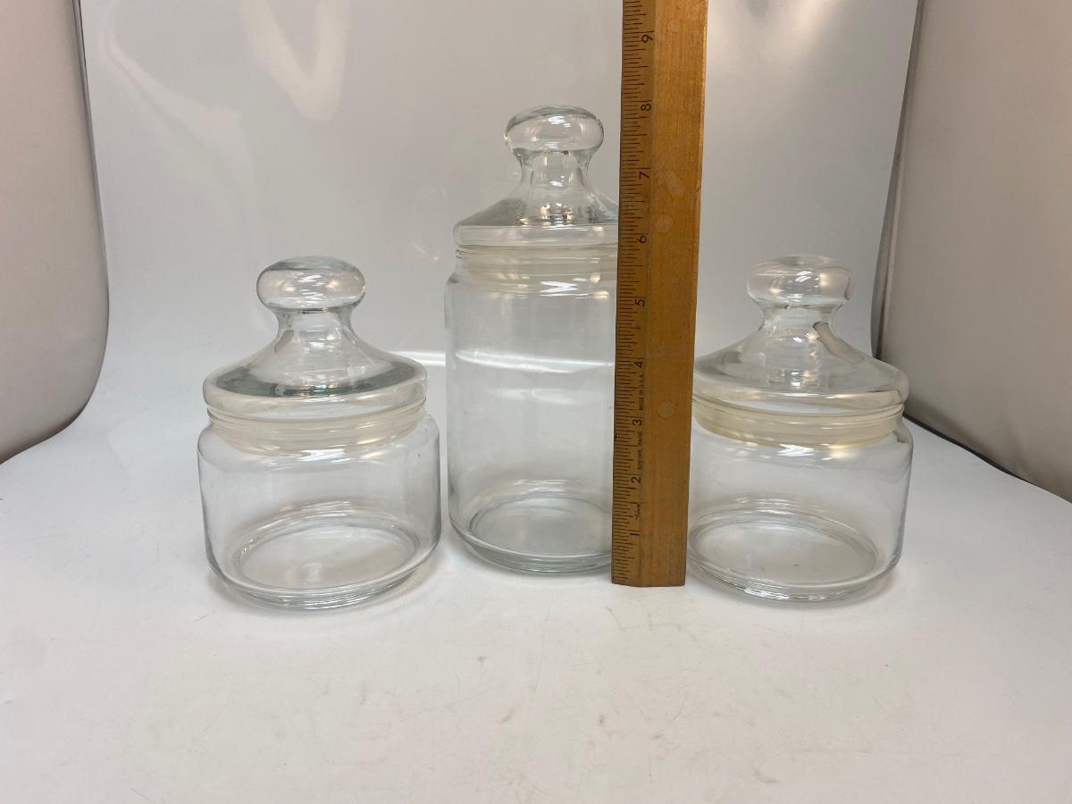 Set of 3 Retro Clear Glass Apothecary Jars Canisters. in good condition. Sealing lids. Two are about 6" and the tall one is about 8" size.