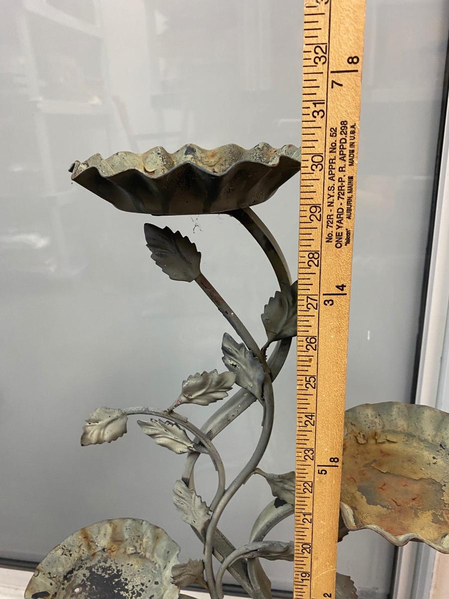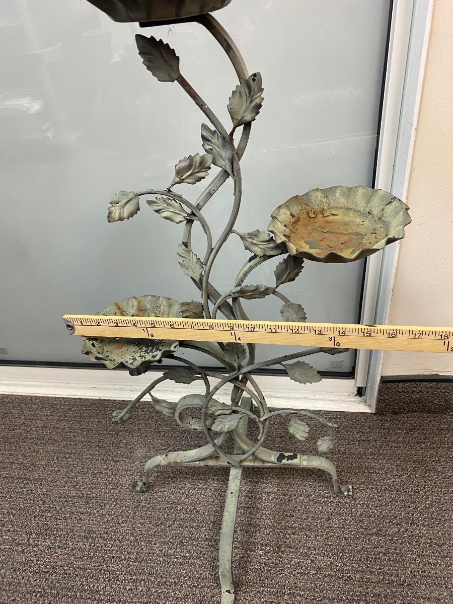 Vintage Three Tier Metal Yard Art Planter Pot Stand Candle Holder. Signs of use. Great for the yard holding small pots or paint and use inside as a pillar candle holder. 30" tall.
