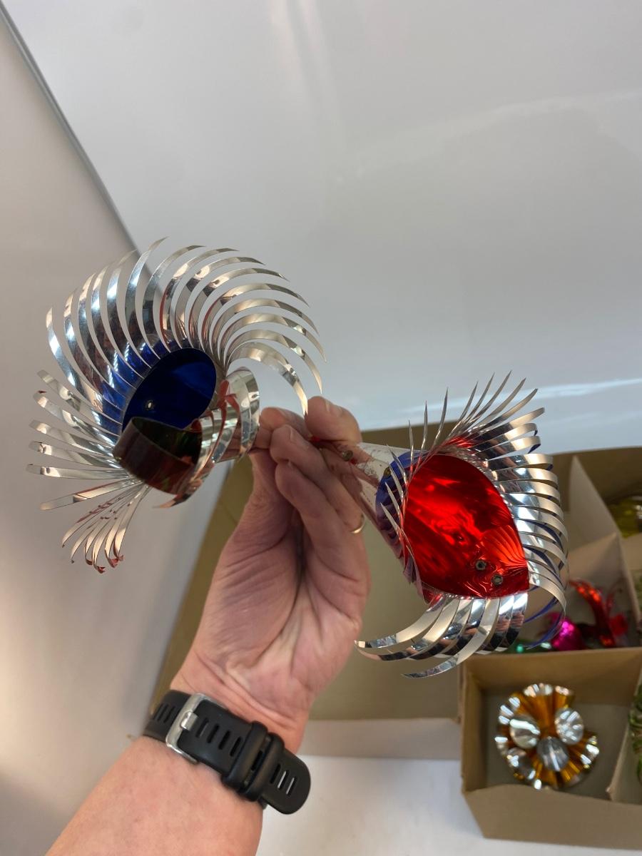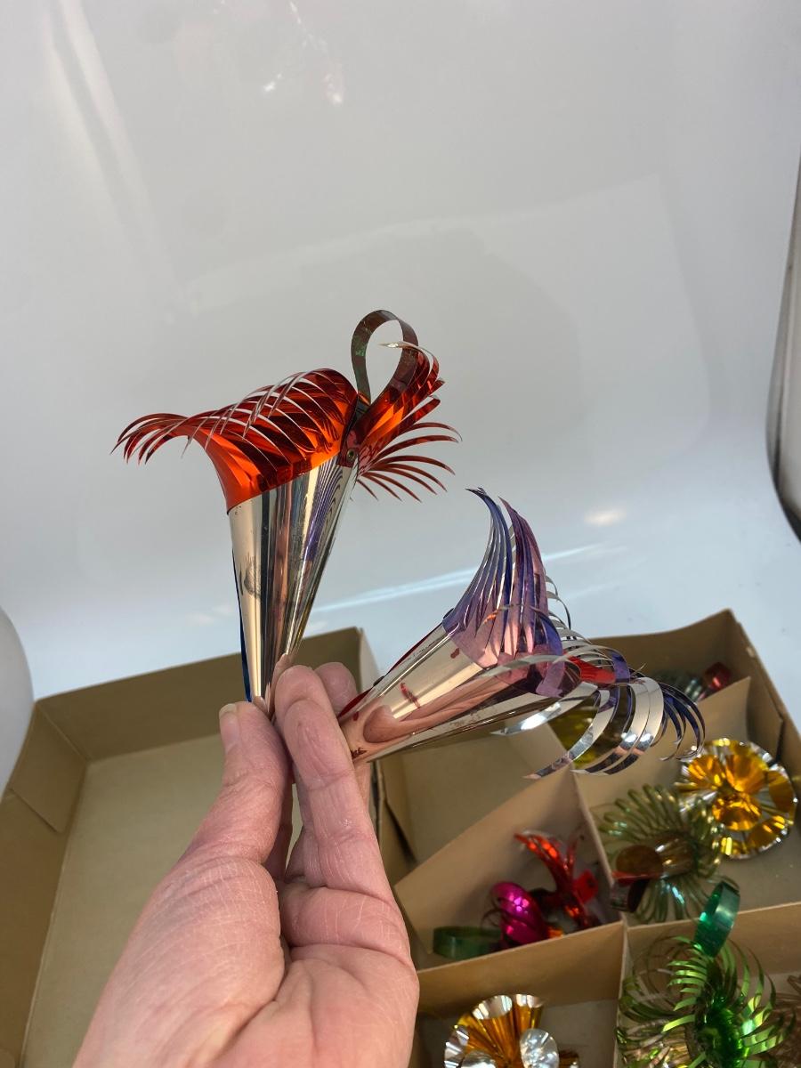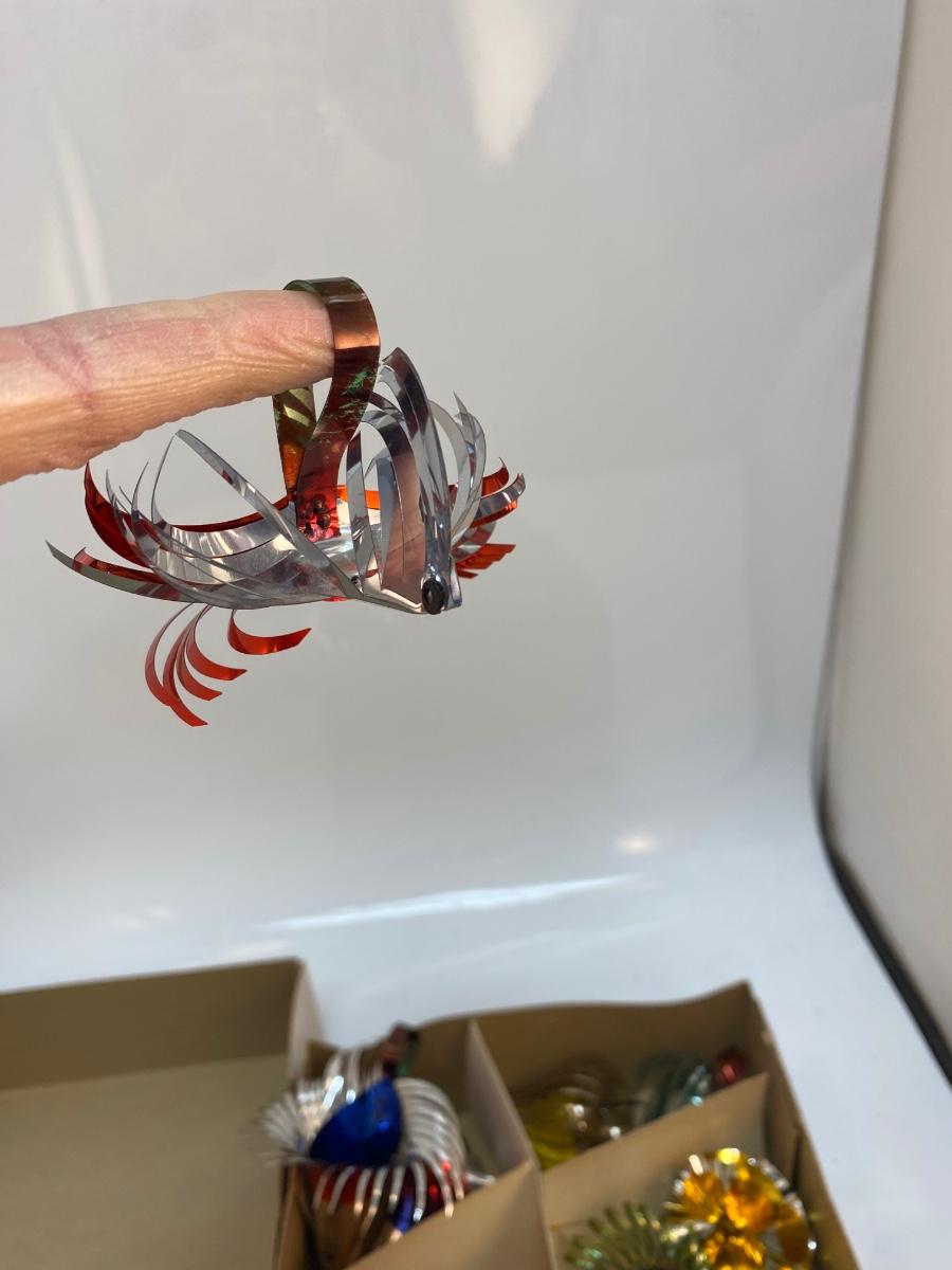 Vintage Colorful Metallic Foil Christmas Tree Holiday Ornaments. In good vintage condition.