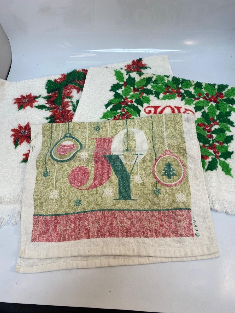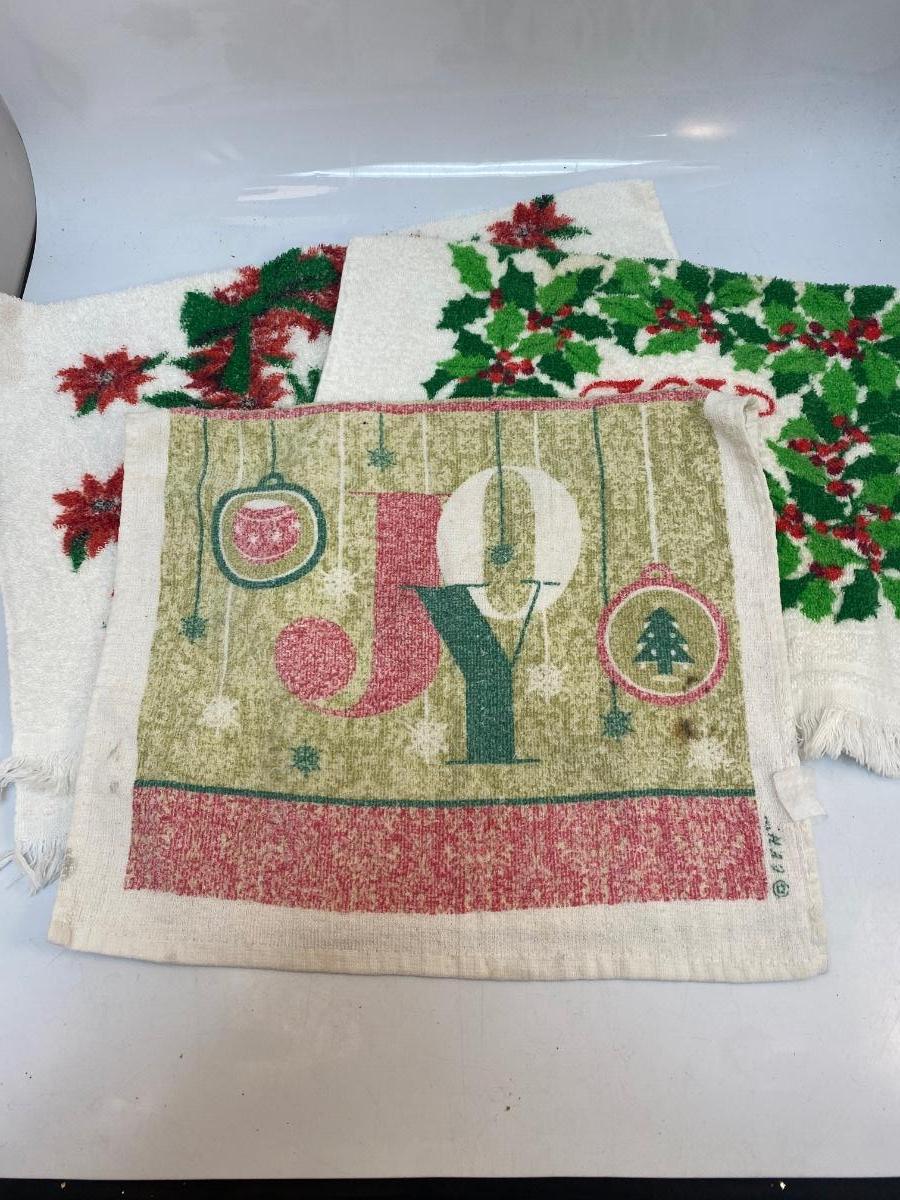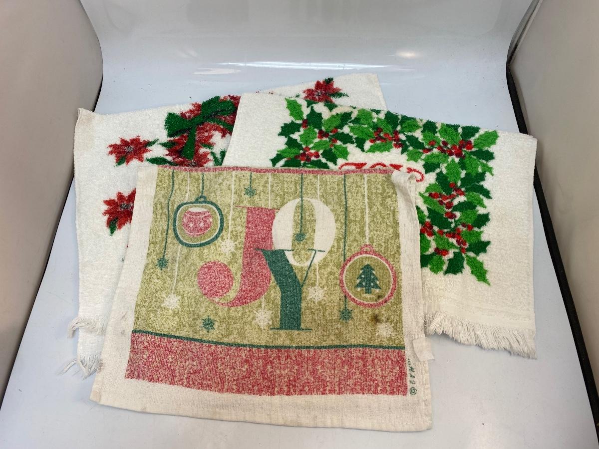 Lot of Three Christmas Holiday Hand Dish Towels. In vintage condition.
