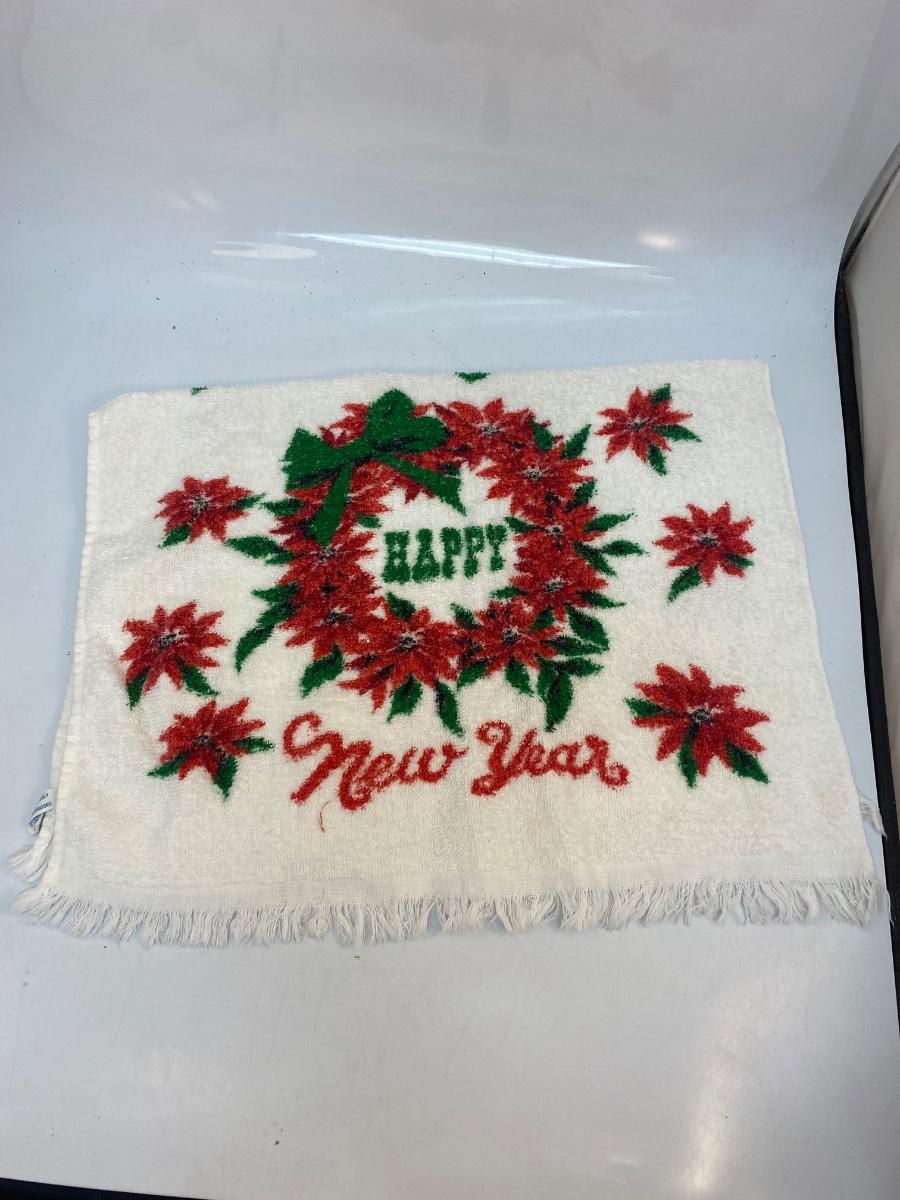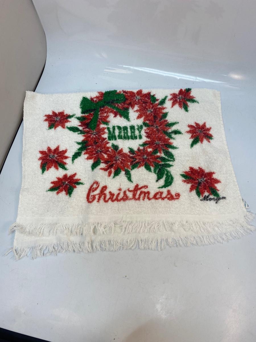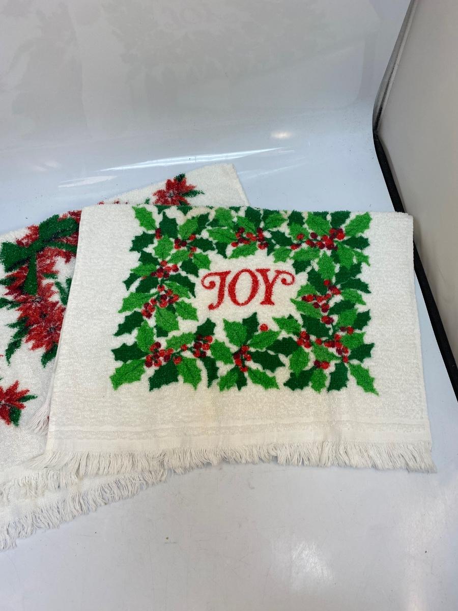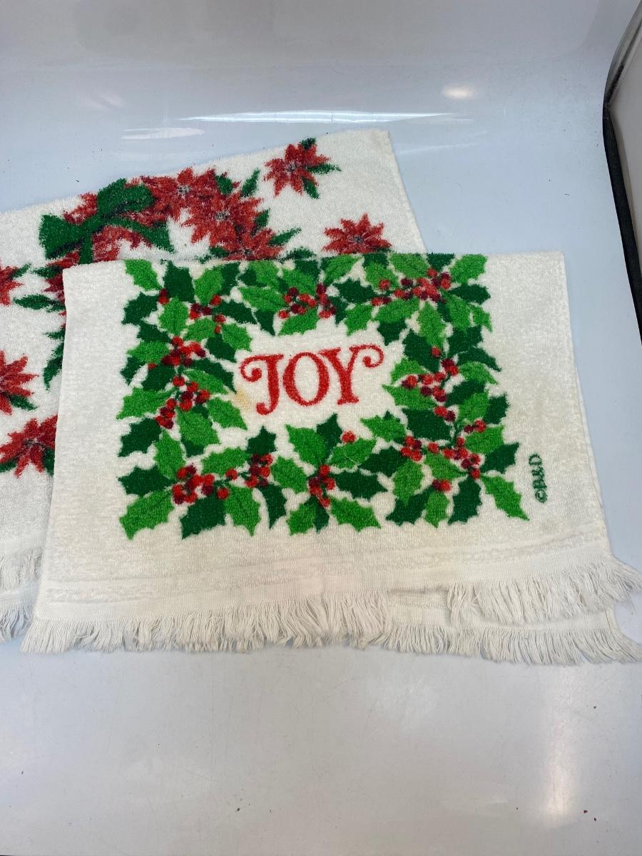 Lot of Three Christmas Holiday Hand Dish Towels. In vintage condition.