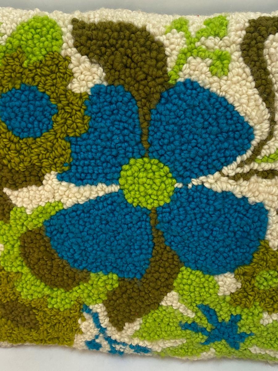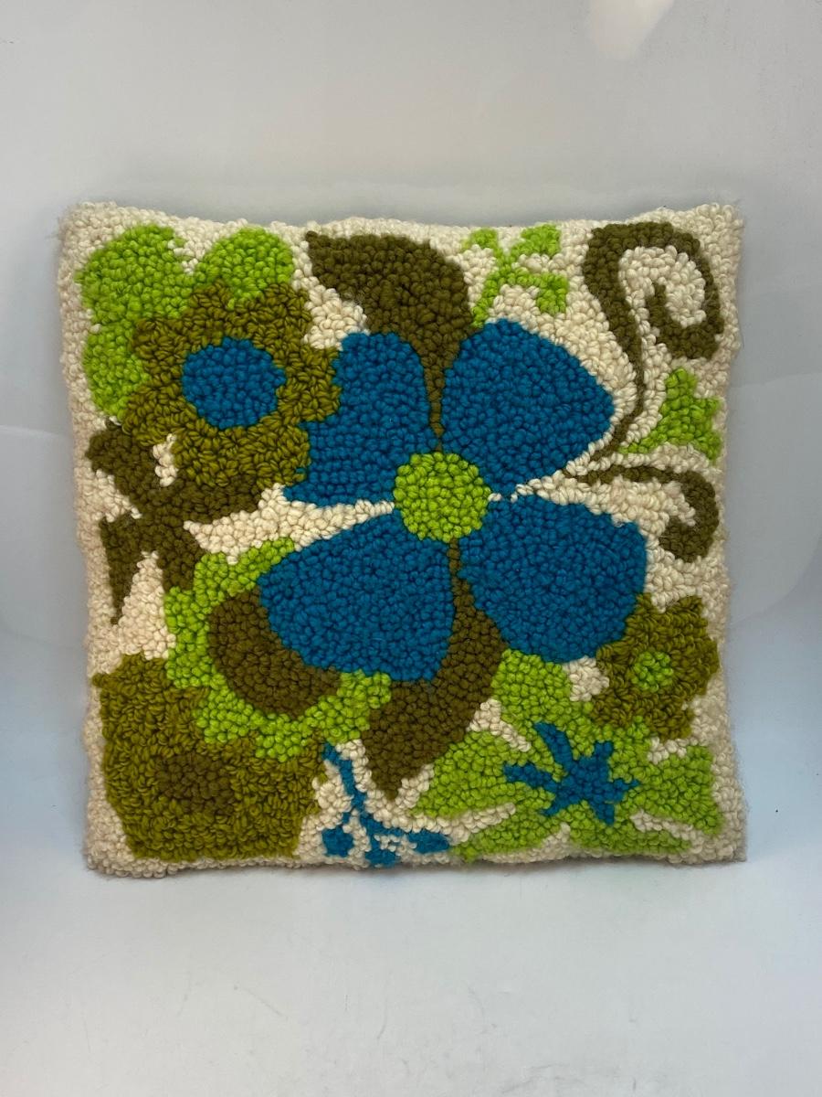 Vintage Funky Retro Blue and Green Flower Yard Art Accent Throw Pillow. In good vintage condition. About 16" size.