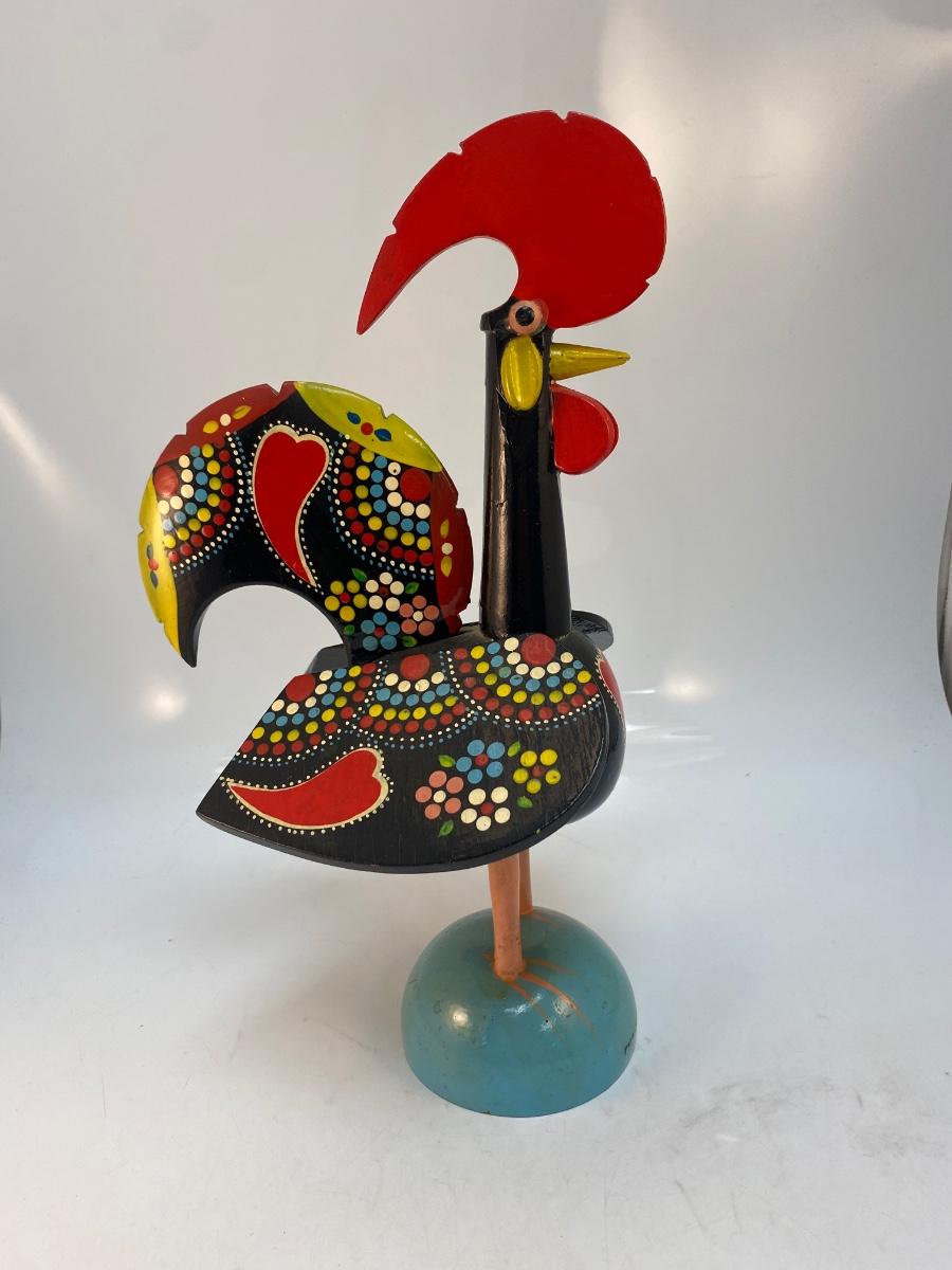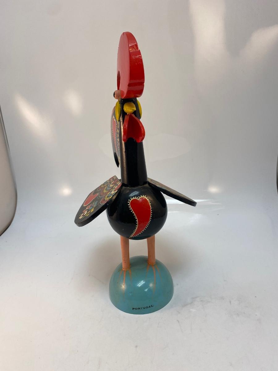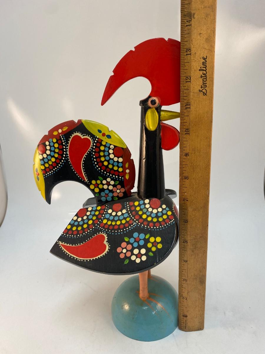 Vintage Made in Portugal Colorfully Painted Wood Rooster Music Box Figurine. in good vintage condition. Displays great. Music player does wind up and work, has an on/off button on bottom. Some light chipping to paint along edges. About 14" size.