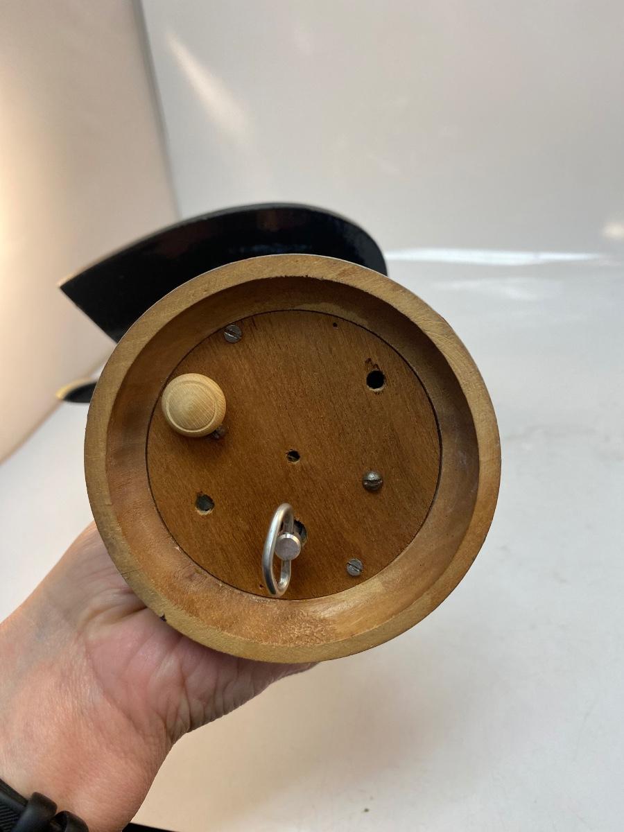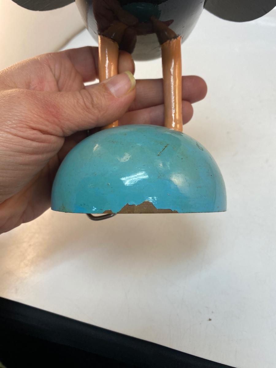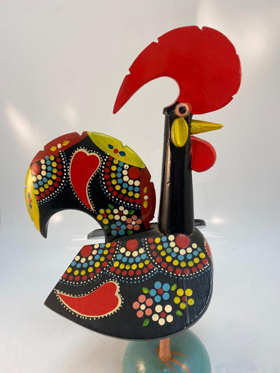 Vintage Made in Portugal Colorfully Painted Wood Rooster Music Box Figurine. in good vintage condition. Displays great. Music player does wind up and work, has an on/off button on bottom. Some light chipping to paint along edges. About 14" size.