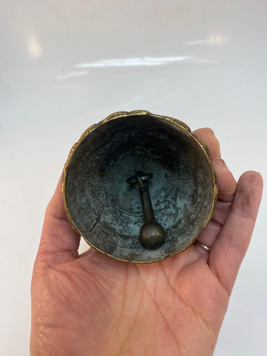 Vintage Antique Brass Figural Bell Fancy Dress Woman. In aged condition. About 4.5" size.