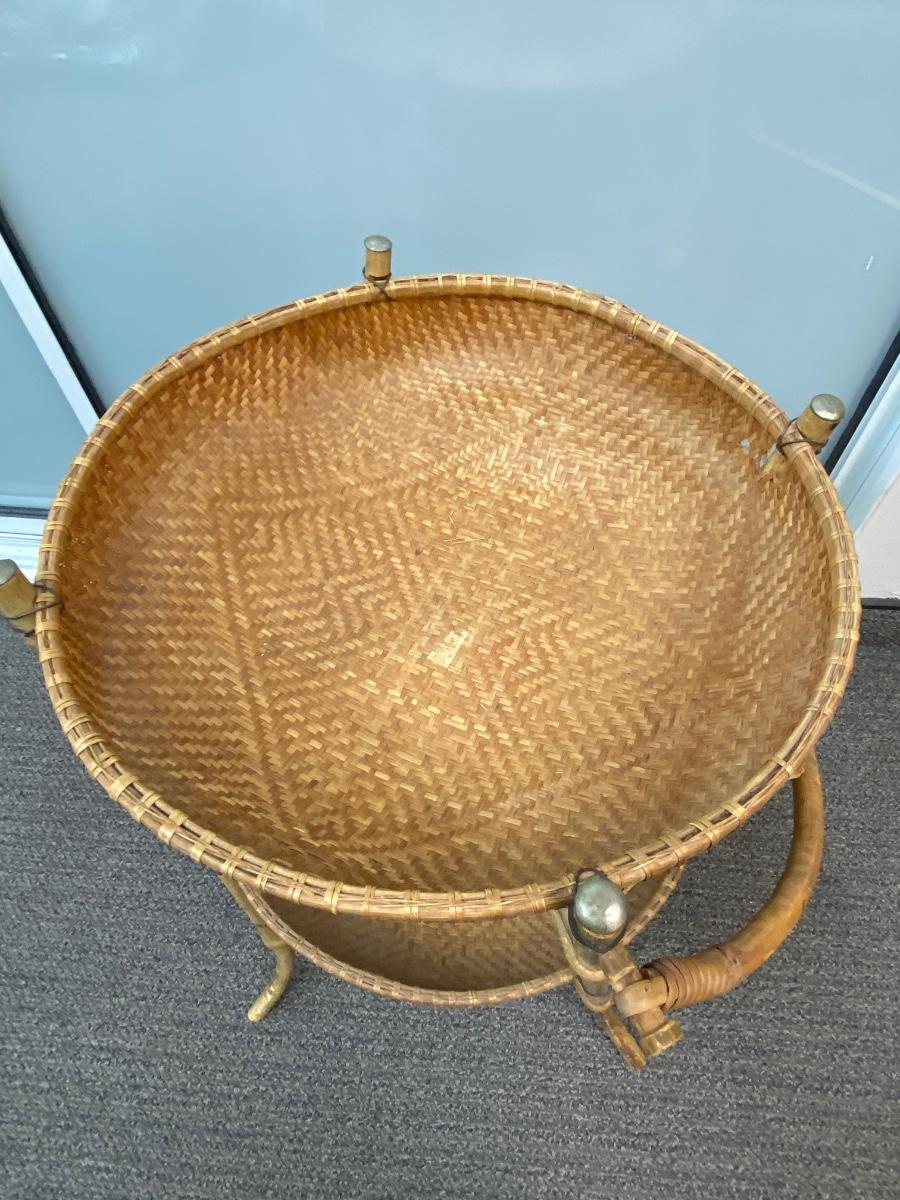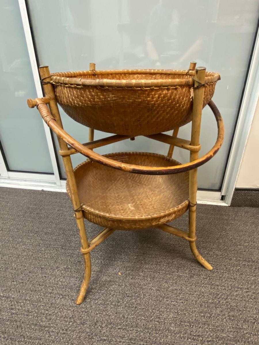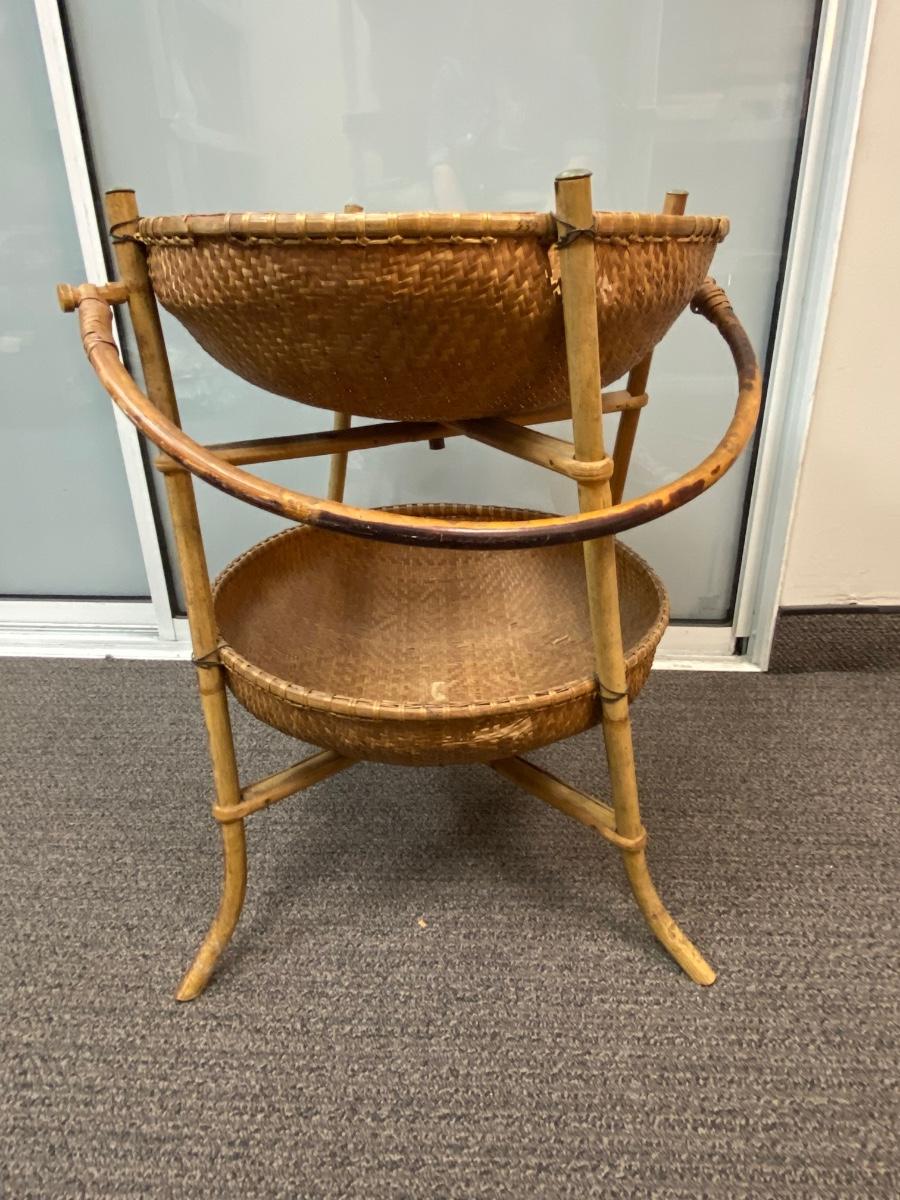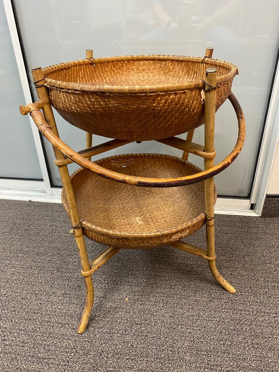Vintage Large Two Tier Dual Bowl Woven Asian Wicker Basket Storage Organizer Stand