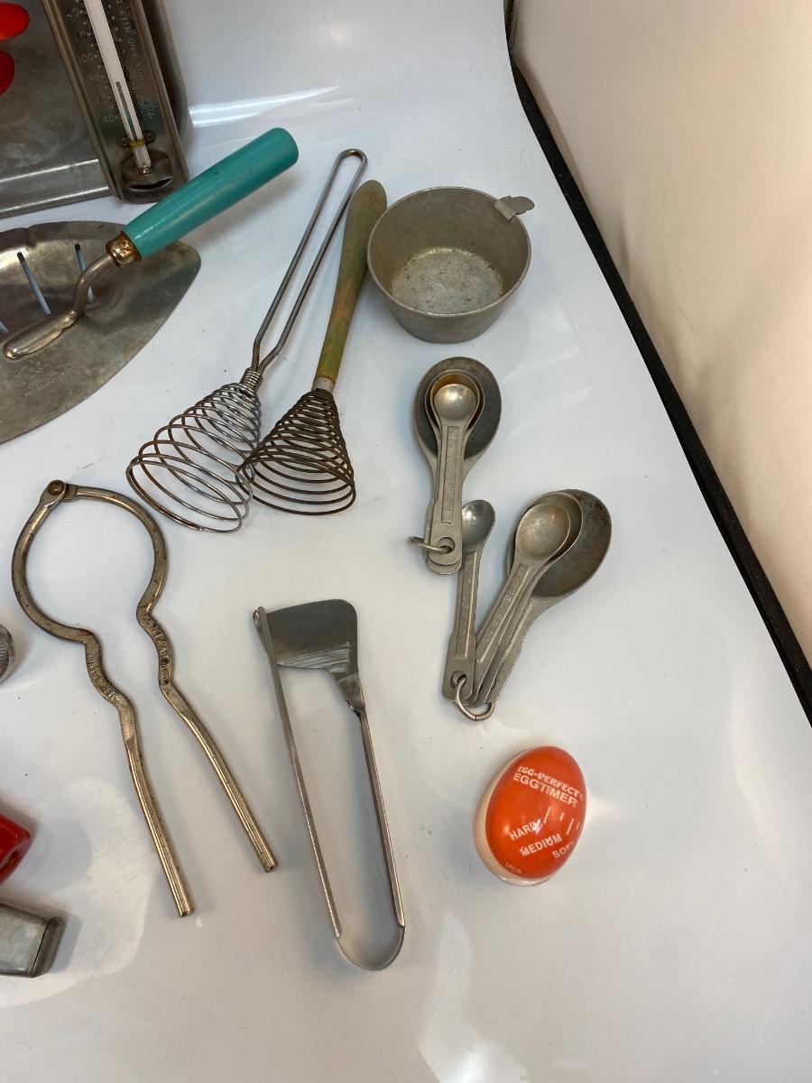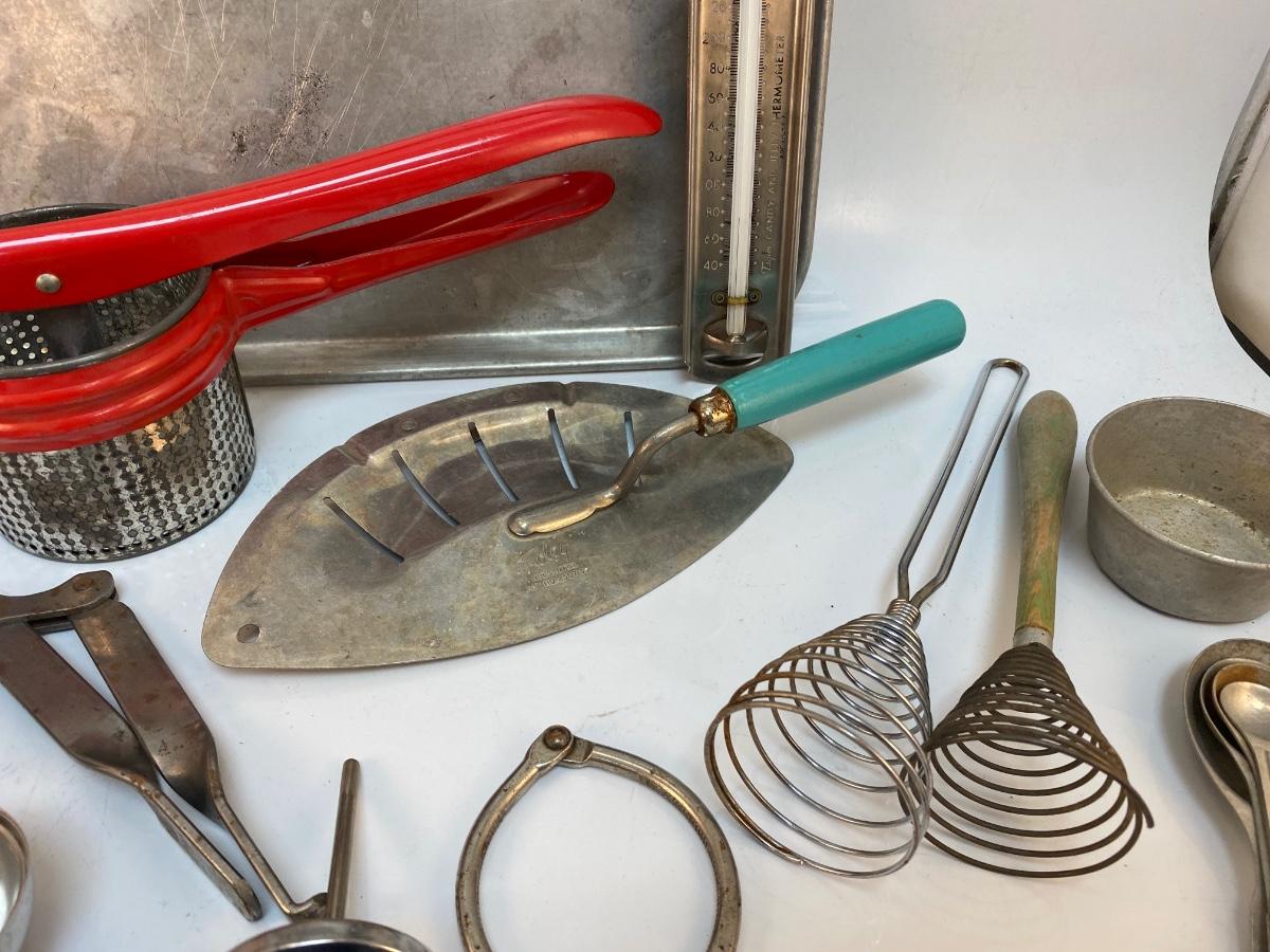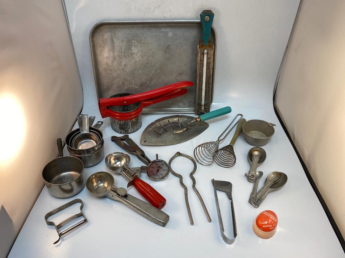 Vintage Metal Kitchen Hand Tool Lot Scoops Whisks Measuring Cups & More