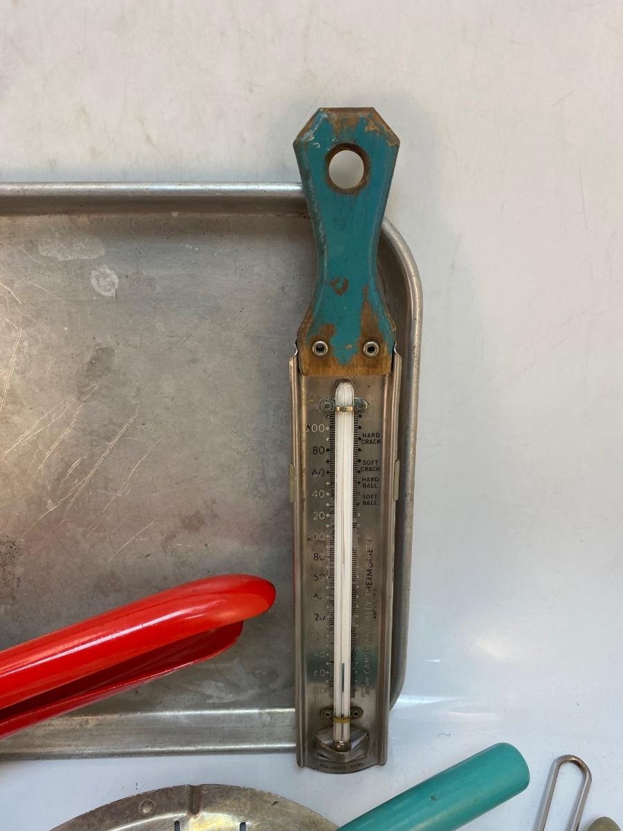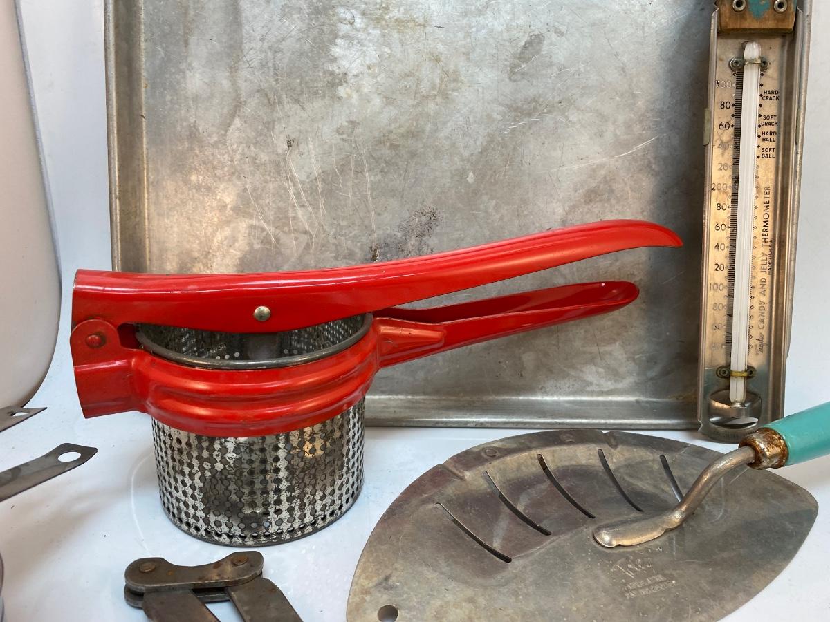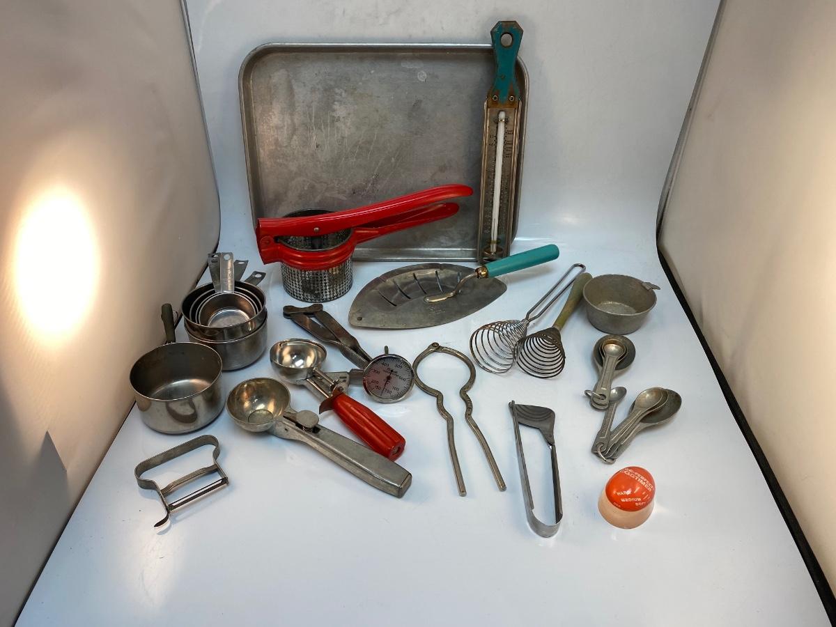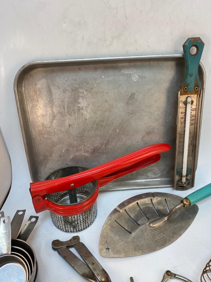 Vintage Metal Kitchen Hand Tool Lot Scoops Whisks Measuring Cups & More