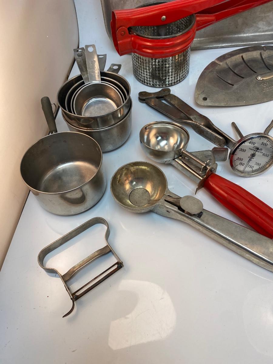 Vintage Metal Kitchen Hand Tool Lot Scoops Whisks Measuring Cups & More. In vintage condition. Great for use or display.