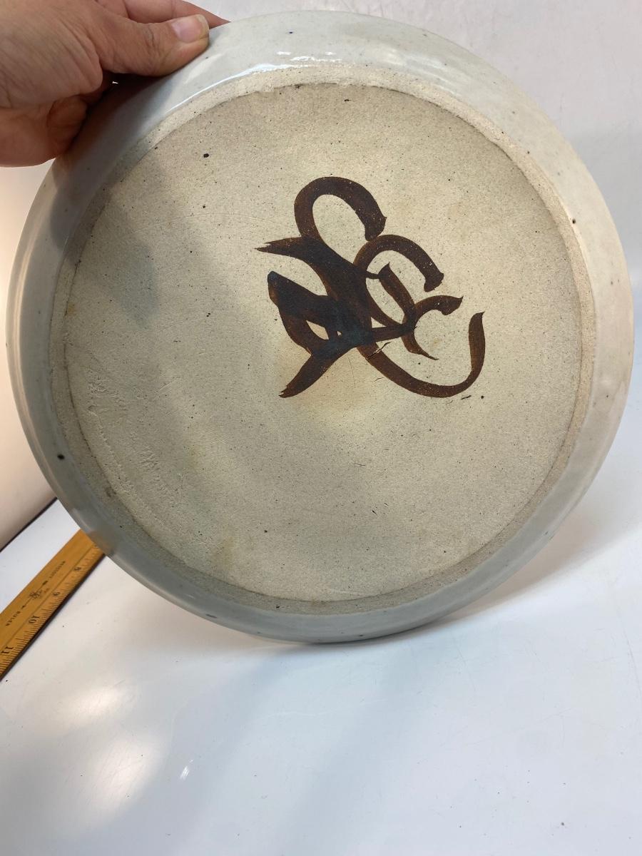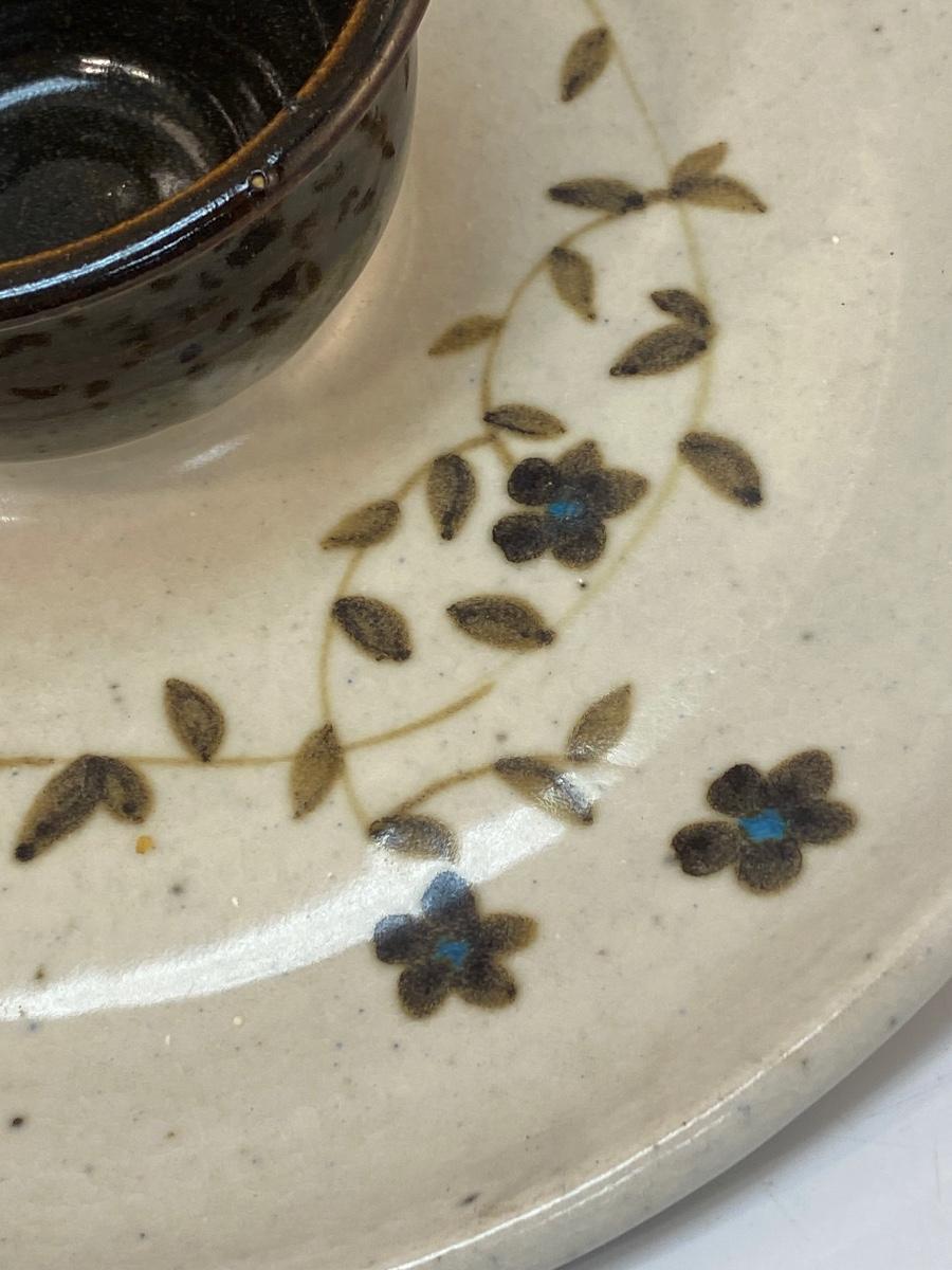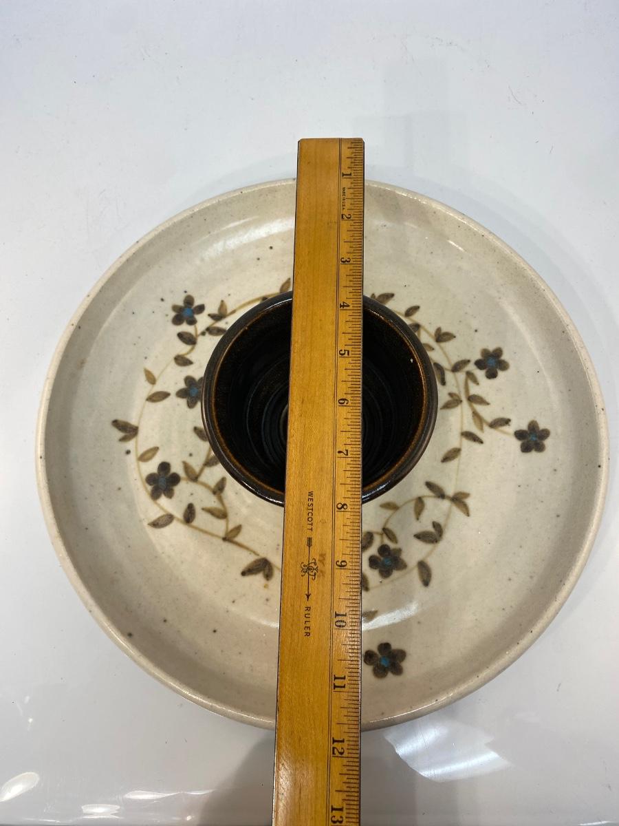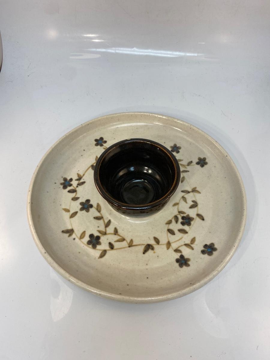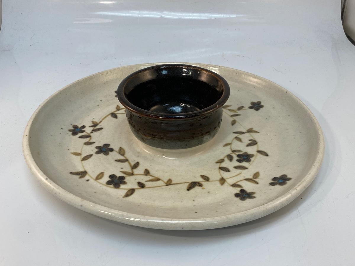 Artist Signed Chip & Dip Stoneware Pottery Dish Tray Ceramic Hand-Thrown Flowers Brown
