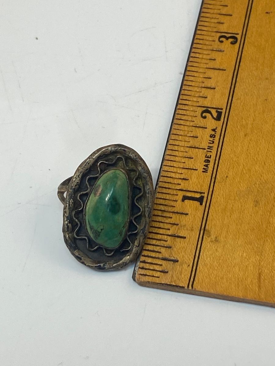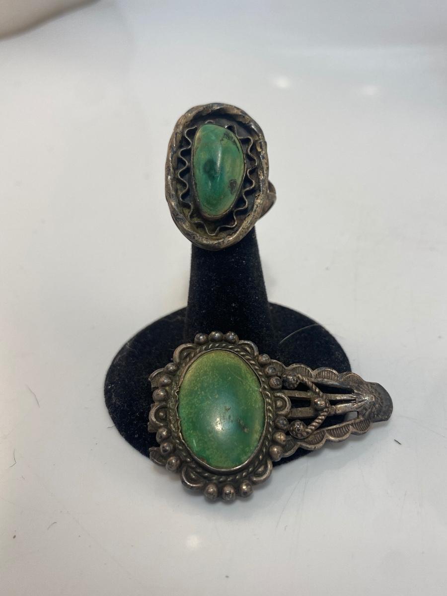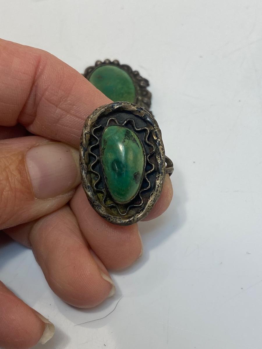 Vintage Southwestern Old Pawn Sterling Silver Green Agate Turquoise Jewelry For Repair Repurpose. Both pieces show age and need to be repaired or repurposed. The ring is stamped sterling inside it looks like. See photos.
