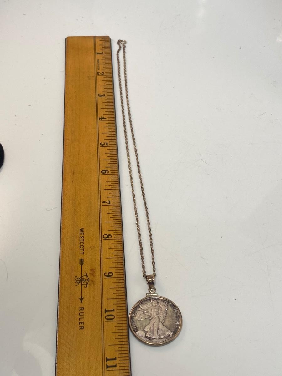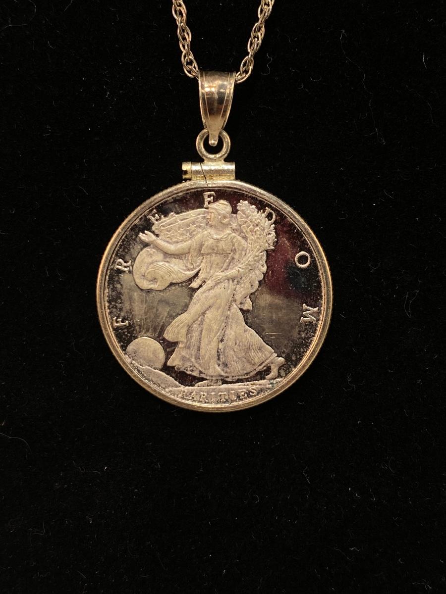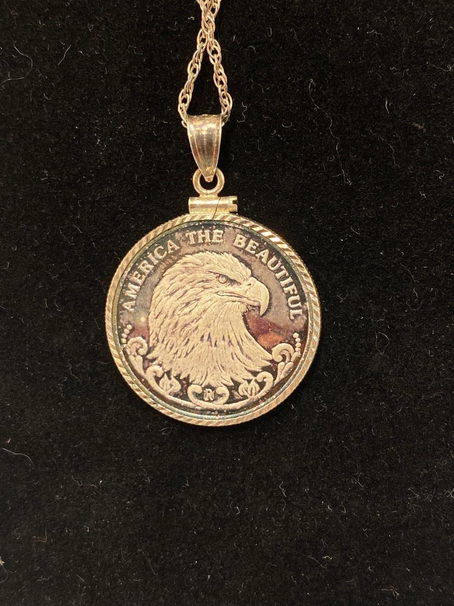 Silver Tone Double Sided America the Beautiful Bald Eagle Walking Liberty Freedom Coin Medallion Pendant Charm Necklace. In good condition. Lightweight. No sterling markings. About 1" size medallion. Not an actual monetary coin, replica reproduction. Chain is about 9" length.