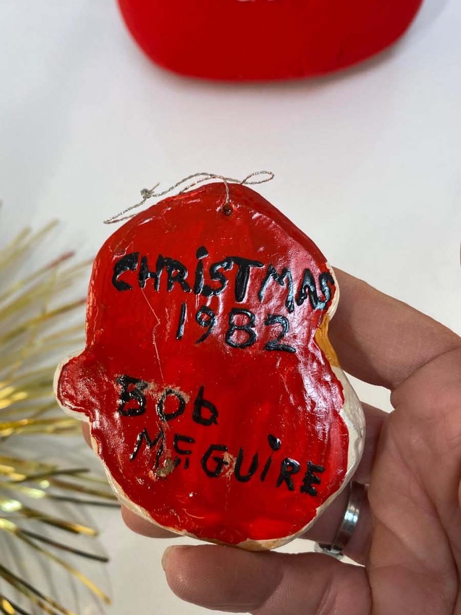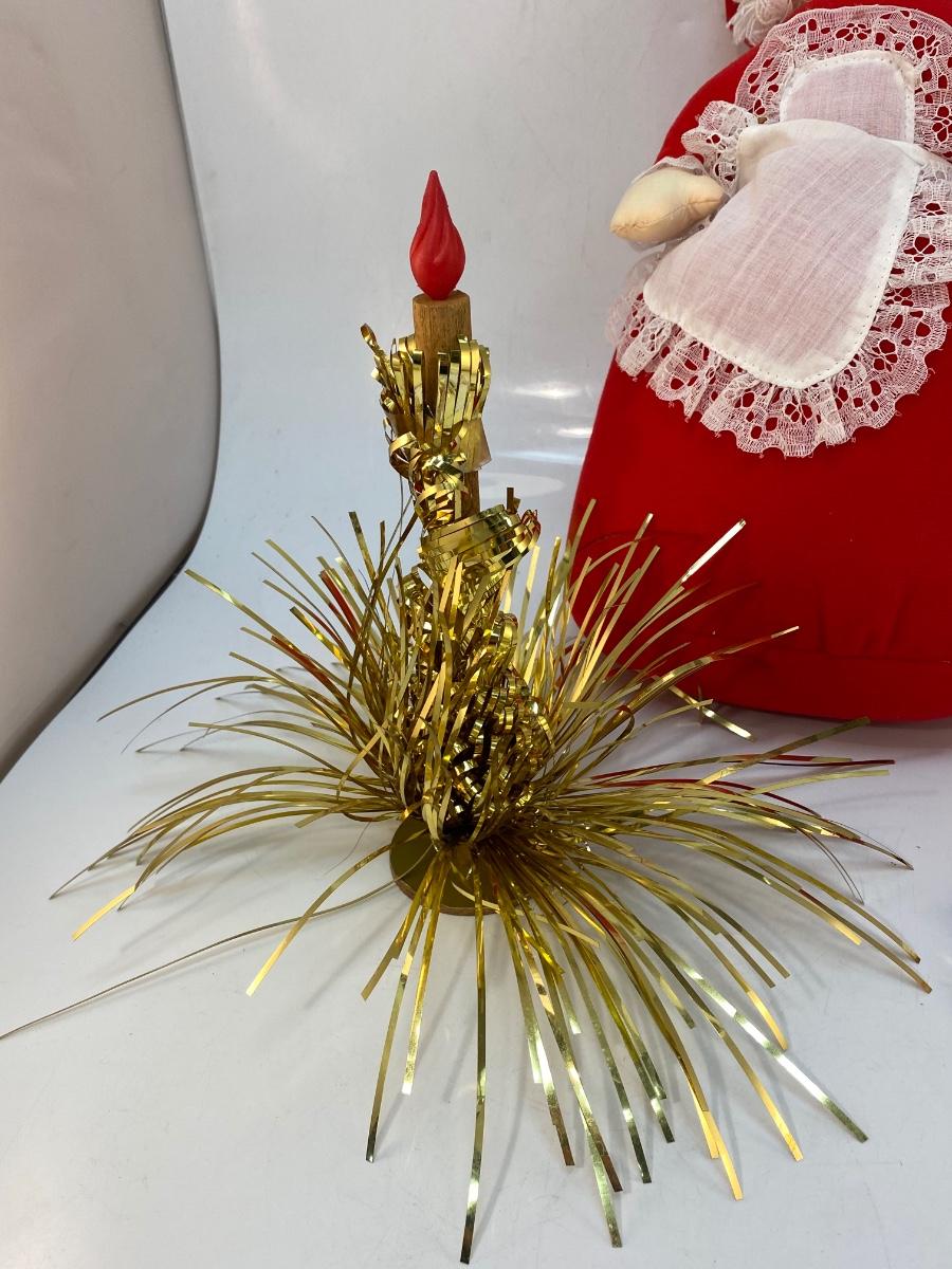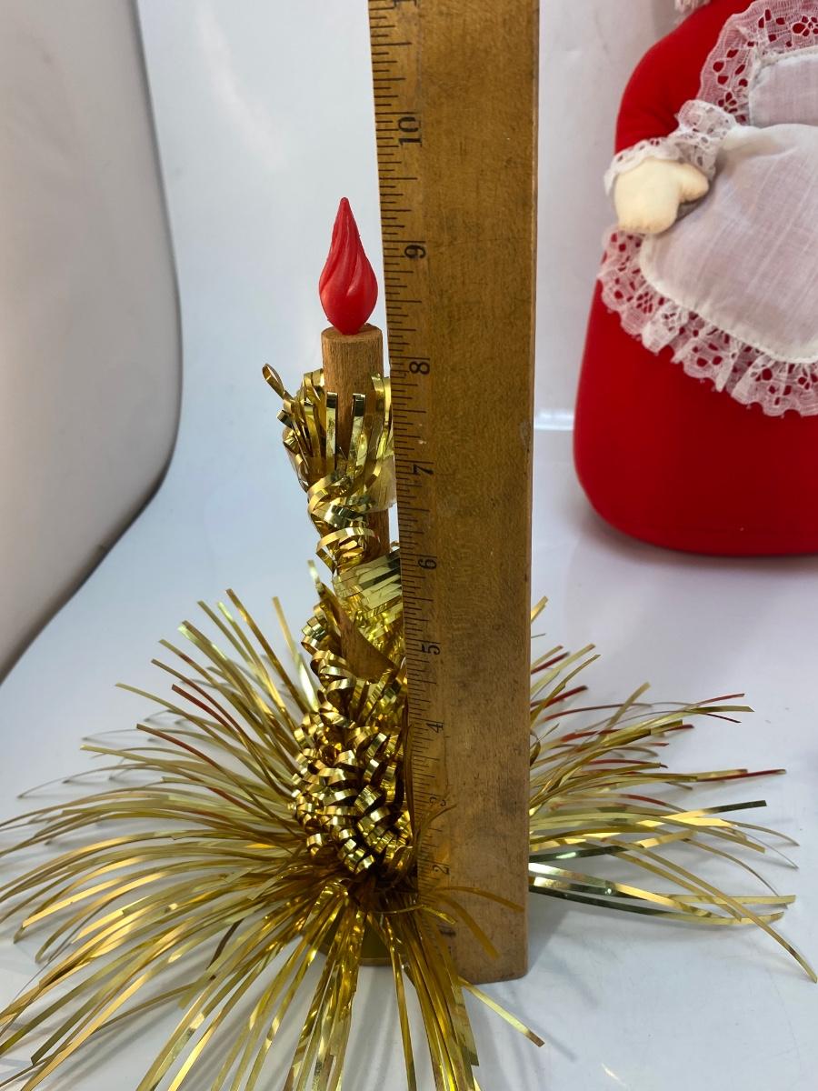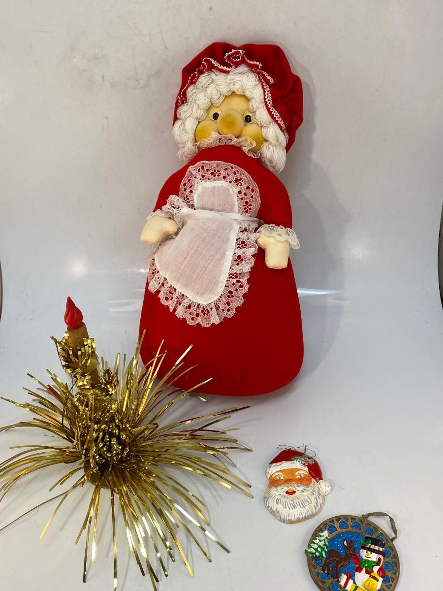 Miscellaneous Christmas Holiday Retro Decor Plush Mrs Claus Gold Foil Candle and Two Hand Panted Ornaments. Fair conditions.