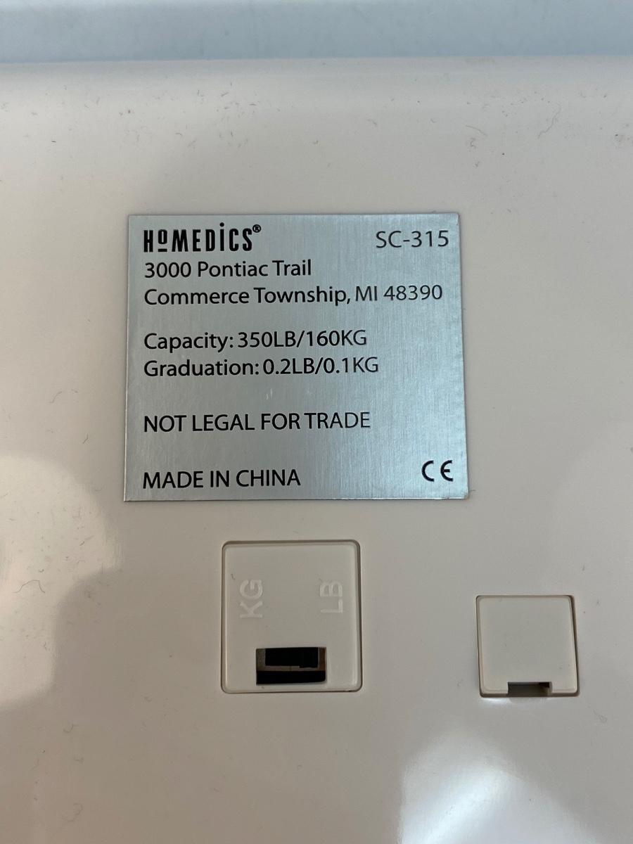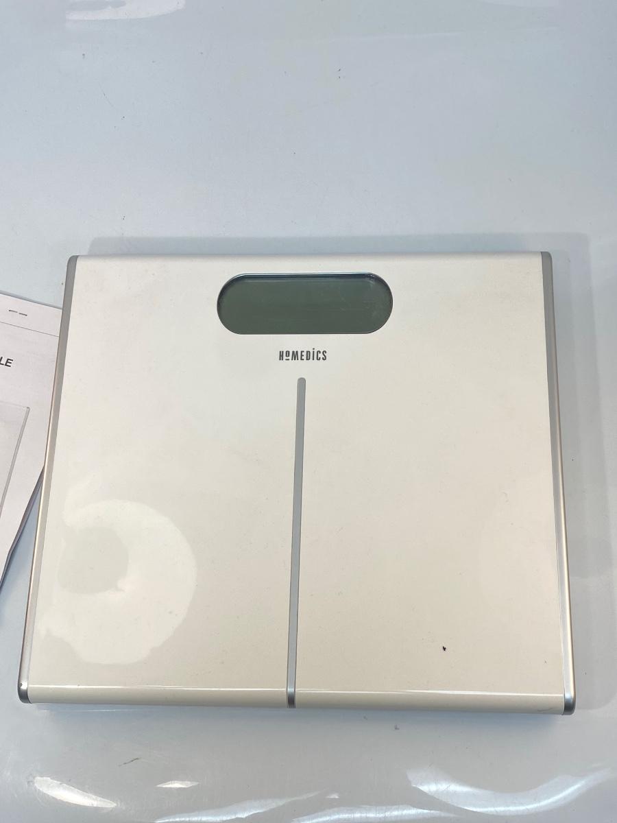 White HoMedics Digital Bathroom Scale with Manual 350lb Capacity. Looks to be in good condition. Takes a watch style battery. Untested, needs battery.