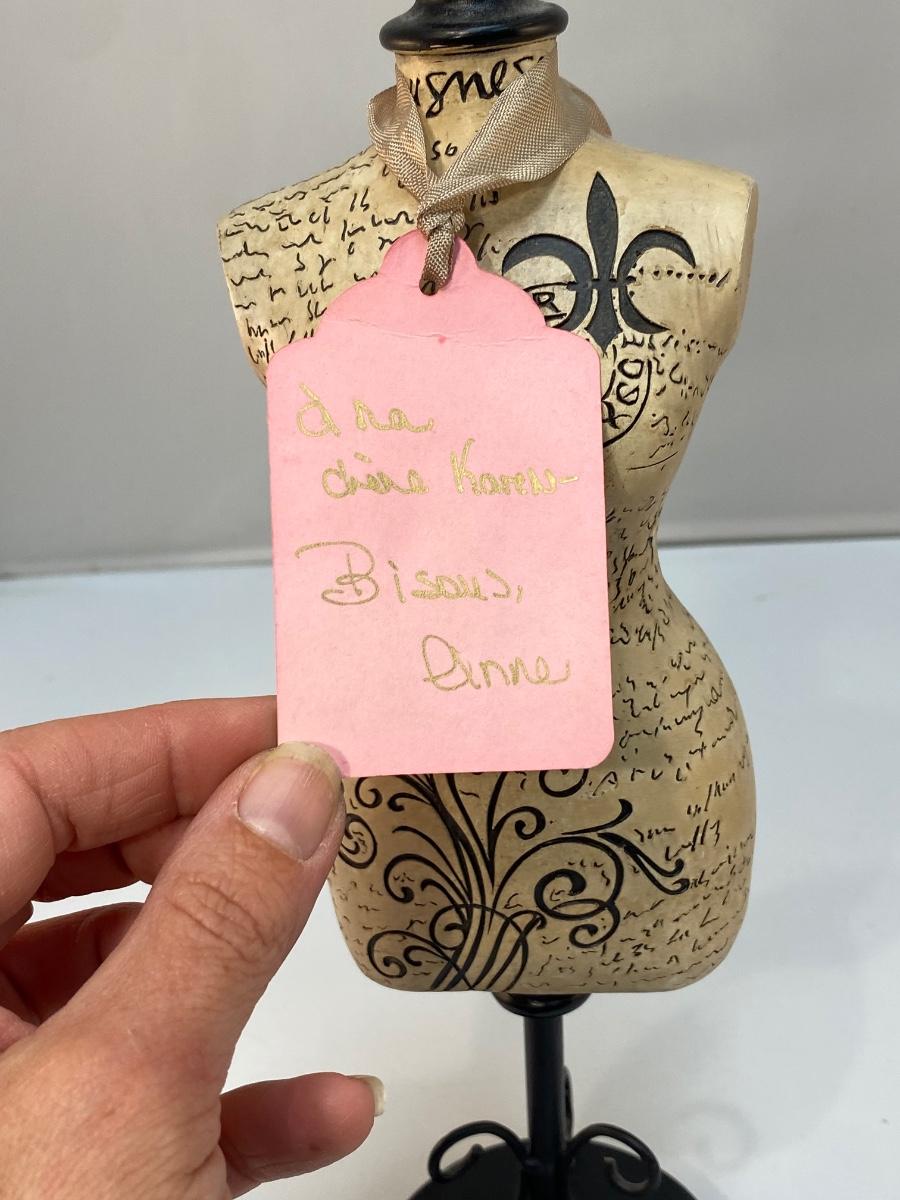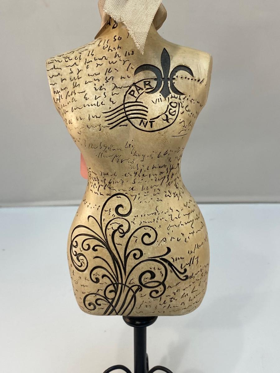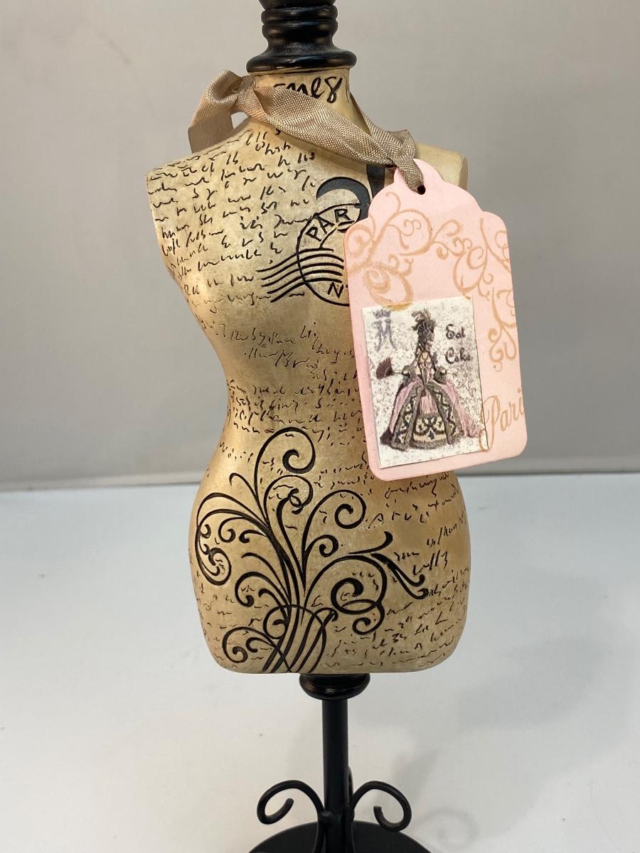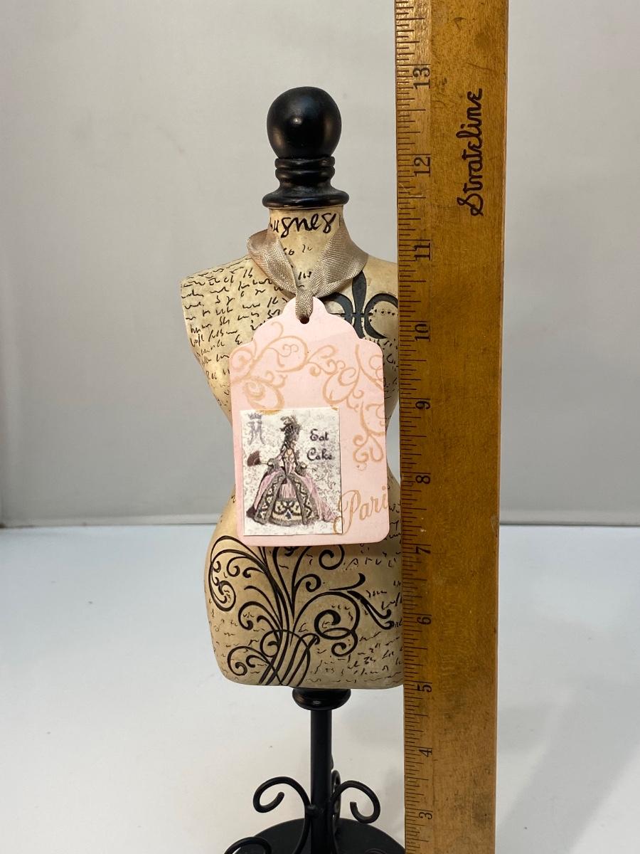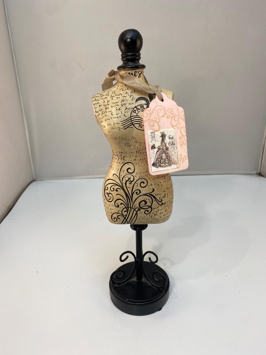 Shabby Chic Paris Fashion Jewelry Necklace Holder Miniature Dress Form Mannequin Bust. In good condition. Base is a little dusty and needs to be cleaned. Looks like it was a gift with a matching gift hang tag. Almost 13" tall.