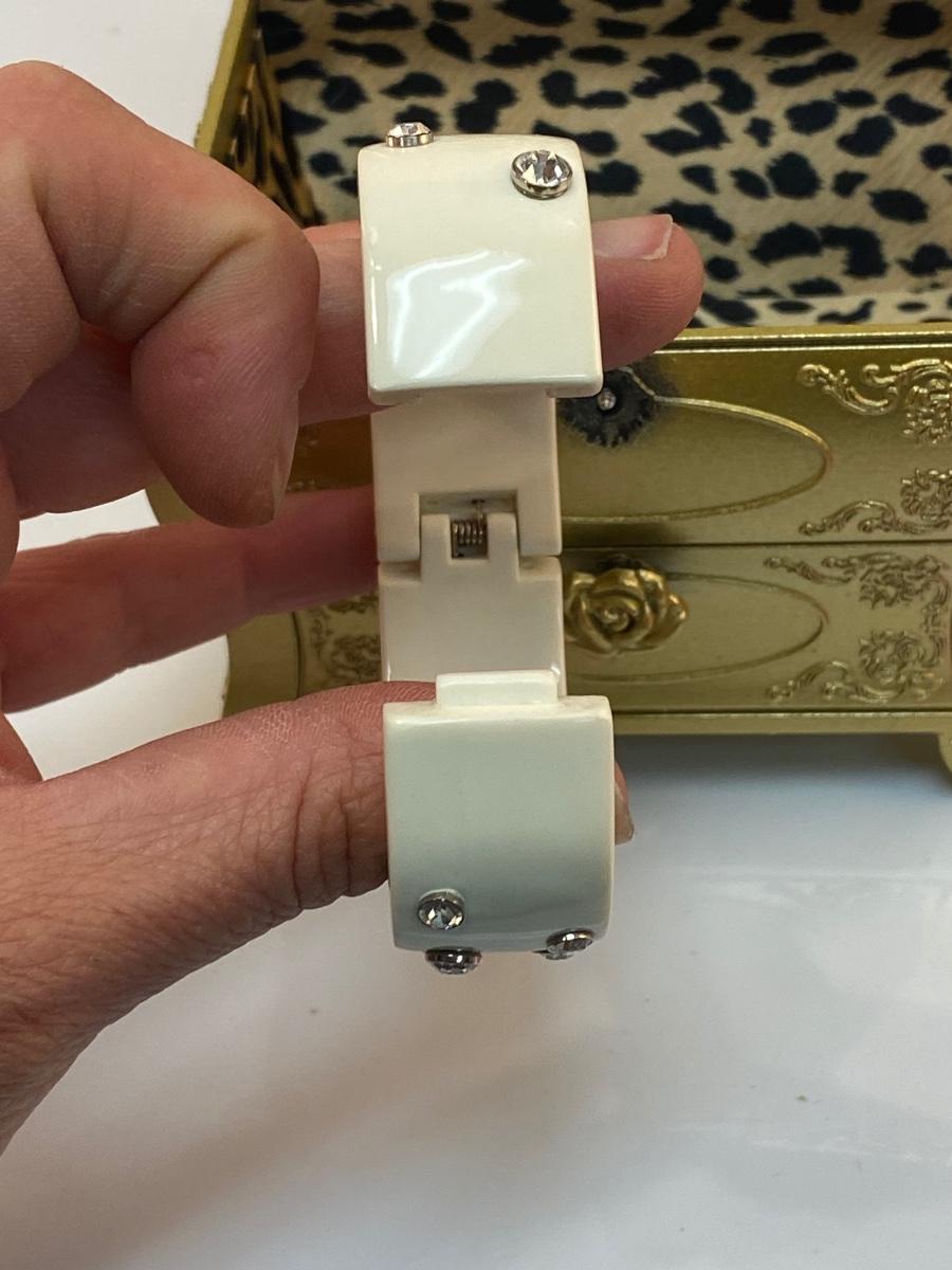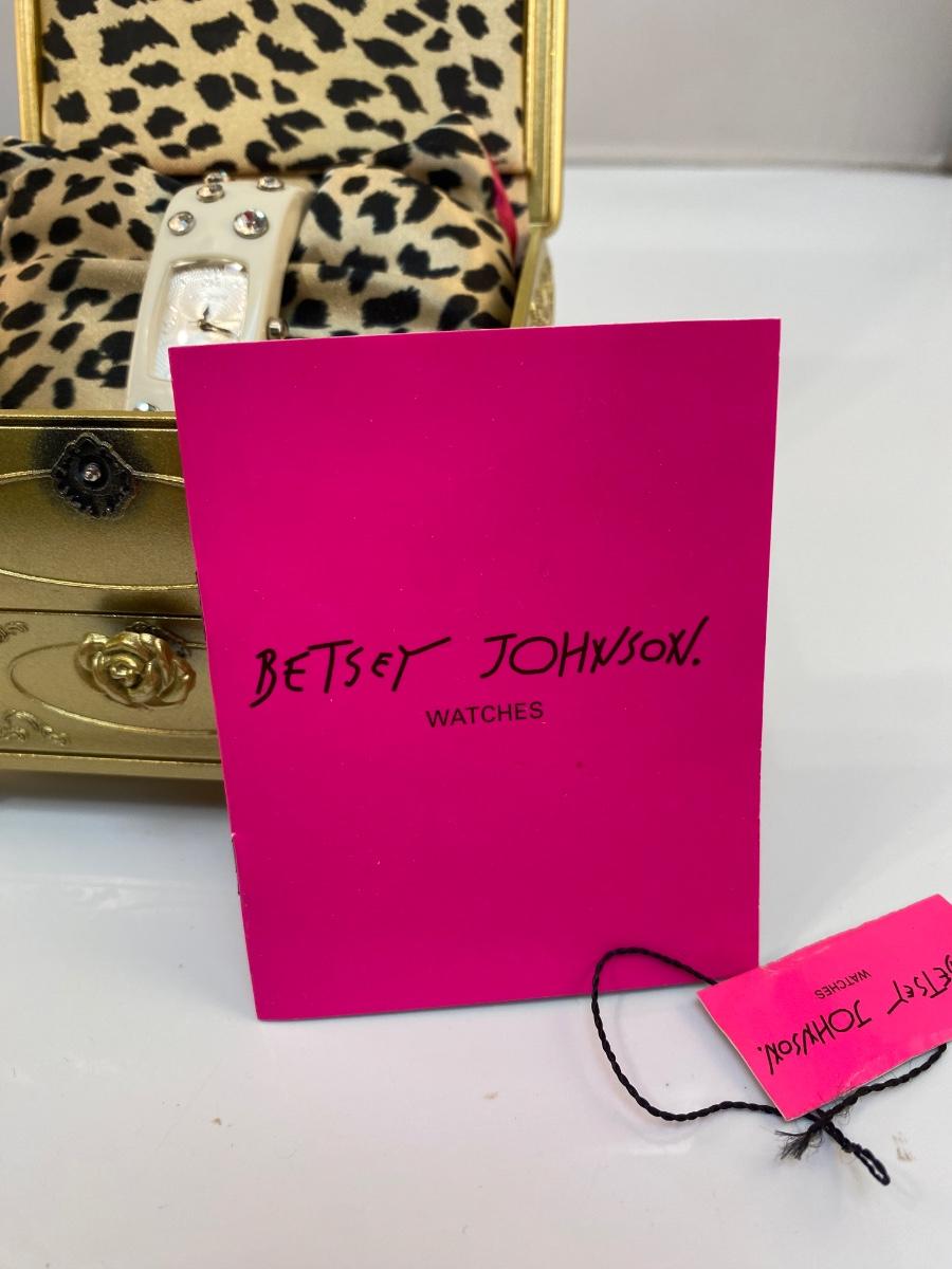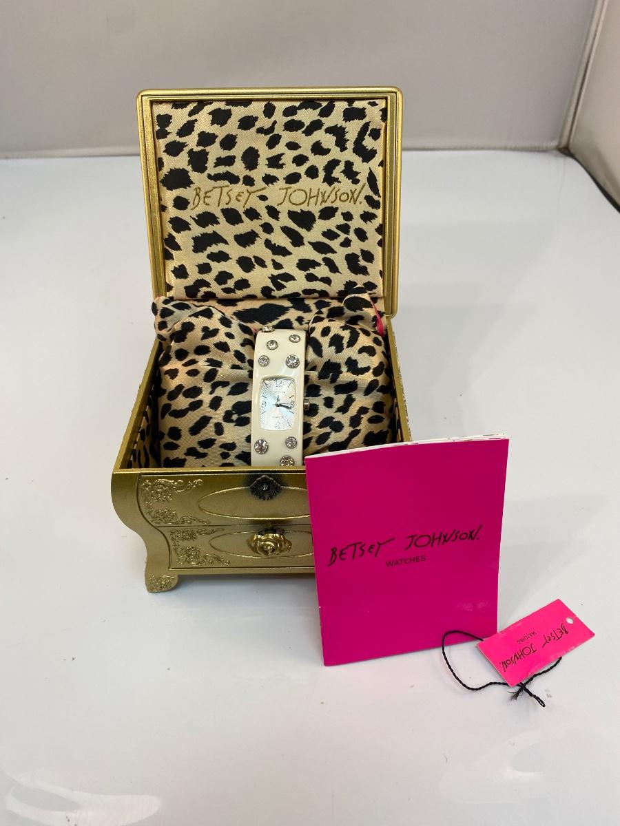 Retro Betsy Johnson White Hinged Bangle Style Watch with Rhinestones in Cute Gold Box. Currently not running but probably just in need of new battery. Box is missing a knob.