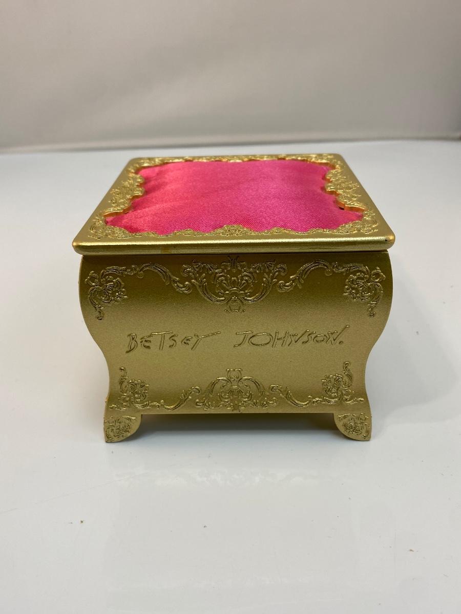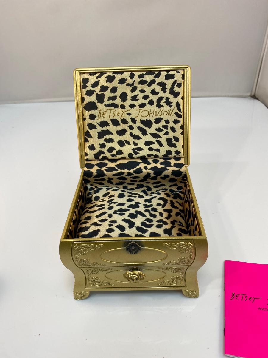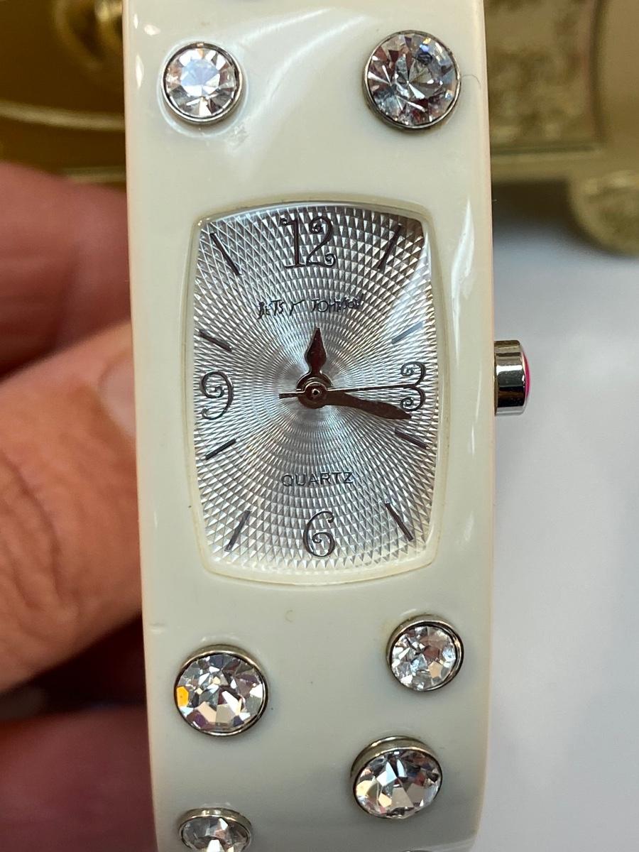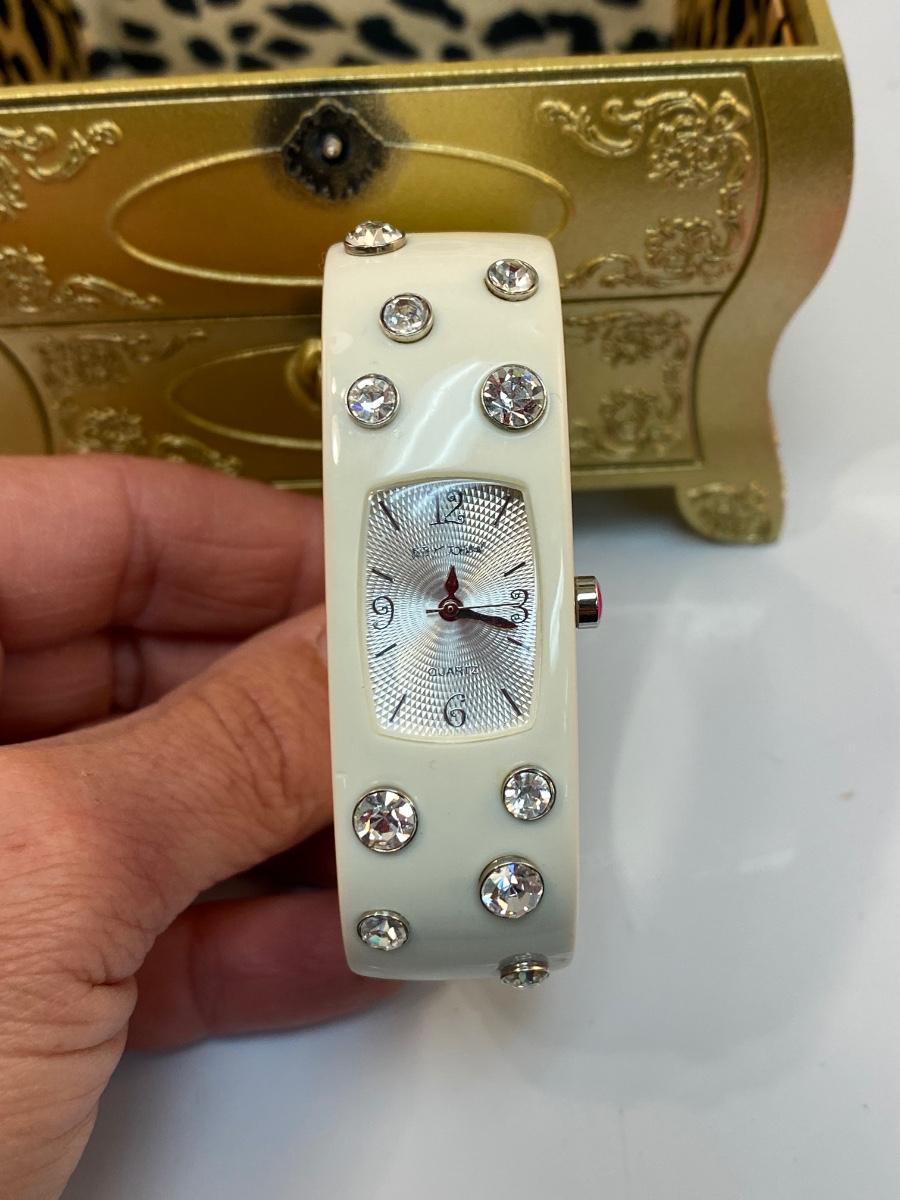 Retro Betsy Johnson White Hinged Bangle Style Watch with Rhinestones in Cute Gold Box. Currently not running but probably just in need of new battery. Box is missing a knob.