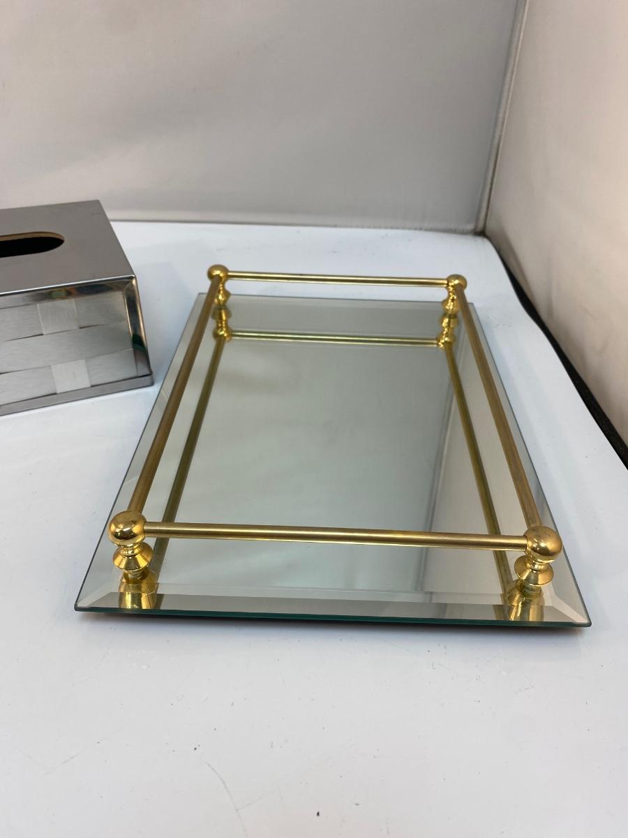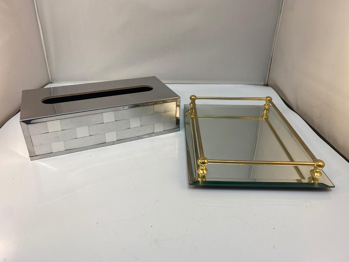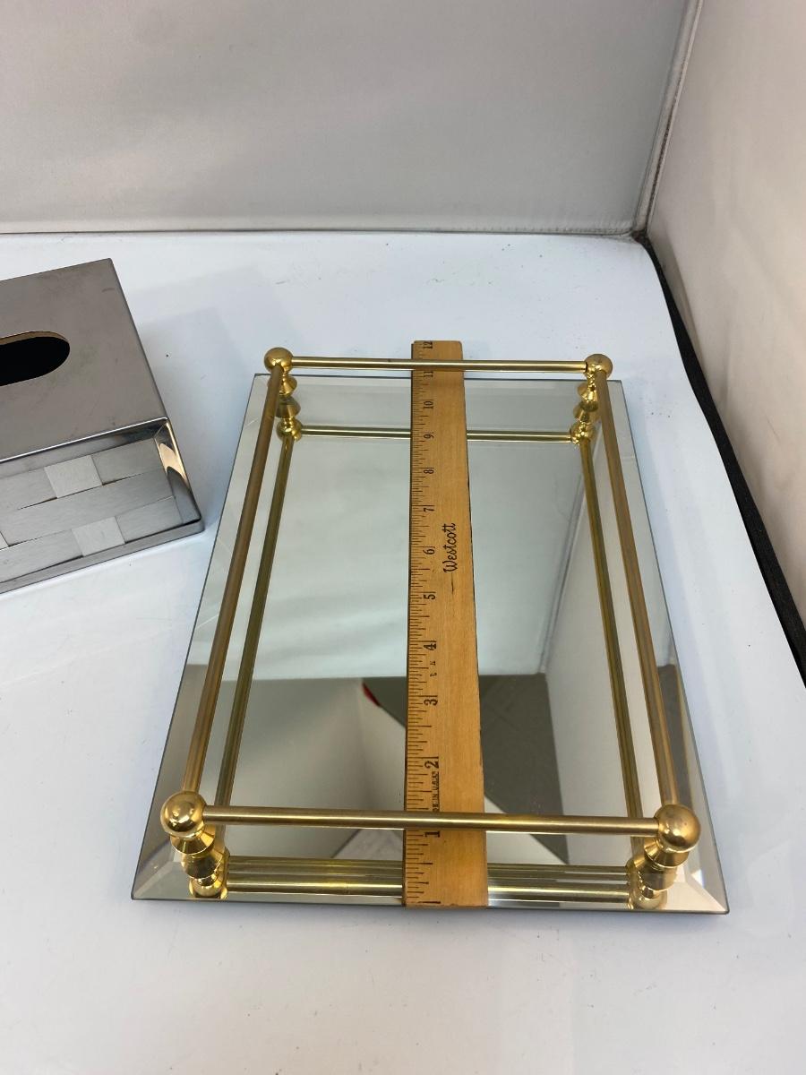 Vintage Mirrored Silver Tone Kleenex Box Cover and Perfume Vanity Tray with Gold Brass Rail