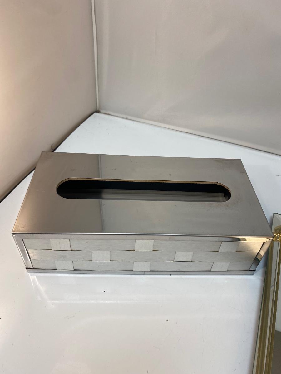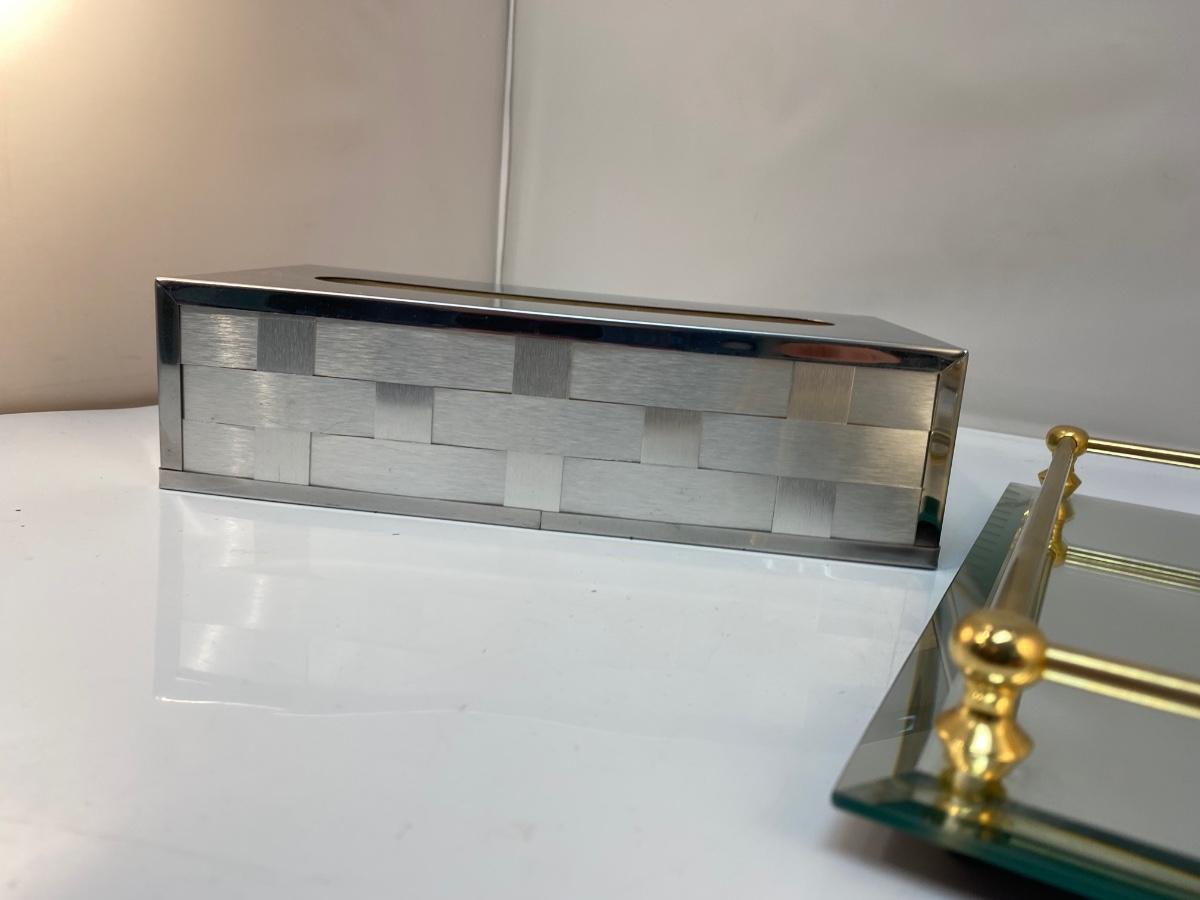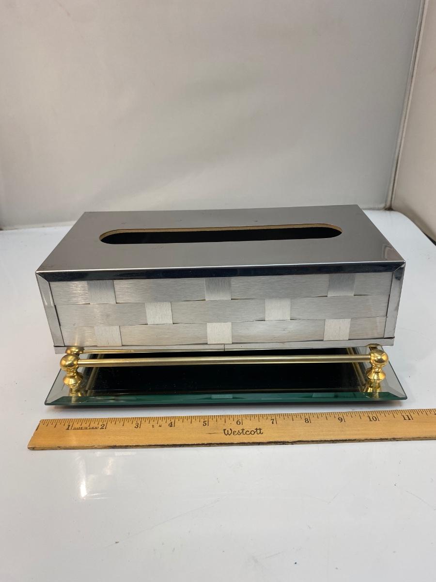Vintage Mirrored Silver Tone Kleenex Box Cover and Perfume Vanity Tray with Gold Brass Rail