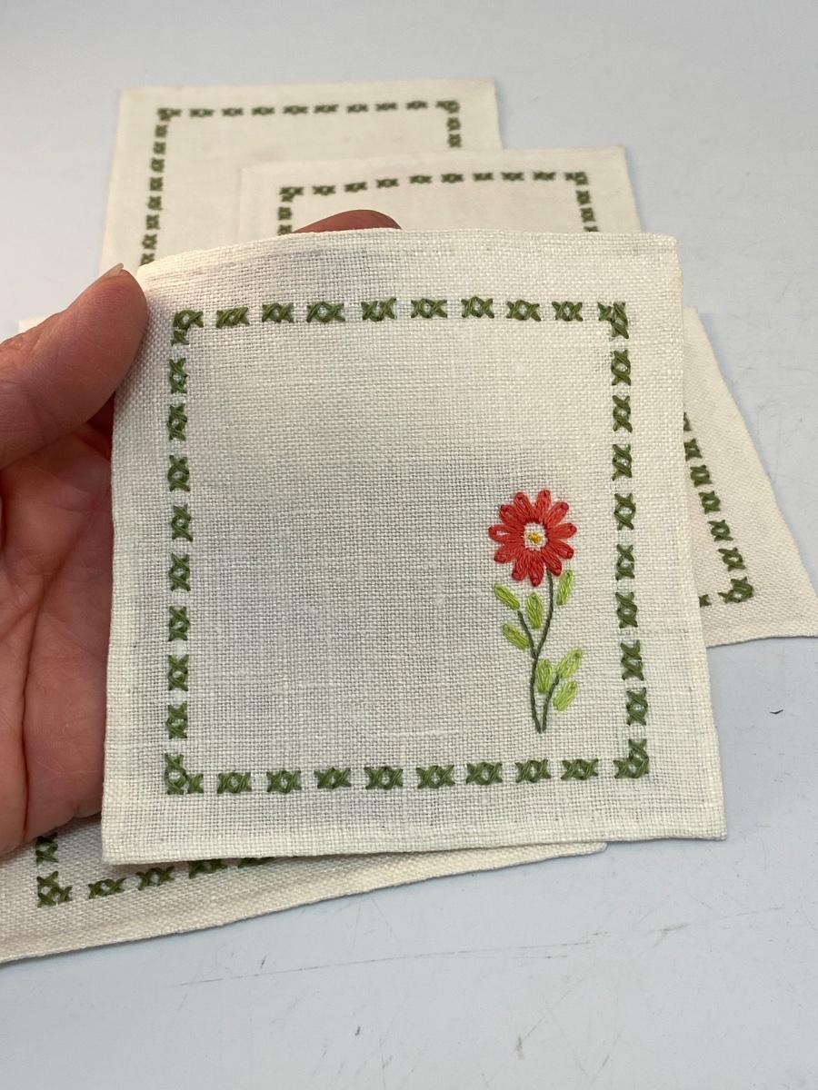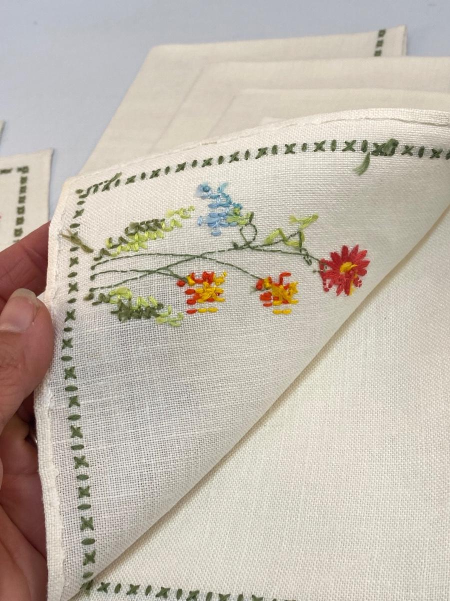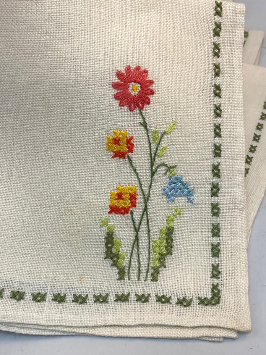 Set of 12 Flower Needlepoint Embroidered Luncheon Dinner Napkins and Drink Coaster Squares. Six of each. In good condition, may have light discolor but no stains or holes noticed.