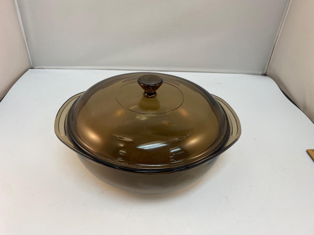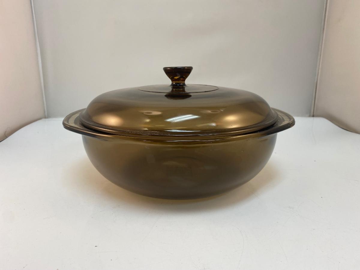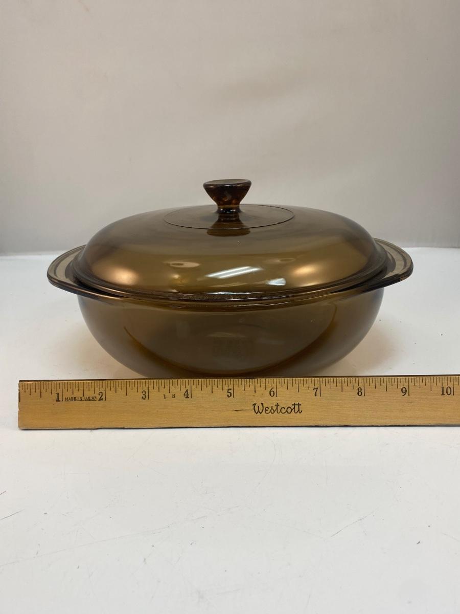 Pyrex Vision Ware Amber Glass Round Casserole Baking Dish with Lid. In good condition.