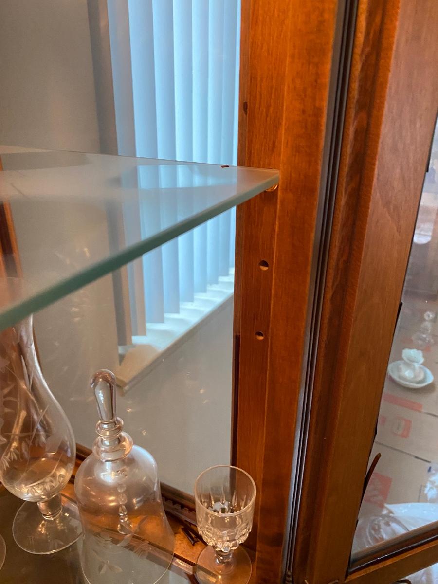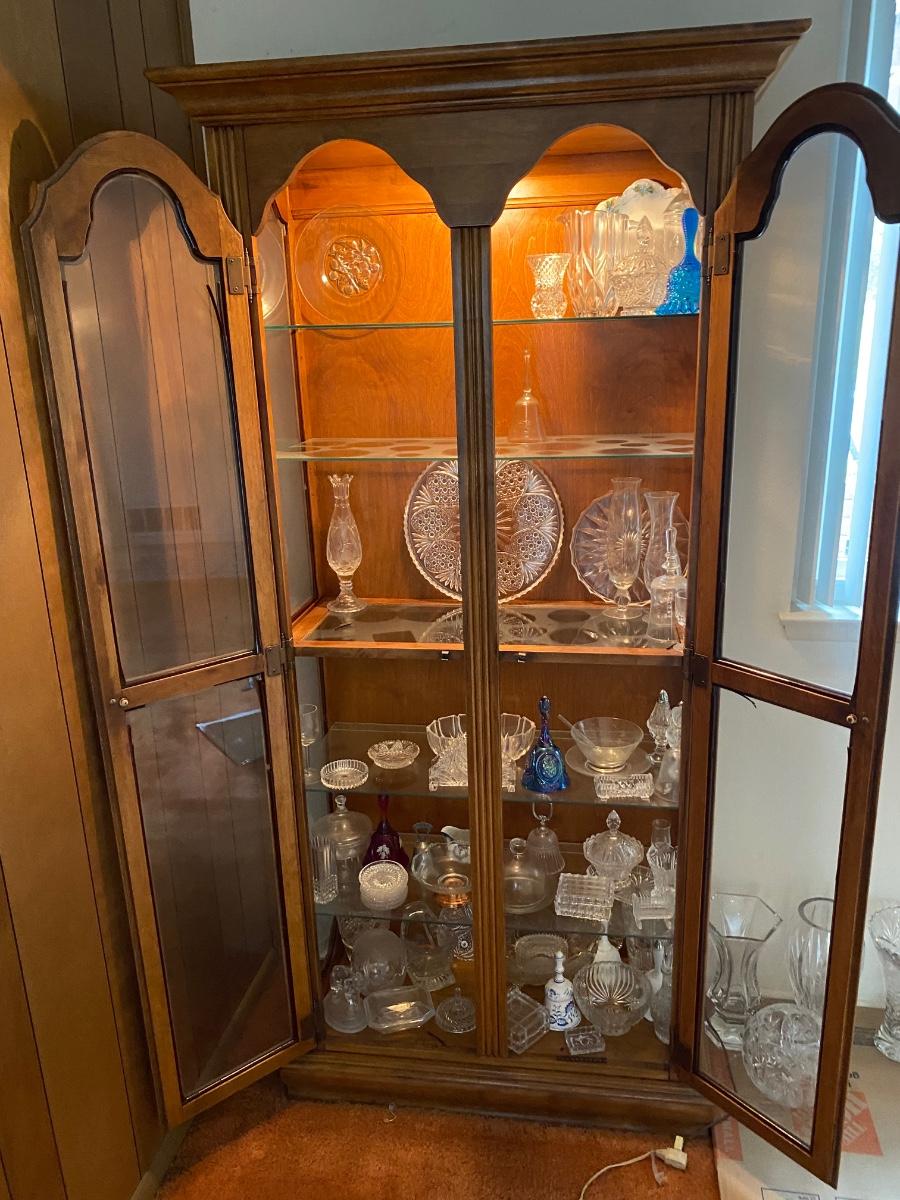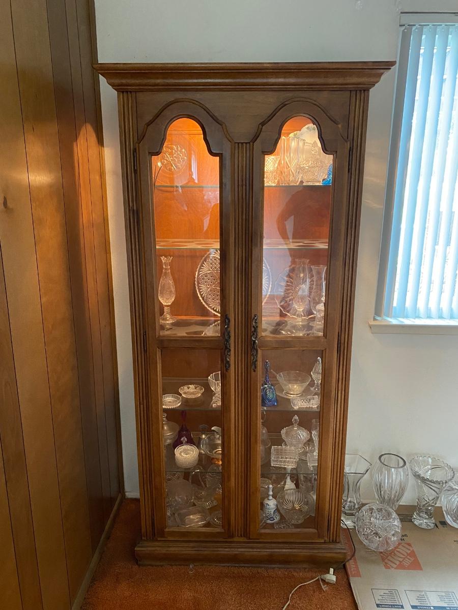 Vintage Wood and Glass Display China Curio Cabinet. In good used condition. Glass shelves are adjustable. Light inside. **Contents NOT included** About 6' tall.