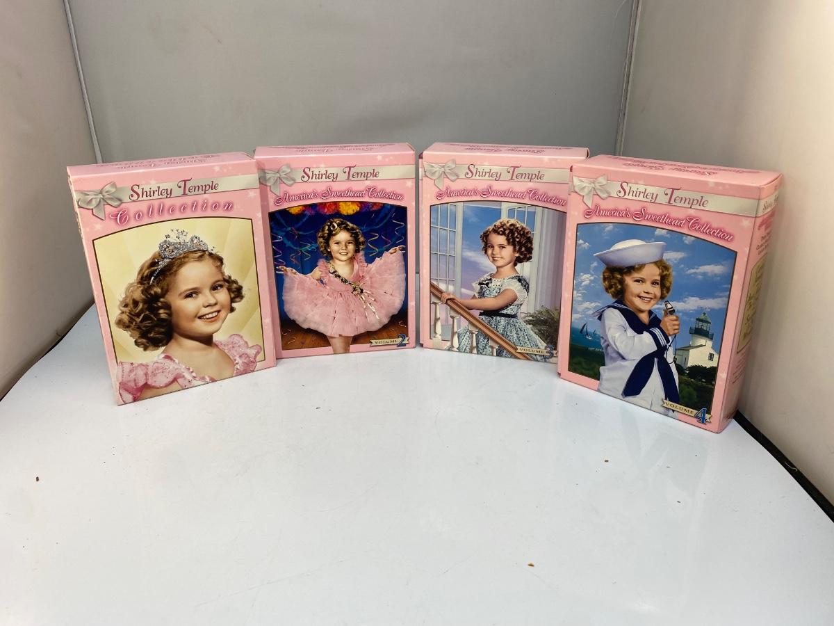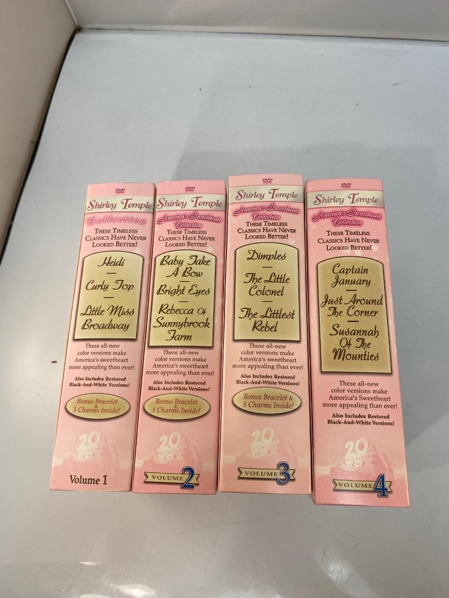Shirley Temple 12 Disc DVD Movie Set with Charm Bracelets. Four box sets with three movies in each. Three of the box sets came with collectible charm bracelets which are included. In good condition.