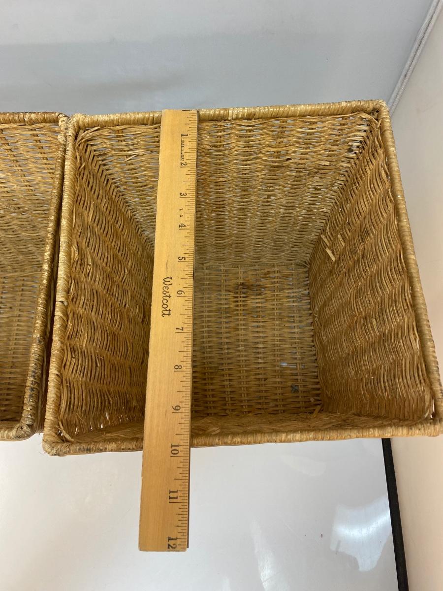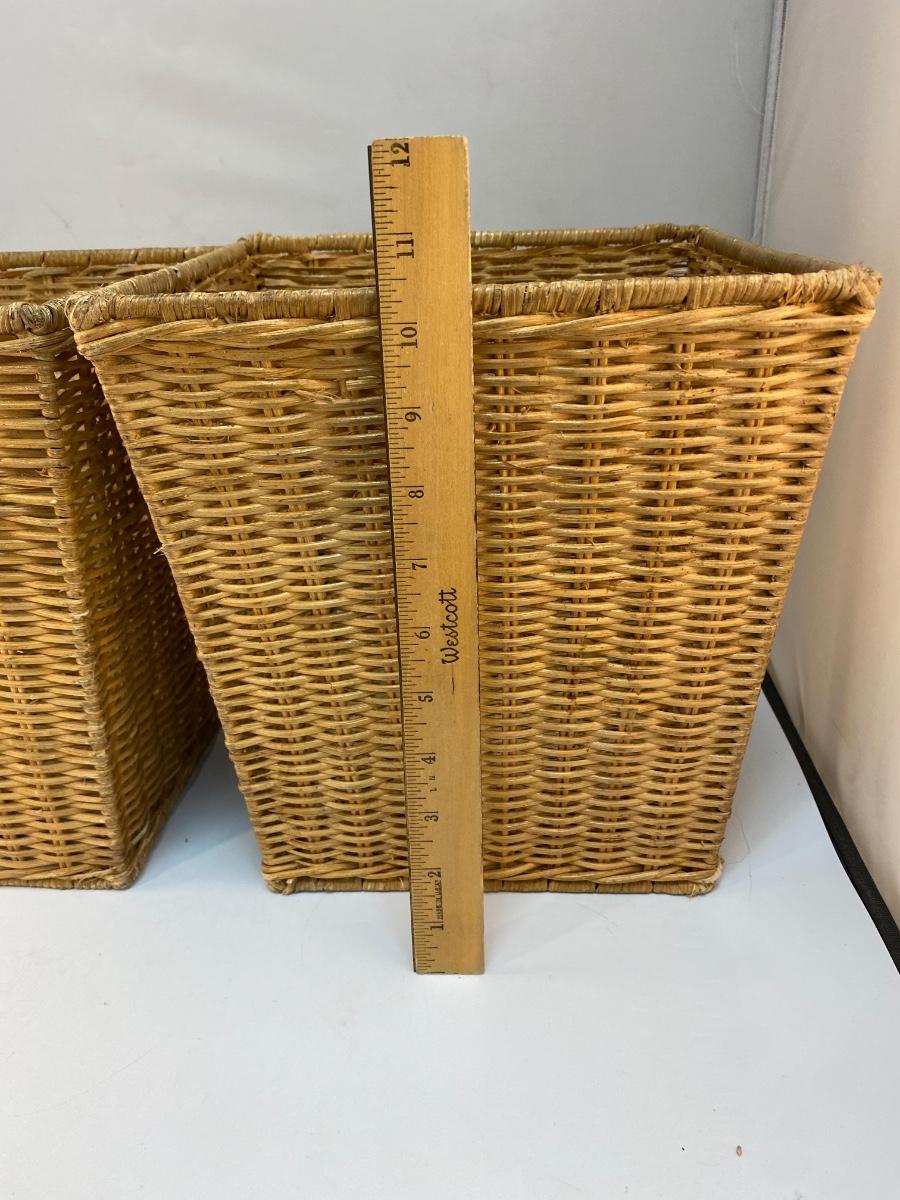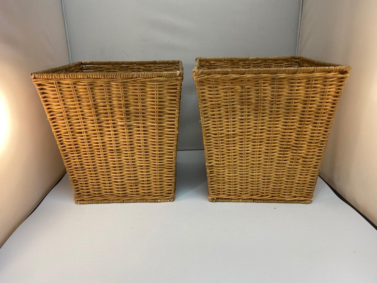 Matching Pair of Square Wicker Woven Rattan Baskets Bins Trash Cans, In good condition. Great for decorative waste cans in office, bedroom, or bathroom. 10.5" tall.