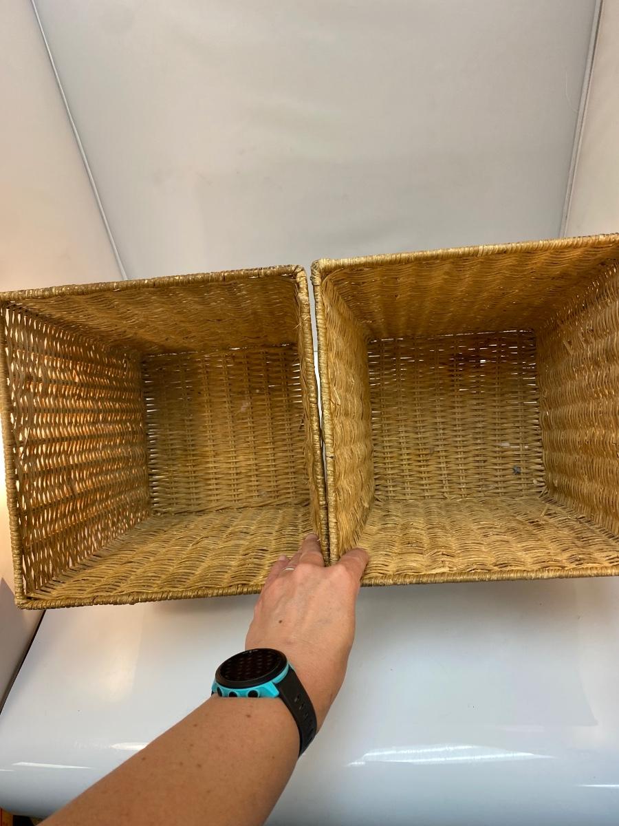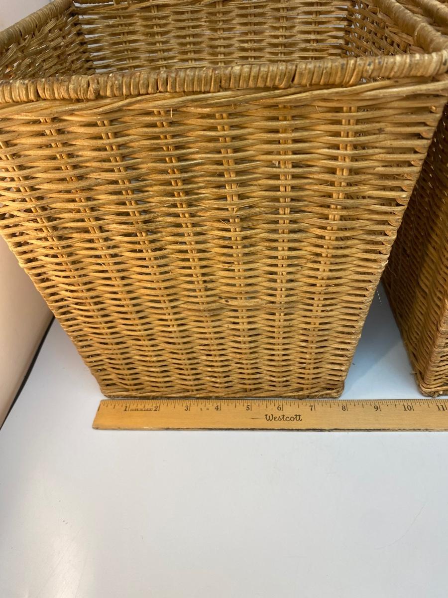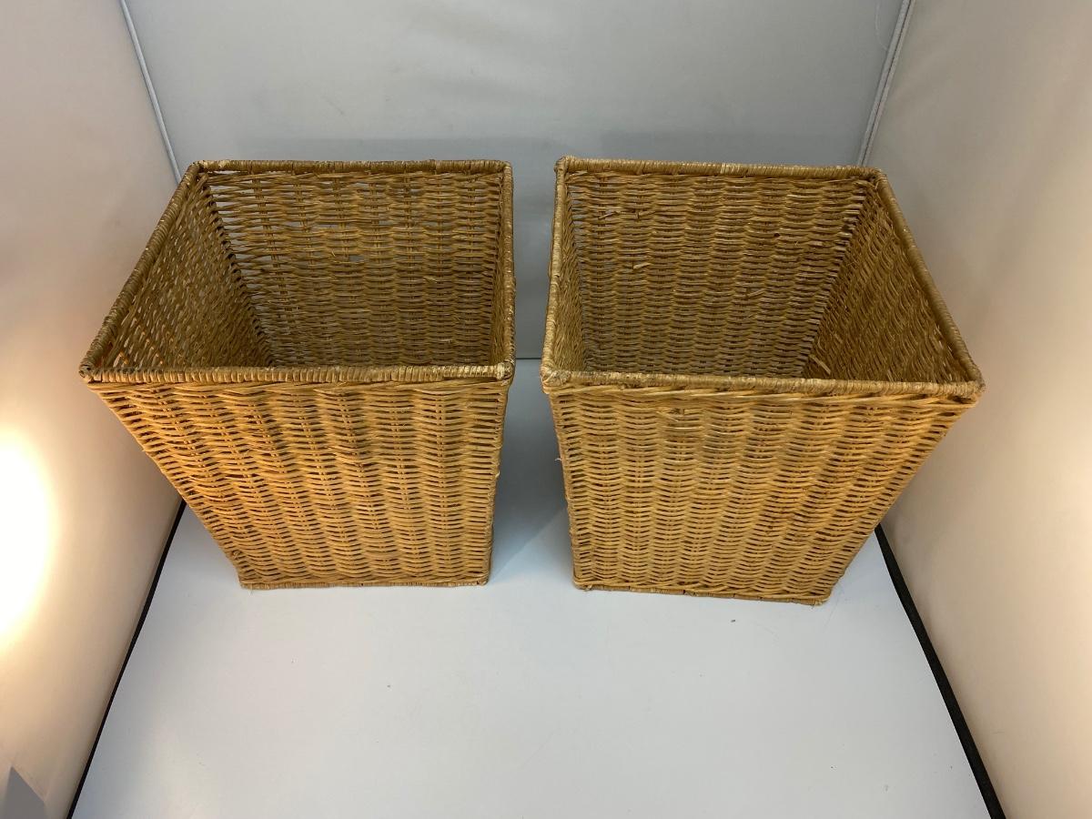 Matching Pair of Square Wicker Woven Rattan Baskets Bins Trash Cans