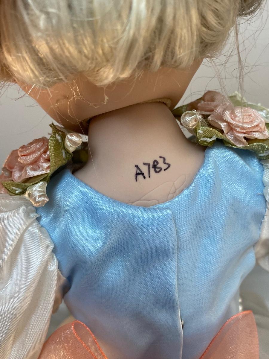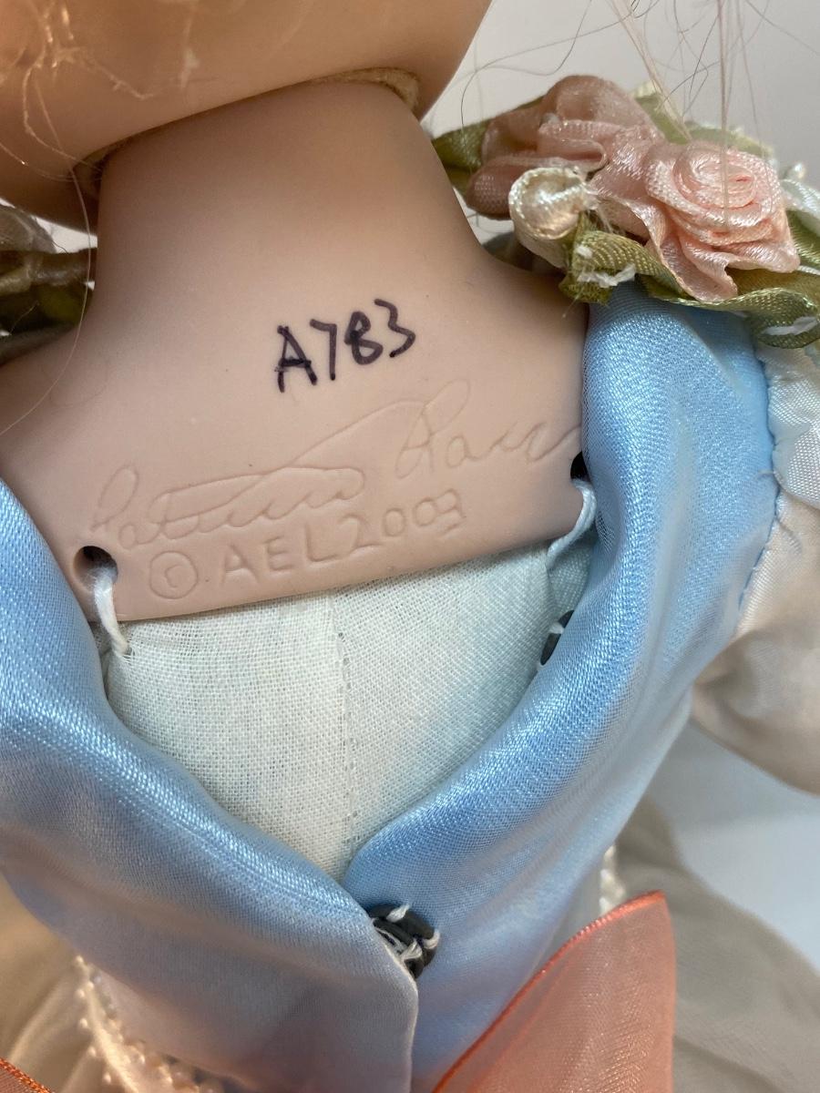 Vintage Porcelain Princess Rapunzel Bisque Soft Body Doll with Stand. In previously displayed condition. Signed on the back. Doll is a little dusty from previous display.