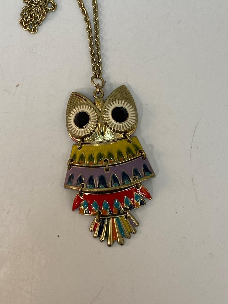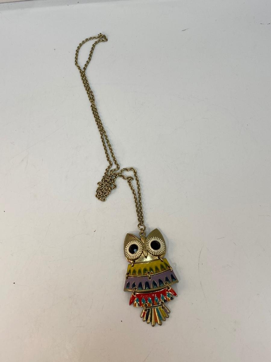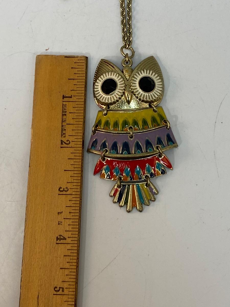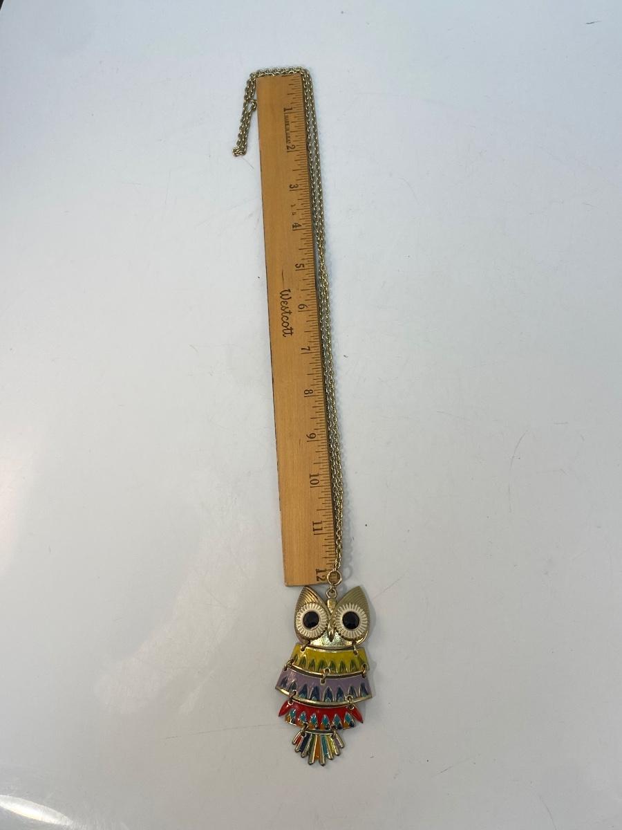 Colorful Enamel Painted Metal Owl Pendant Long Necklace. In good condition. Owl is about 3.5" size.