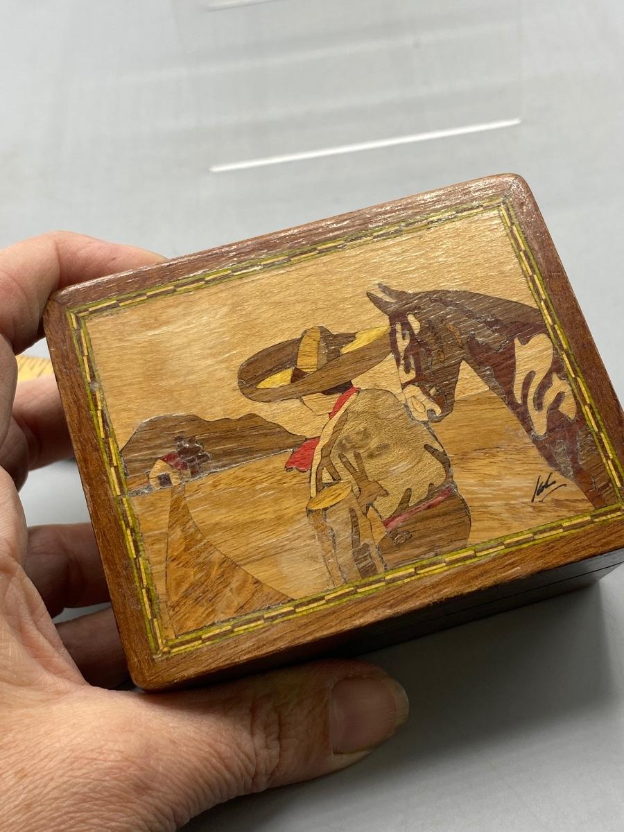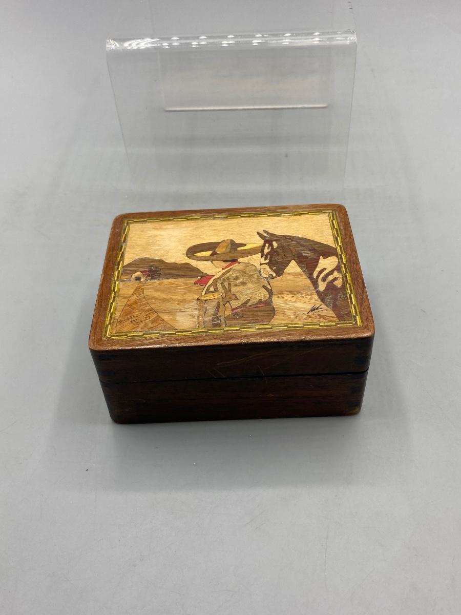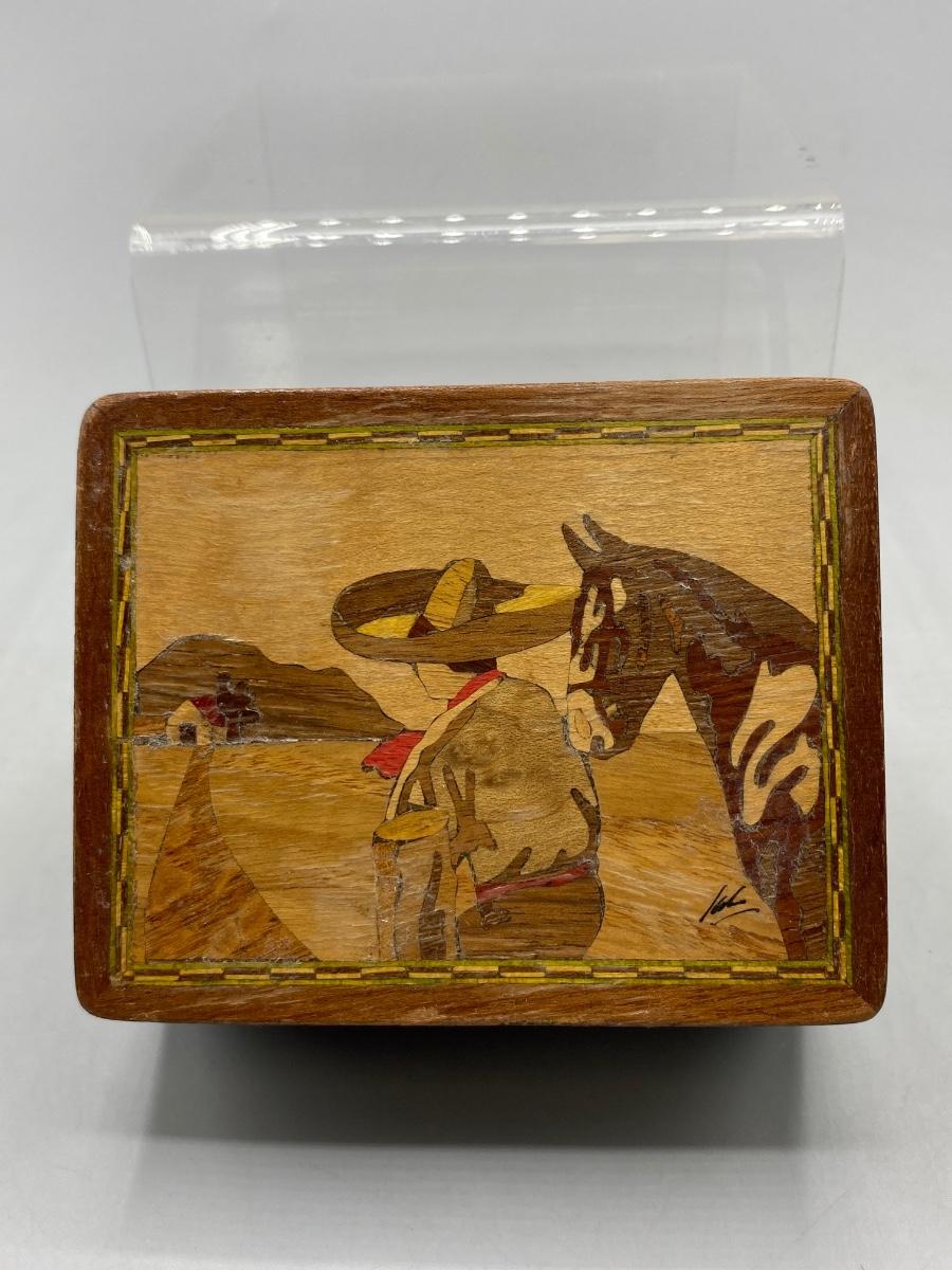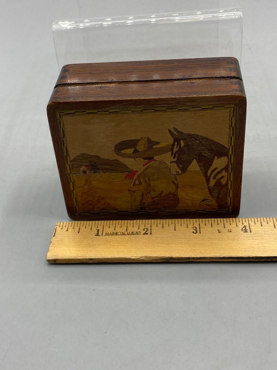 Vintage Small Wood Hinged Lid Trinket Box Man Wearing Sombrero with Horse on Lid