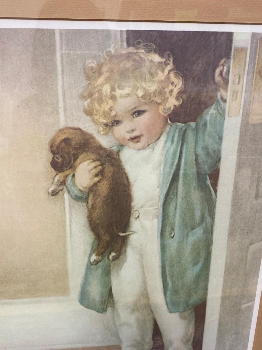 Large Framed Bessie Pease Gutmann Print Good Morning Cute Child with Puppy. Nicely frame print. 20x26 frame.