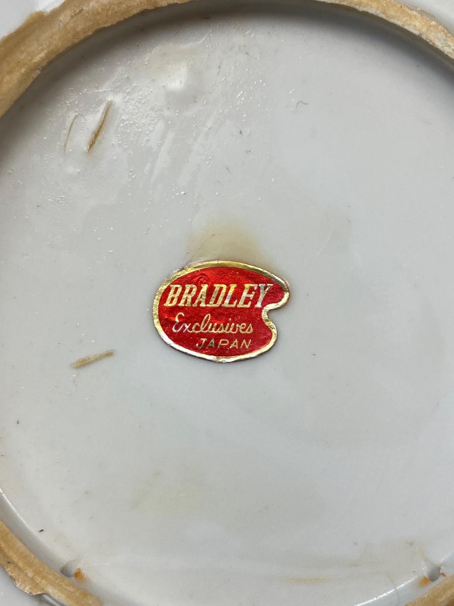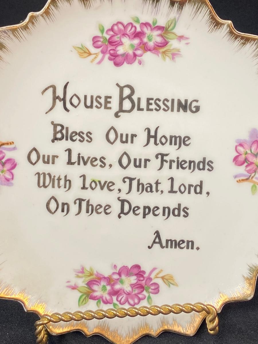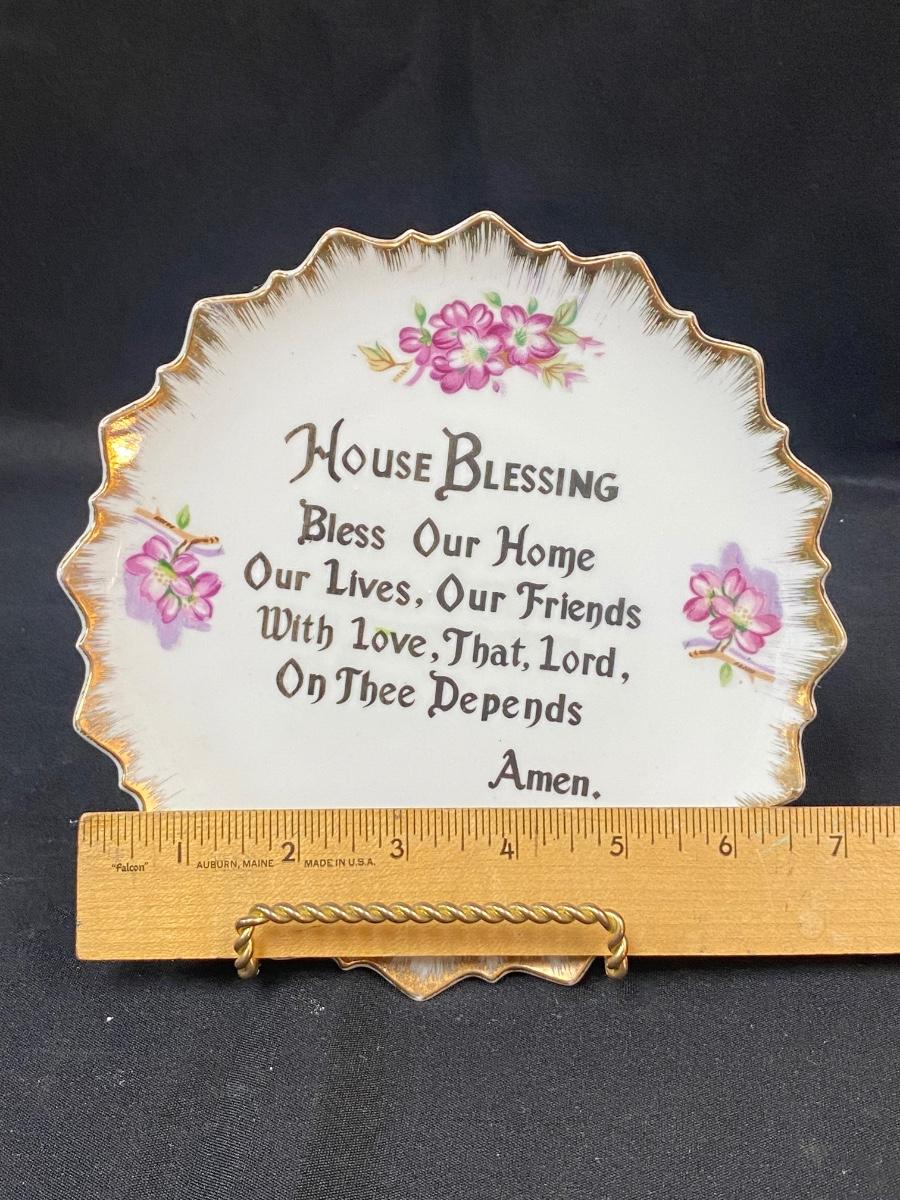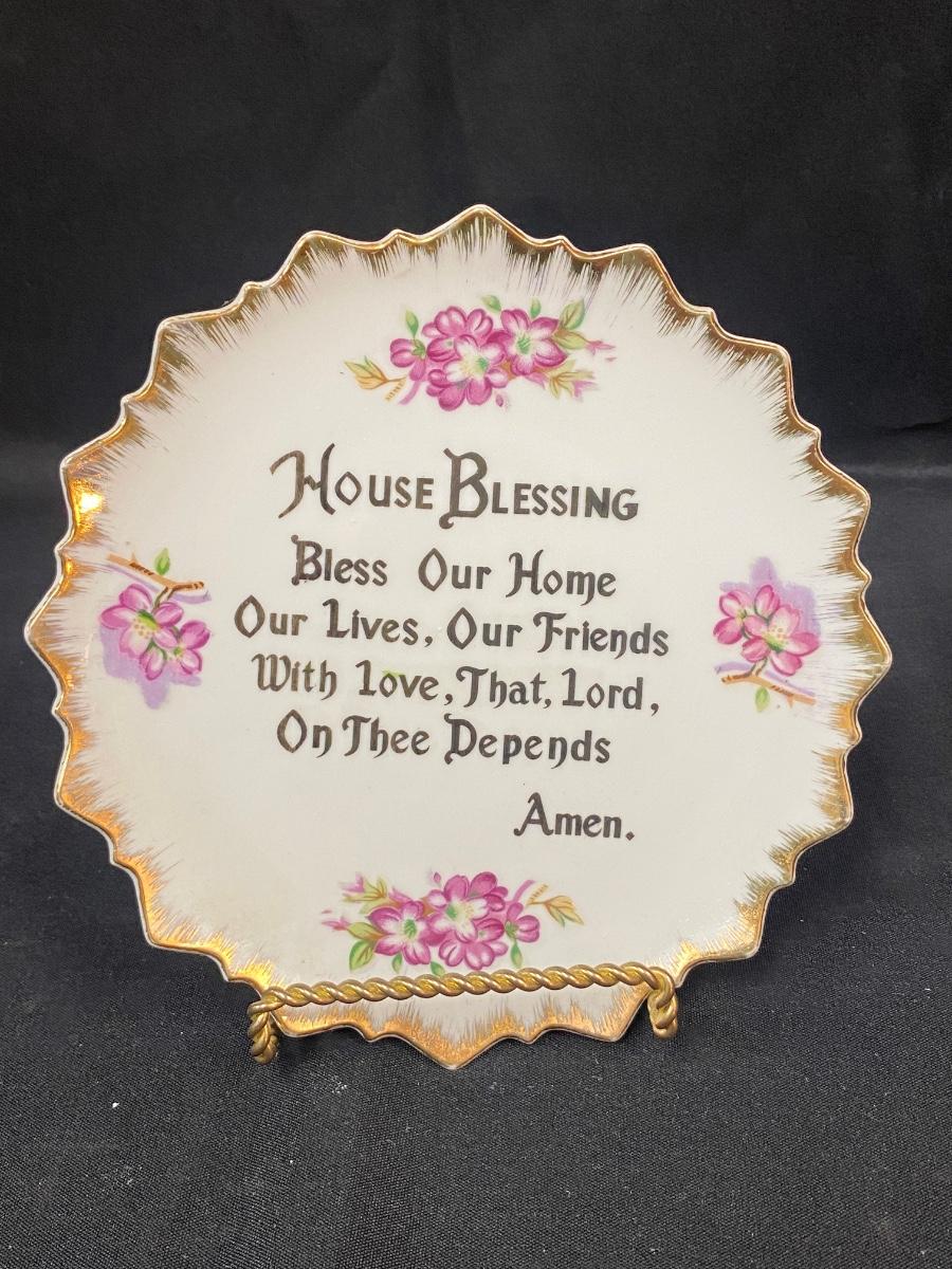Bradley Exclusives Japan Vintage House Blessings Decorative Wall Hanging Plate. In fair condition. Displays well but it looks like it was hung against wet pain or on a wall for many years that the old paint stuck to the rim along the bottom, does not affect displaying. About 7" size.