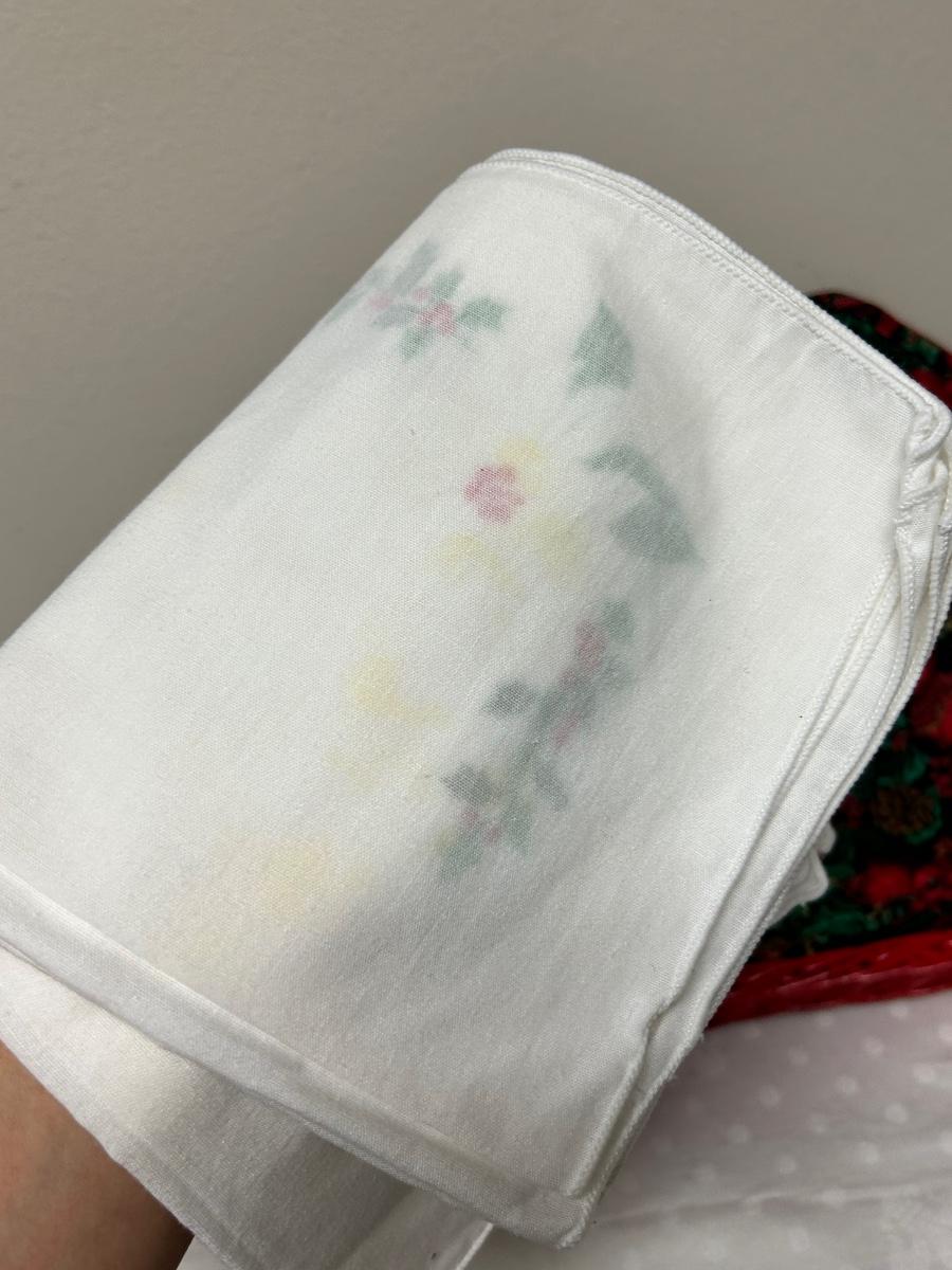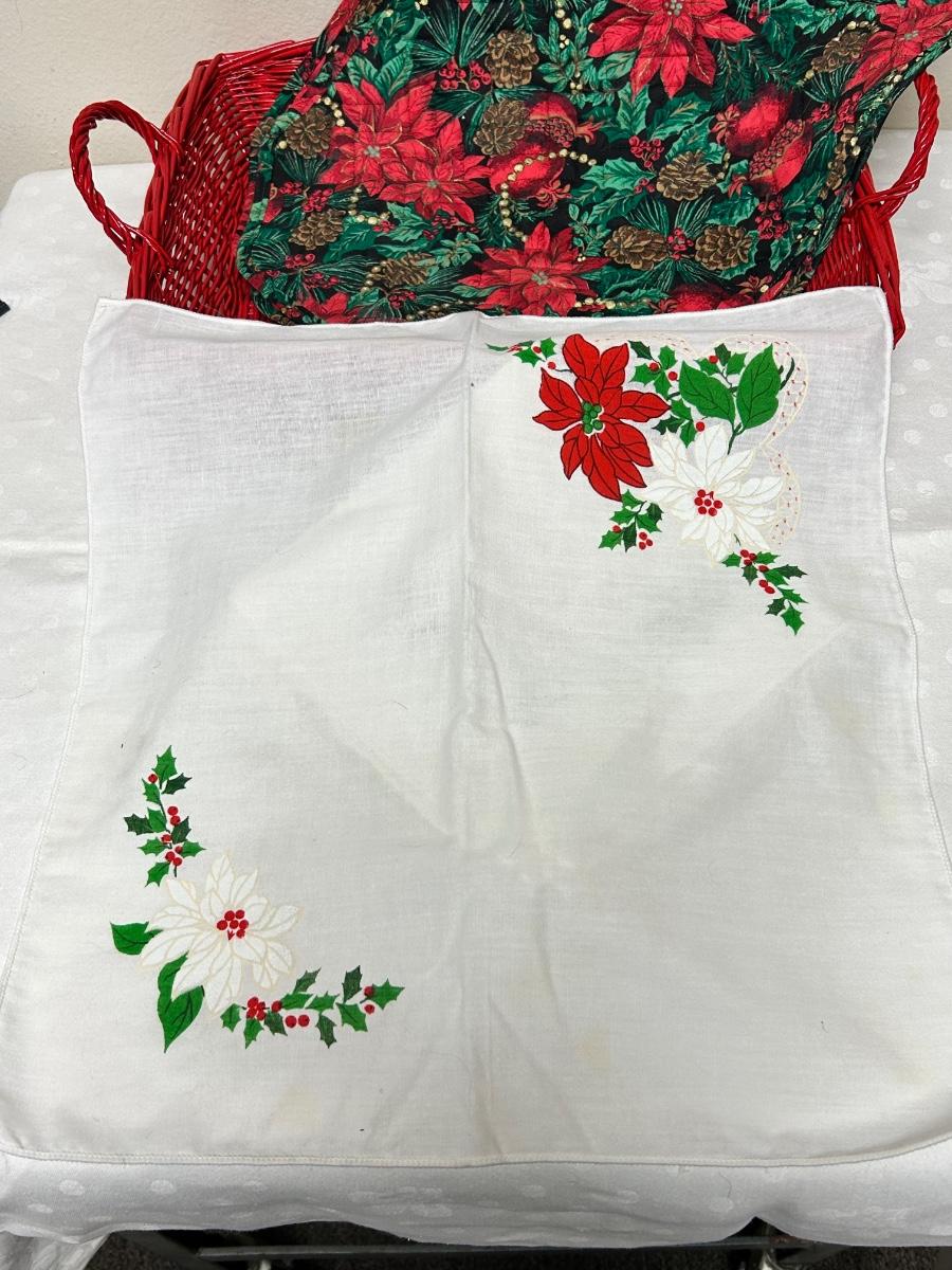 Christmas Holiday Table Linens Napkins Placemats and Red Basket. Some faint spots on napkins and three placemats.