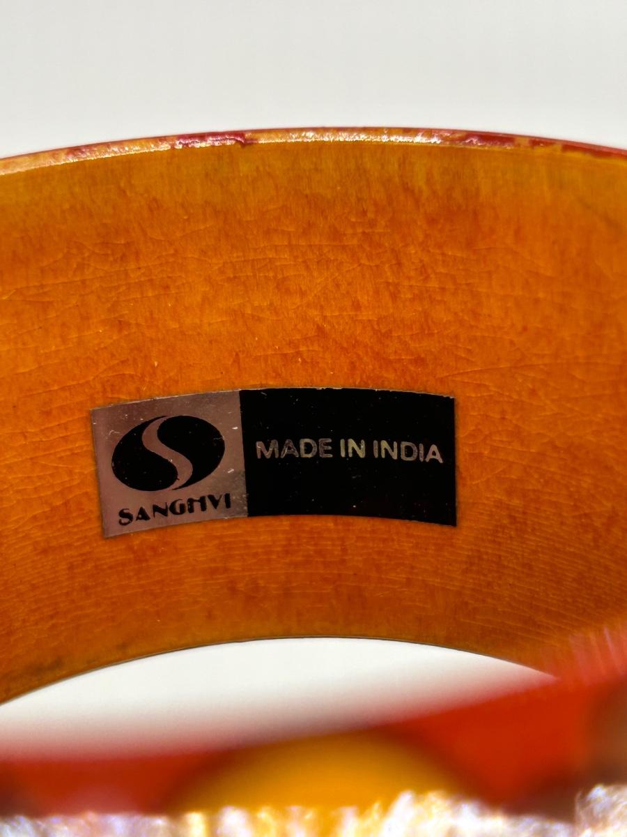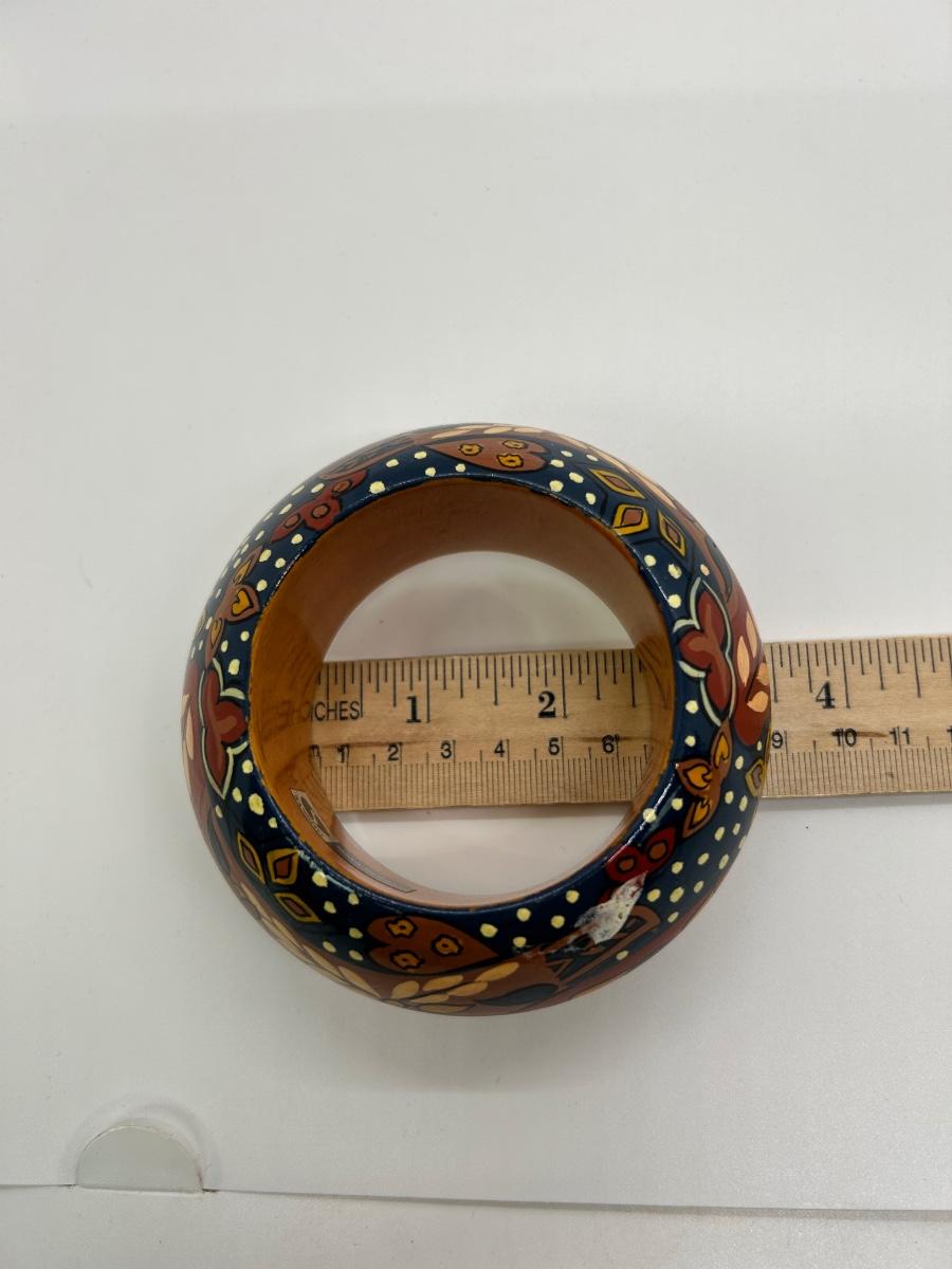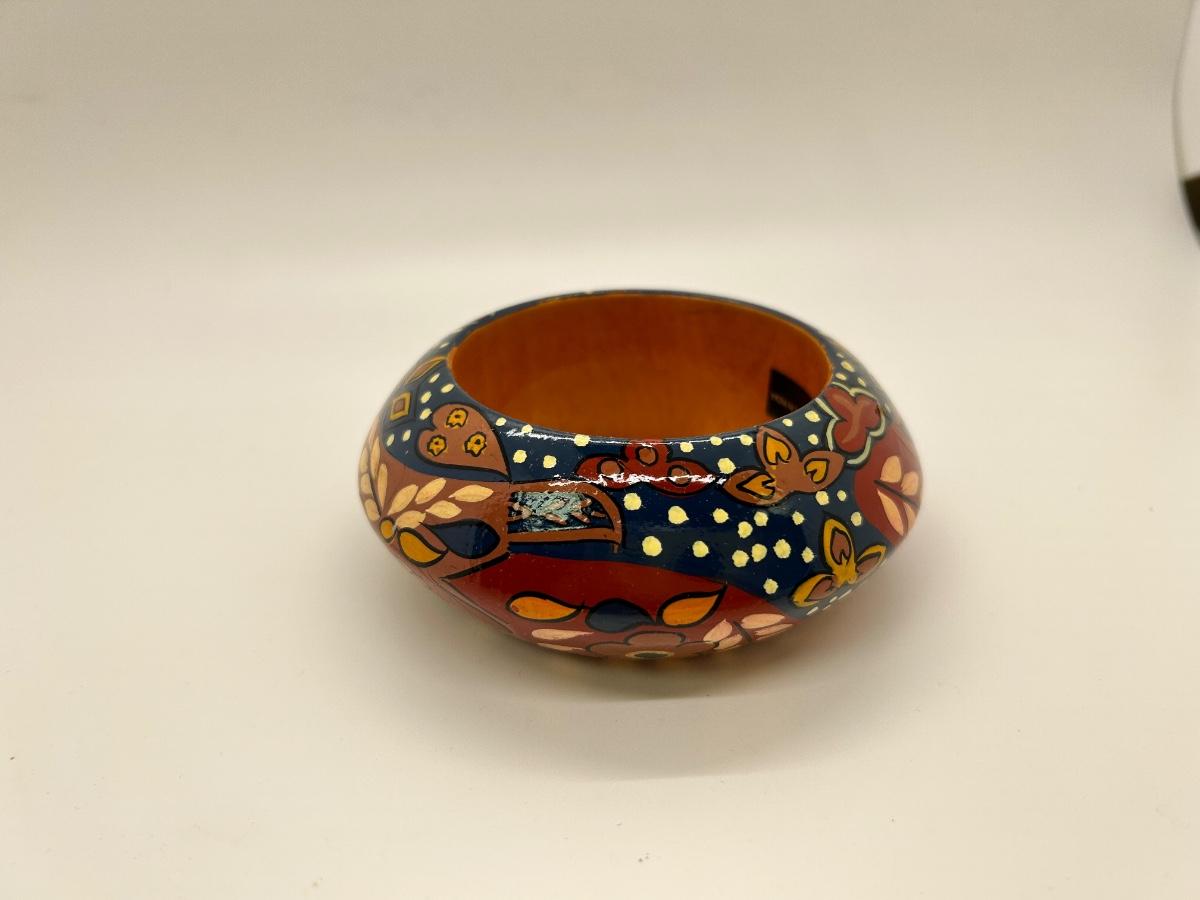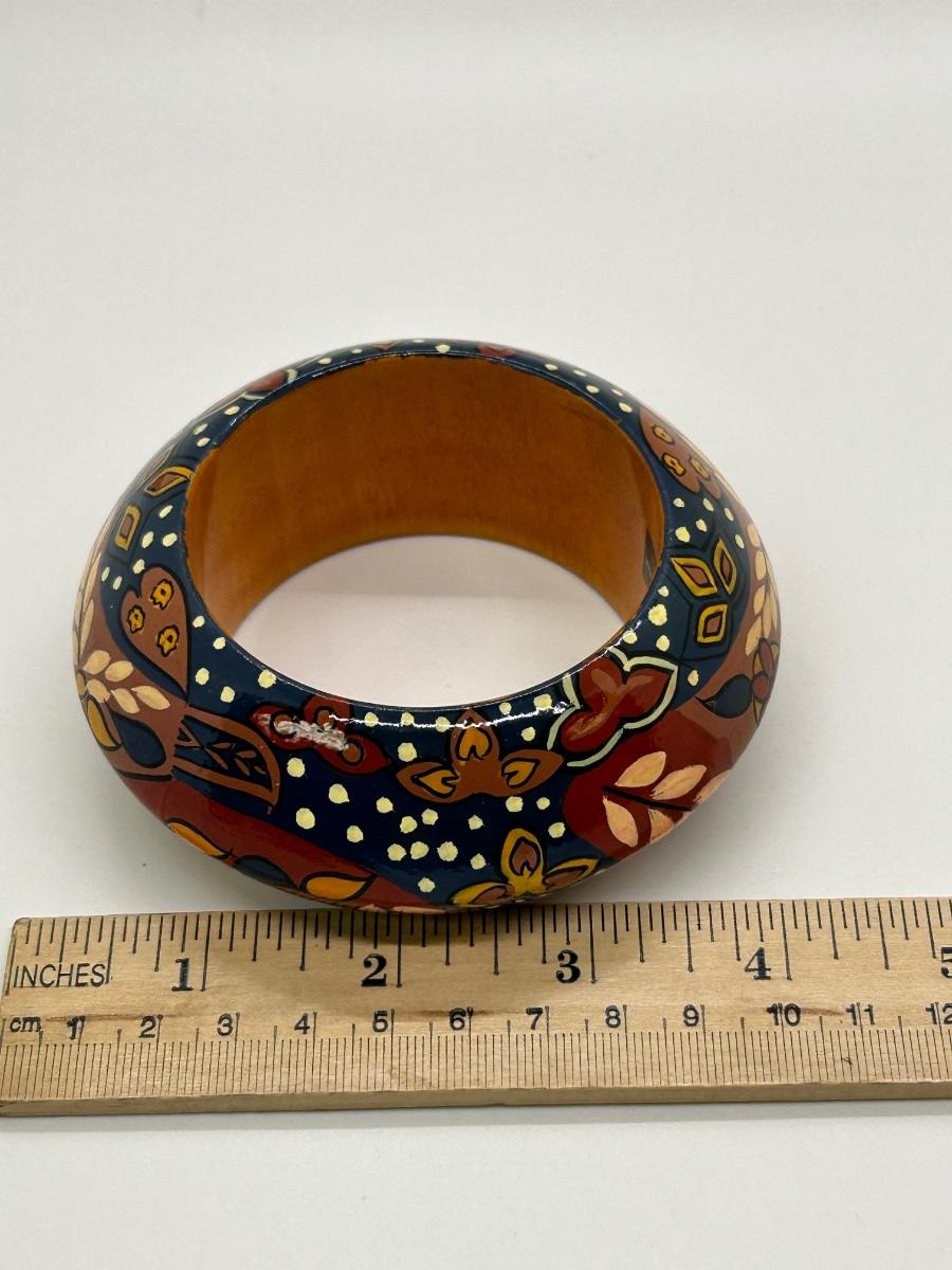 Vintage Retro Hand Painted Wood Chunky Bangle Bracelet Made in India. In good condition. Has original maker label inside. The opening is a bit small.