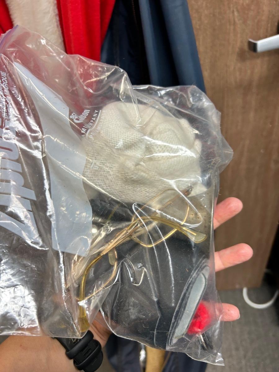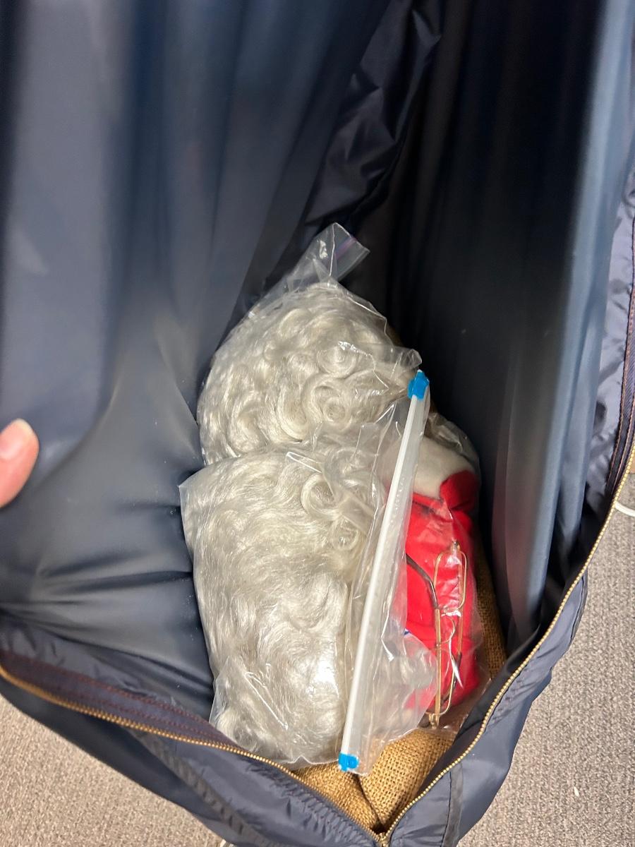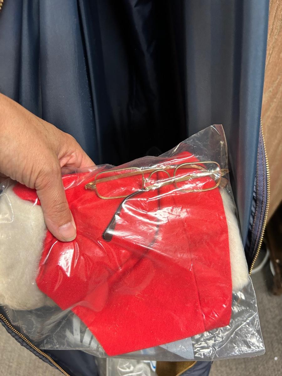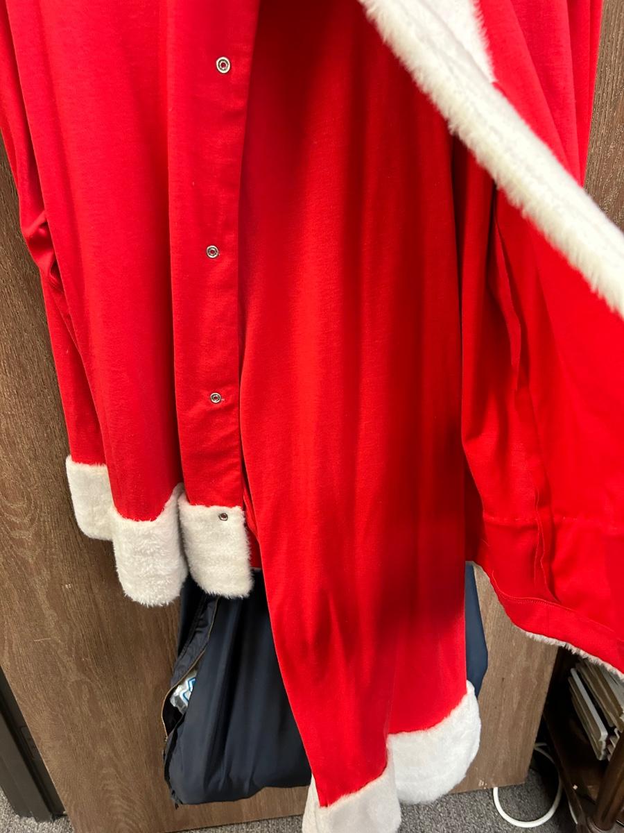Vintage Complete Santa Claus Suit with Fake Beard and Accessories. Comes with suit, fake beard, wig, gloves, glasses, belt, and gift bag. No size, may have been handmade, looks large.