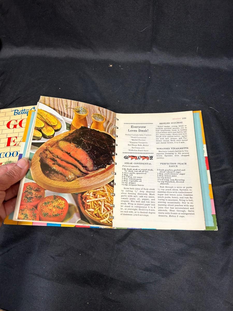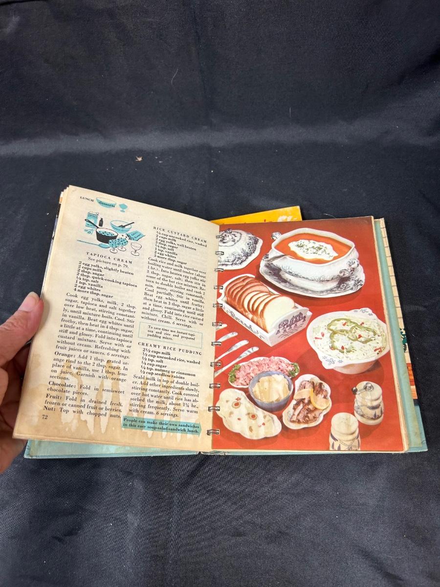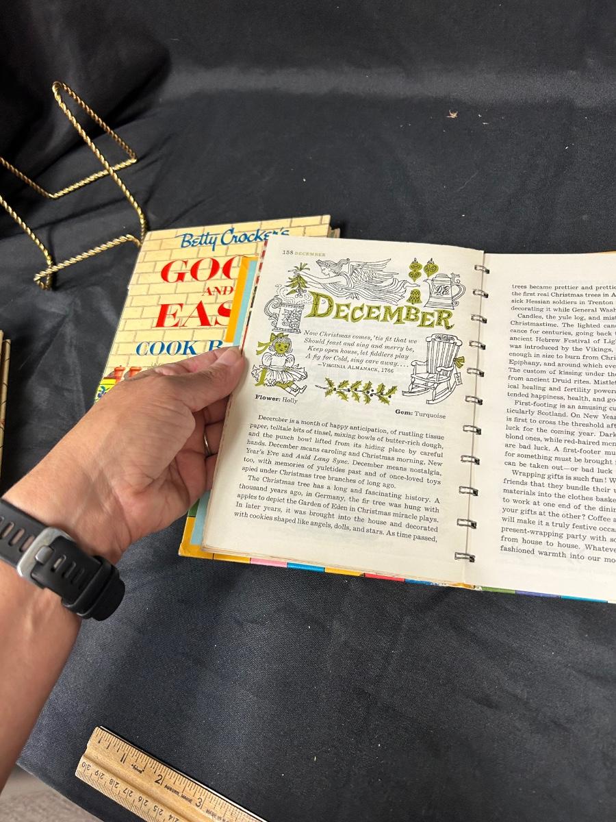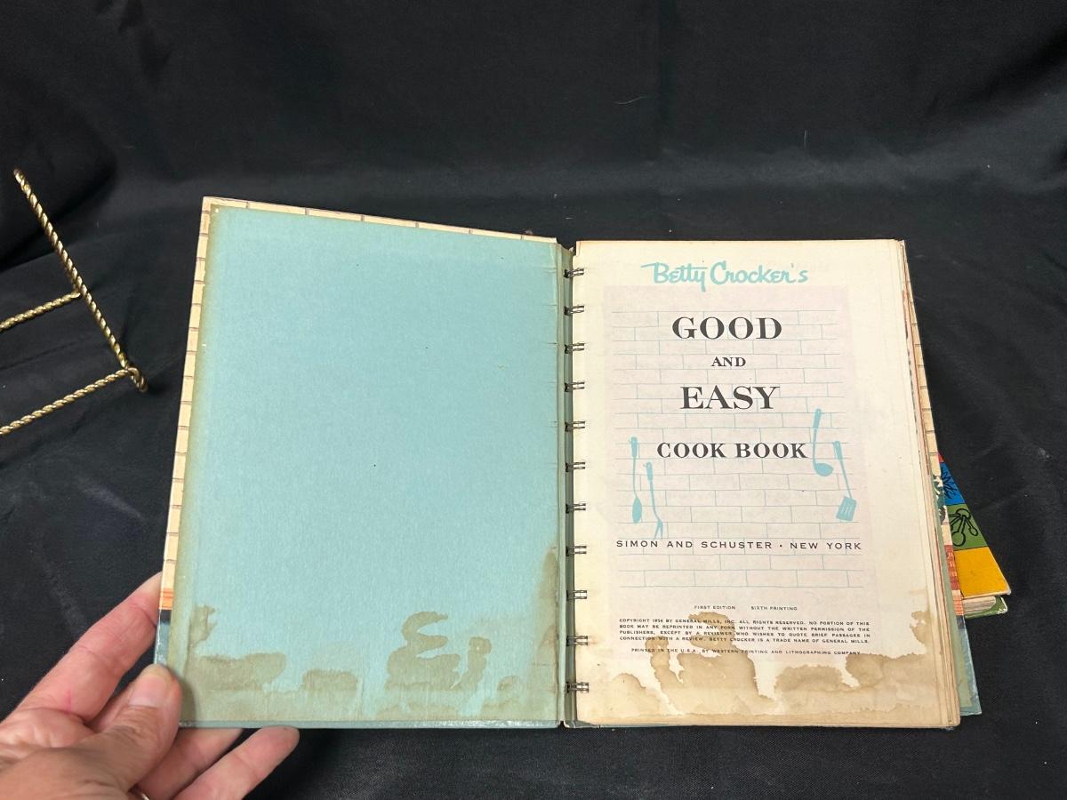 Pair of Midcentury Betty Crocker Cook Books Good and Easy & Cooking Calendar. Spiral bound cookbooks. The Cooking Calendar give ideas for everyday of the year. Good and Easy has some water stains along the bottom. Both would display well.