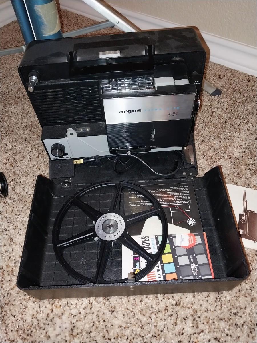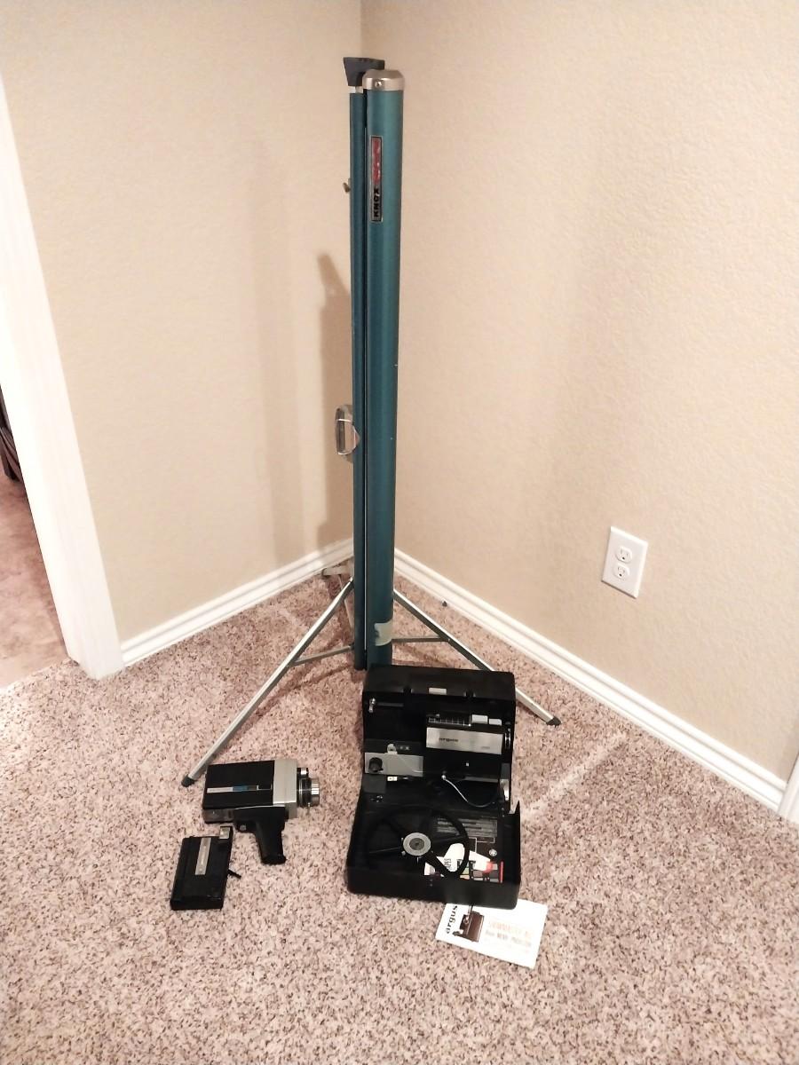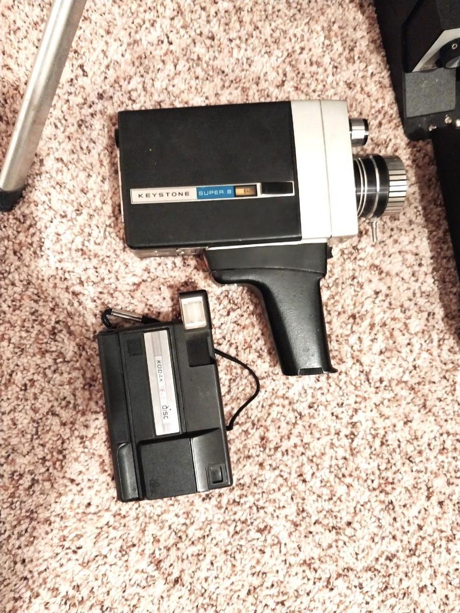 KEYSTONE SUPER 8 MOVIE CAMERA, ARGUS MOVIE PROJECTOR, KODAK DISC CAMERA AND A SCREEN