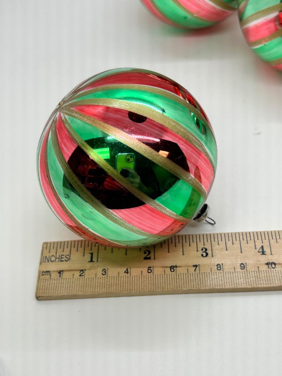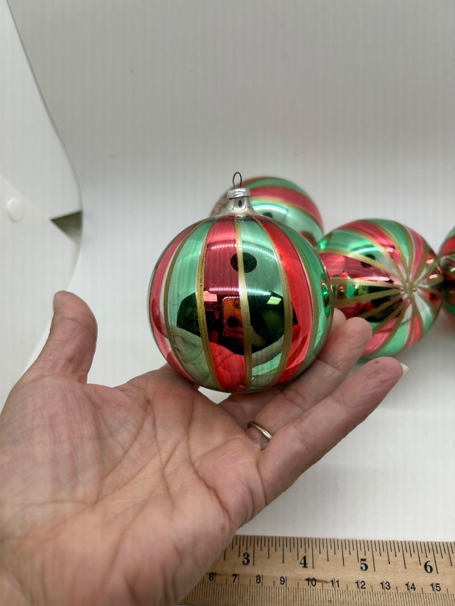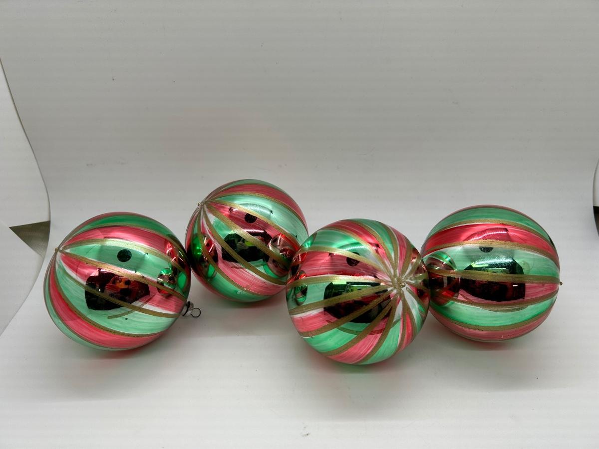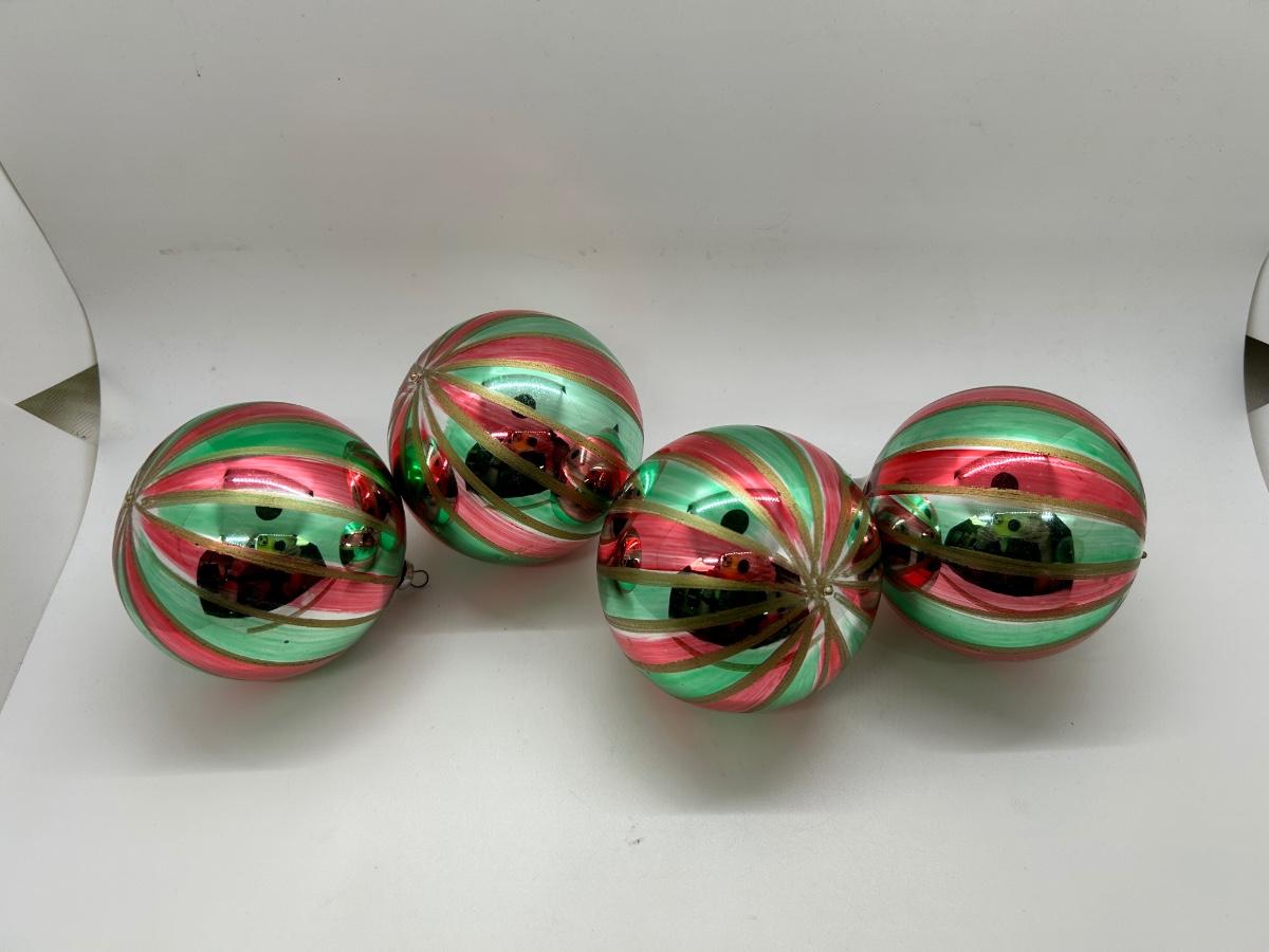 Lot of 4 Vintage Blown Glass Red and Green Striped Christmas Holiday Tree Ornaments. Light fade to the color but no damage found on any ornament.