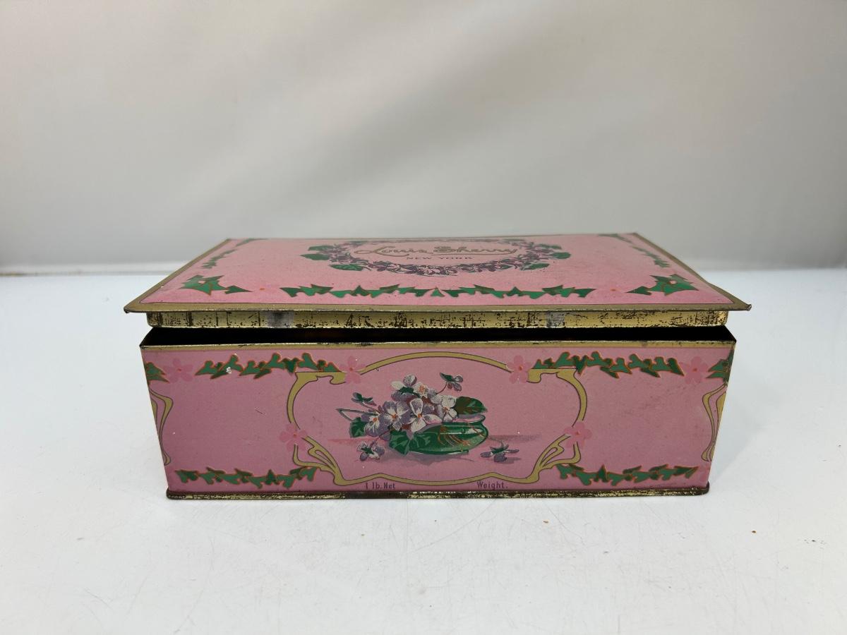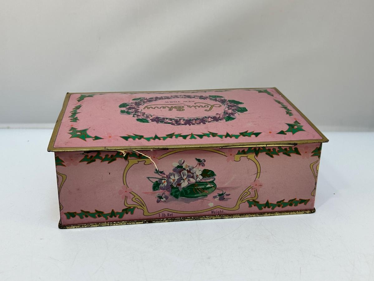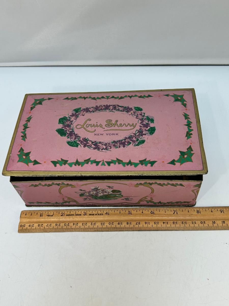 Vintage Pink with Purple Flowers Hinged Lid Tin Louis Sherry New York Chocolates Candy Box. In aged condition. Box lid does not want to close completely.