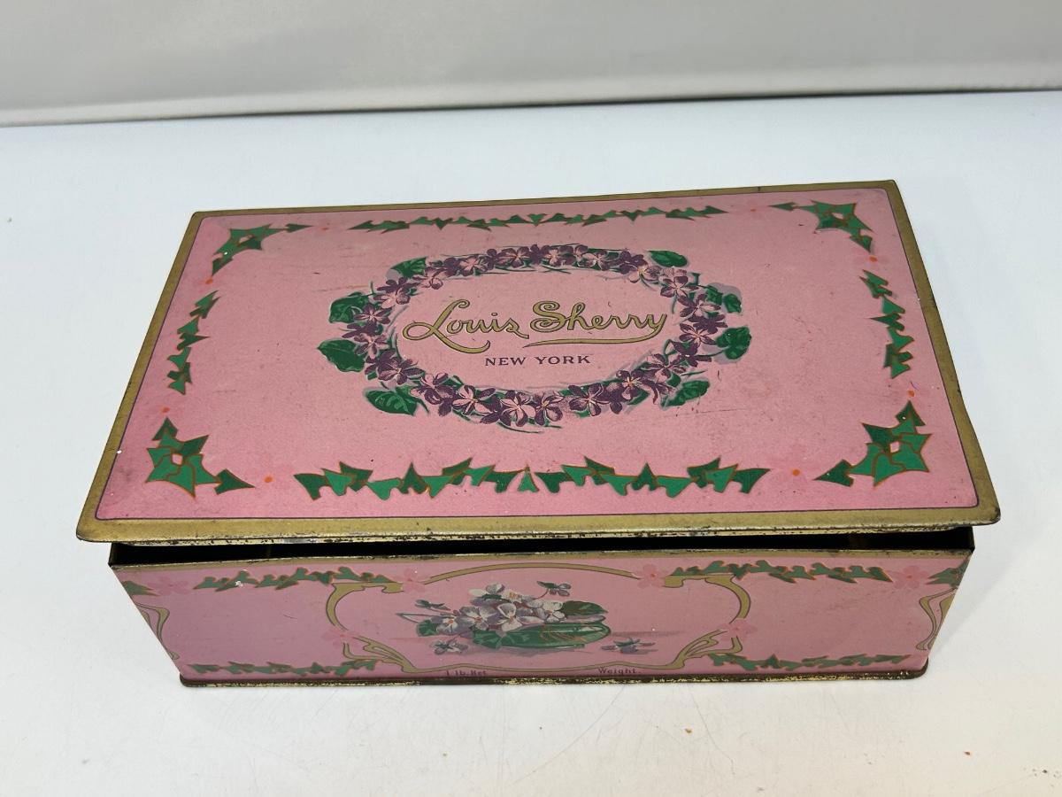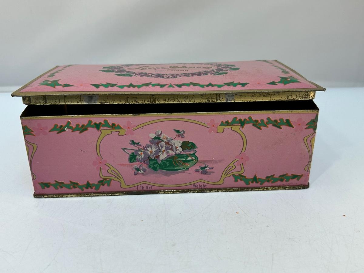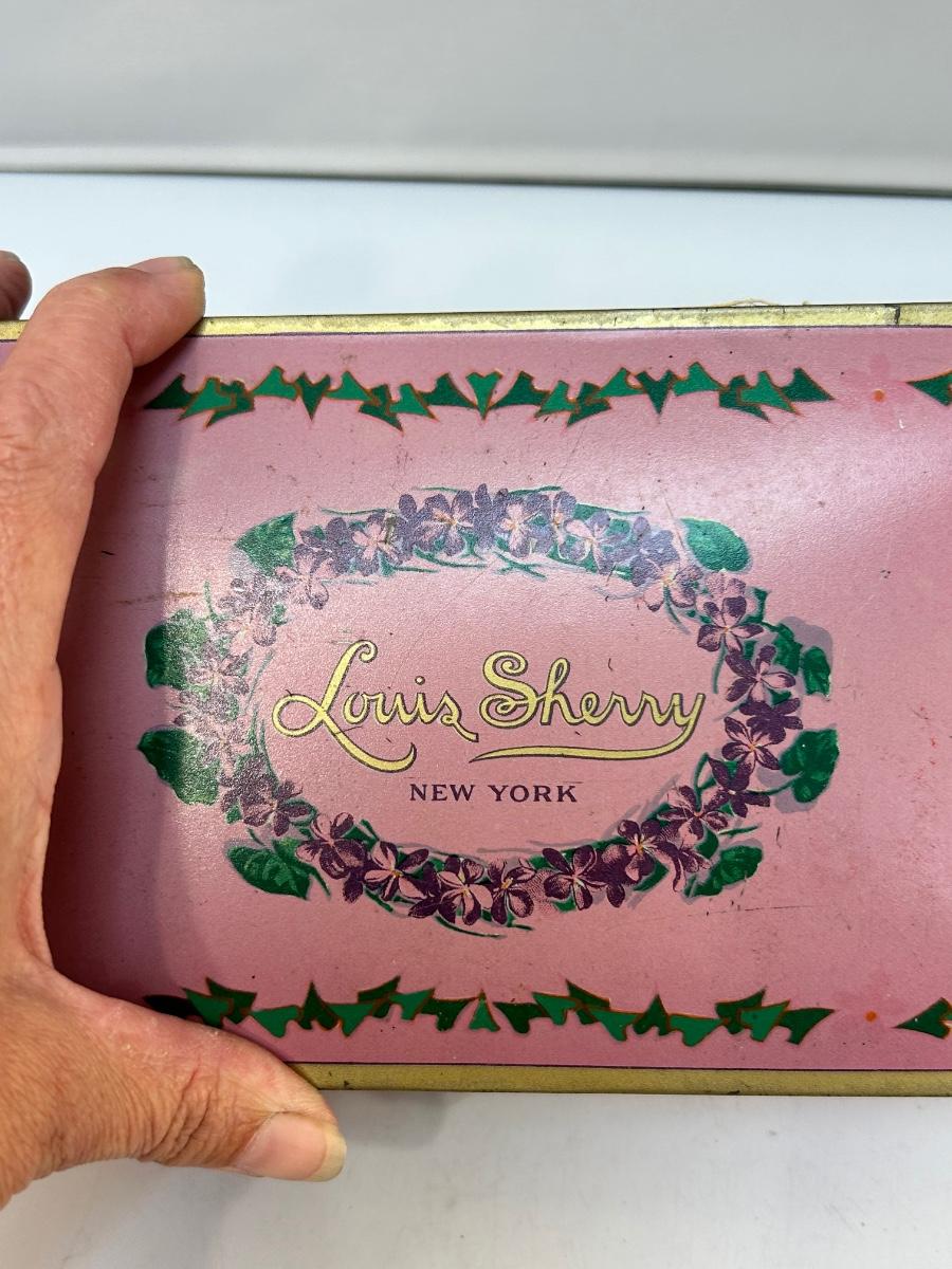 Vintage Pink with Purple Flowers Hinged Lid Tin Louis Sherry New York Chocolates Candy Box. In aged condition. Box lid does not want to close completely.