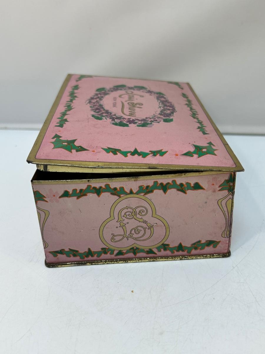Vintage Pink with Purple Flowers Hinged Lid Tin Louis Sherry New York Chocolates Candy Box