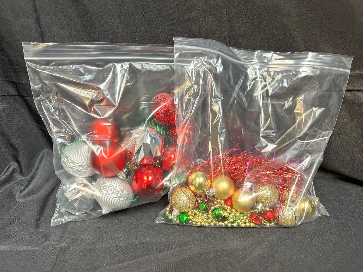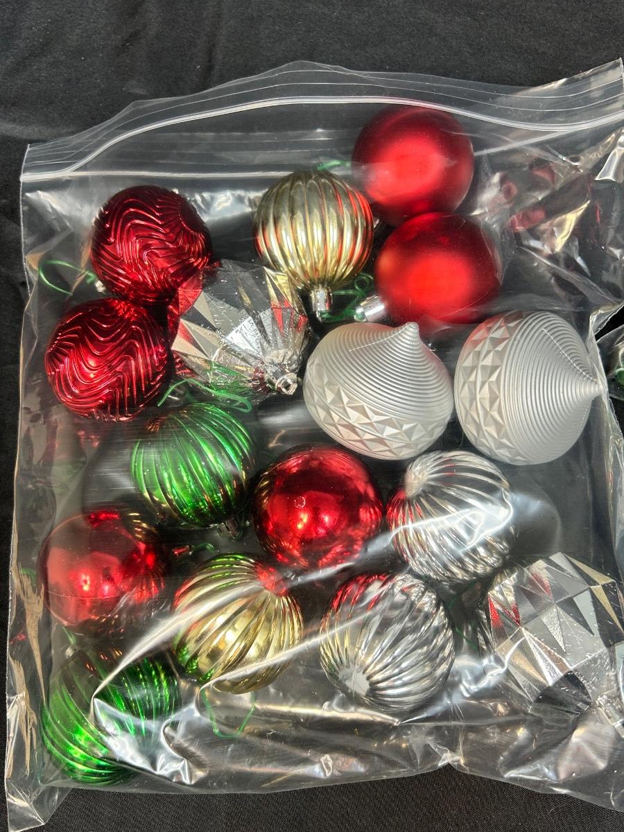 Mixed Lot of Plastic Christmas Holiday Ball Ornaments Bead Garland Bells and More. Traditional gold, green, red, ans silver colors. Good previously used condition.