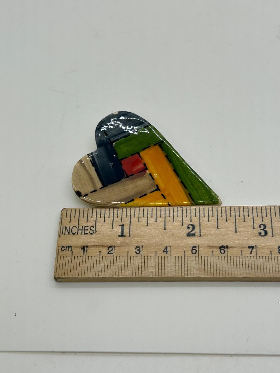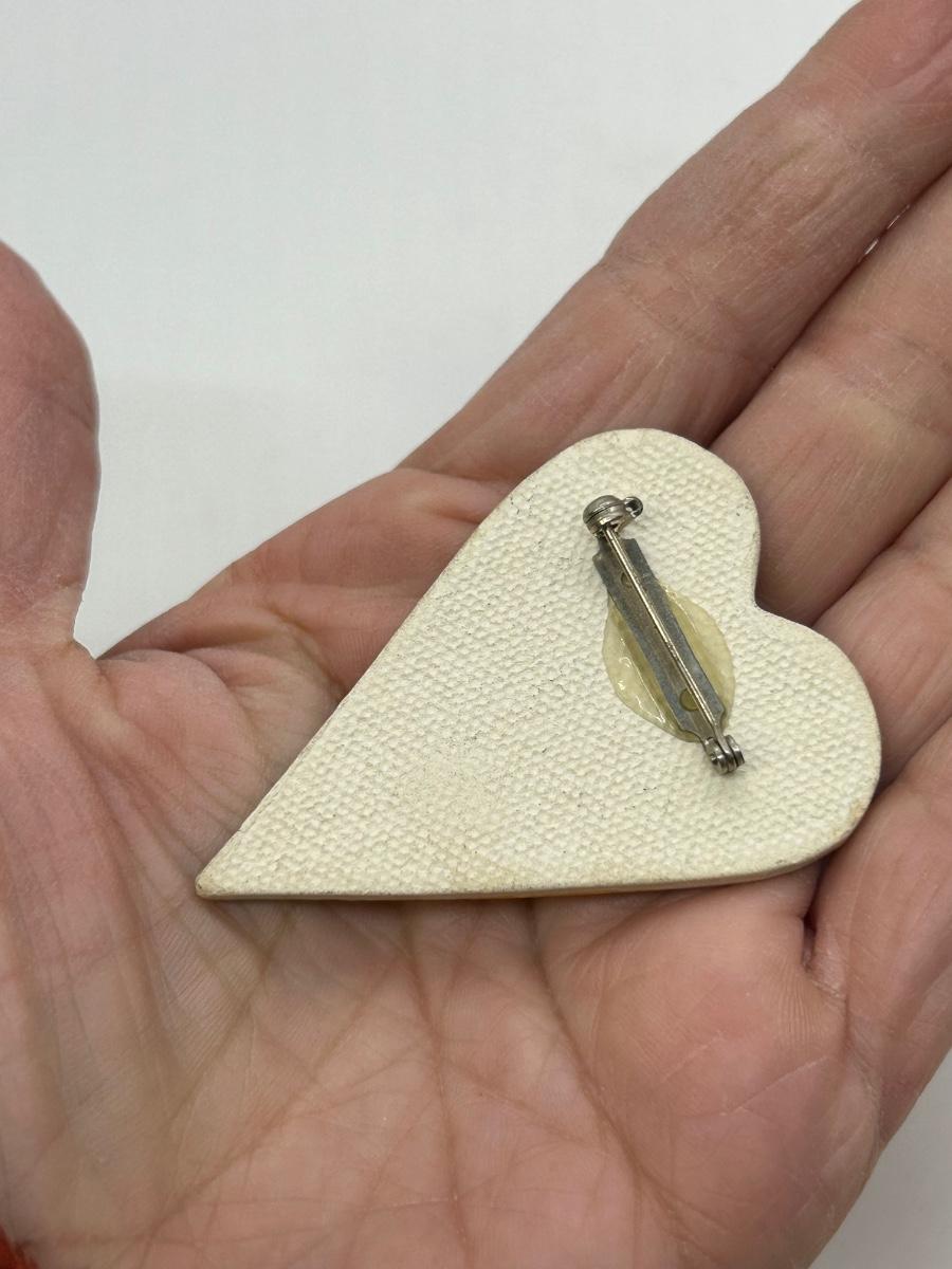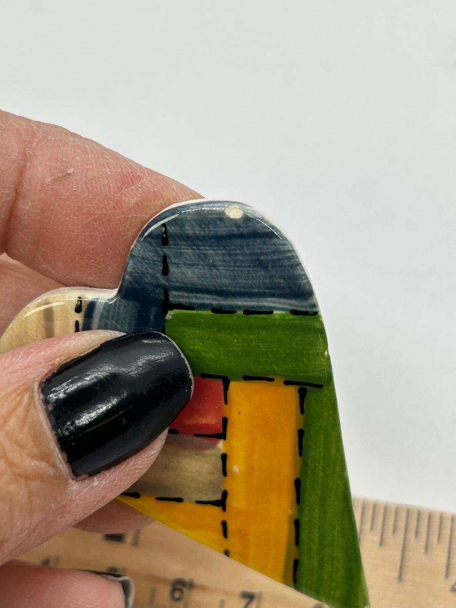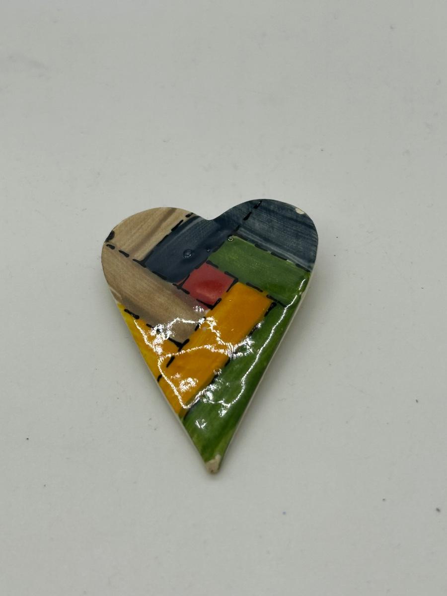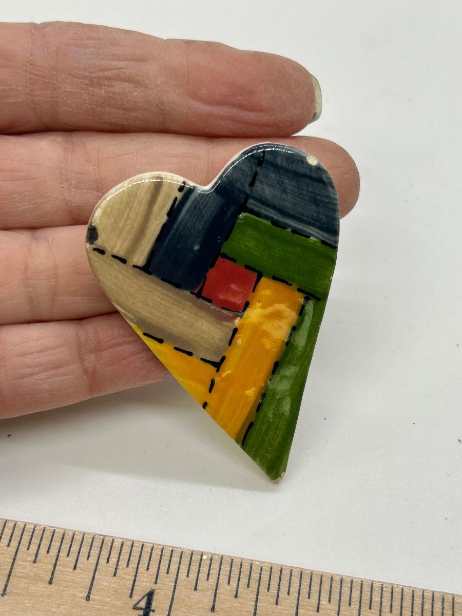 Retro Ceramic Patchwork Pattern Heart Shaped Pin. In good condition. Tiny chip along top edge could be touched up with paint or even marker if desired. A little over 2" size.