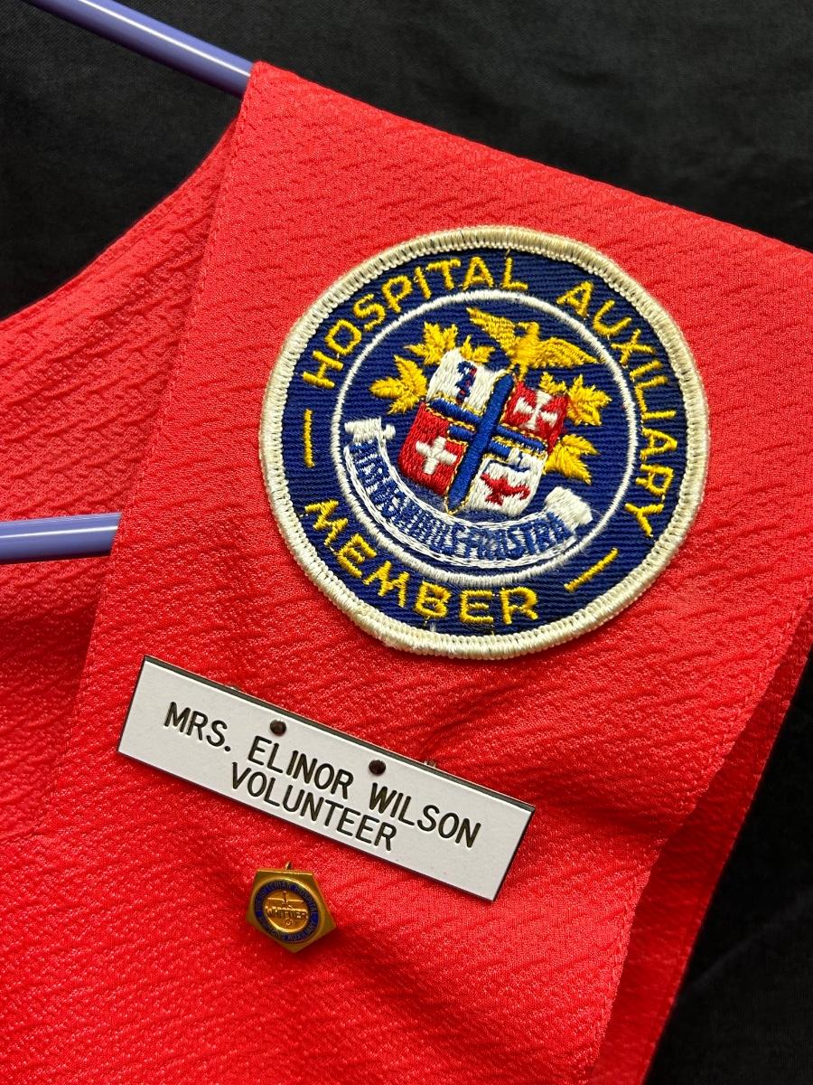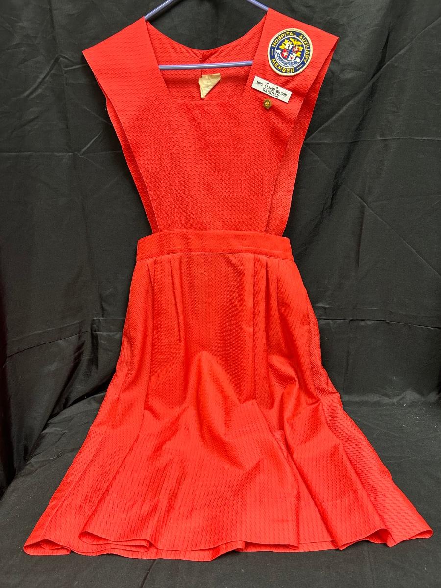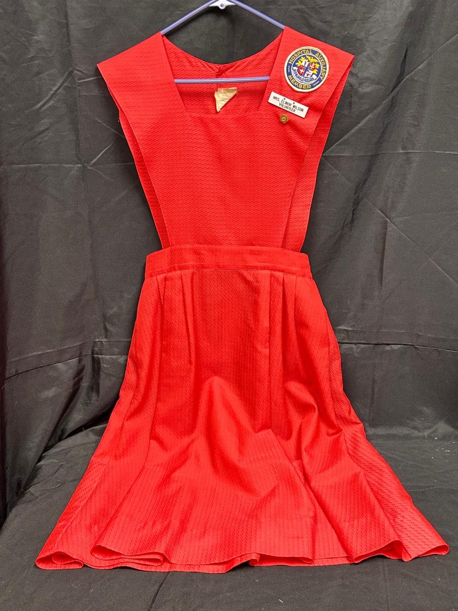 Vintage Candy Stripper Hospital Volunteer Smock Apron Dress with Badge Pin And Patch