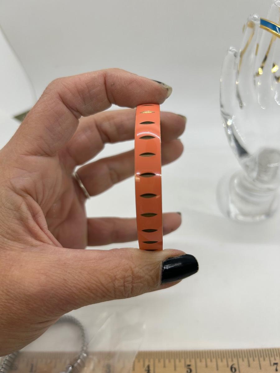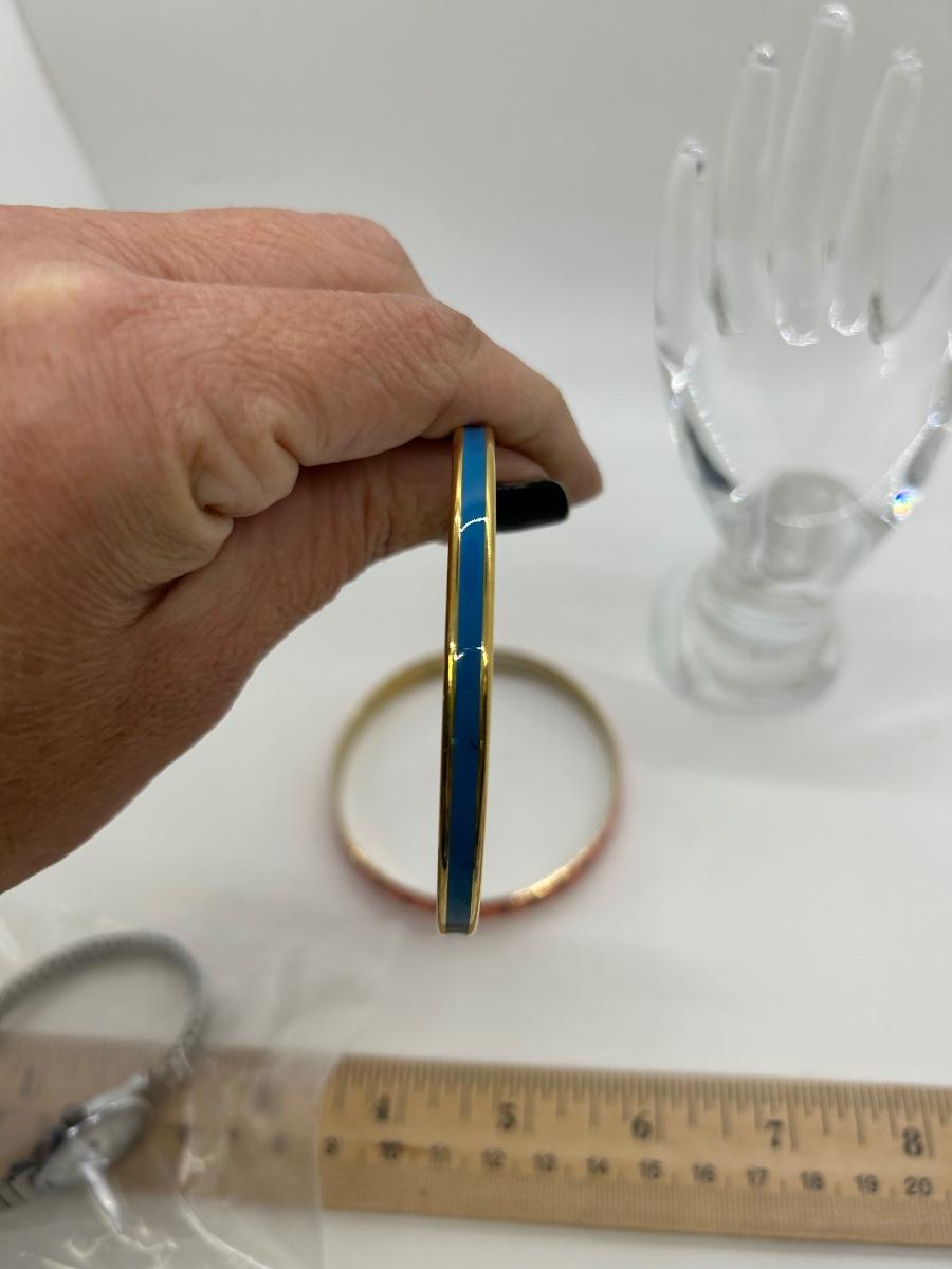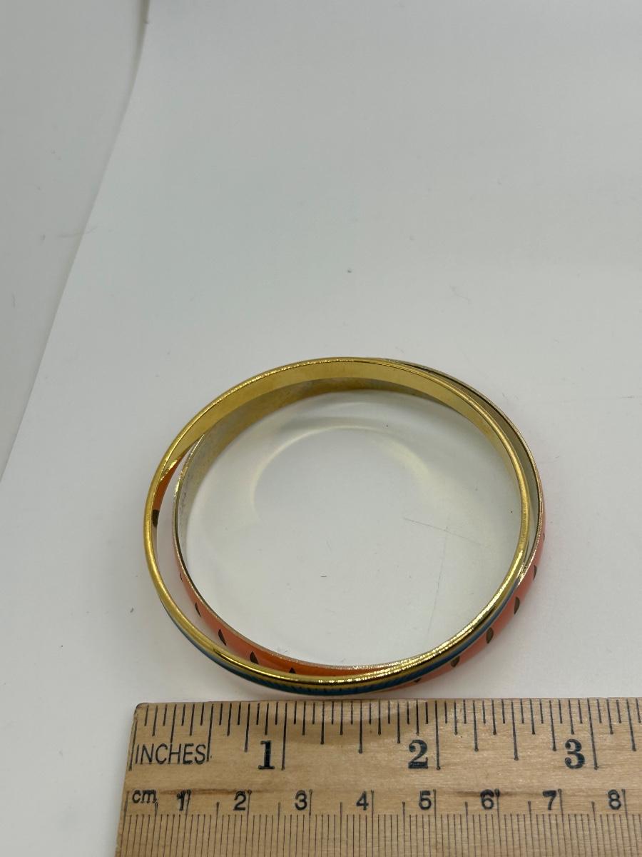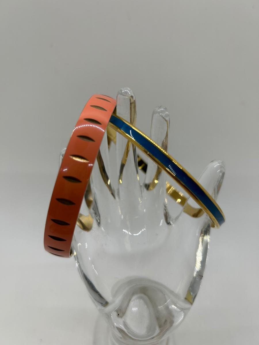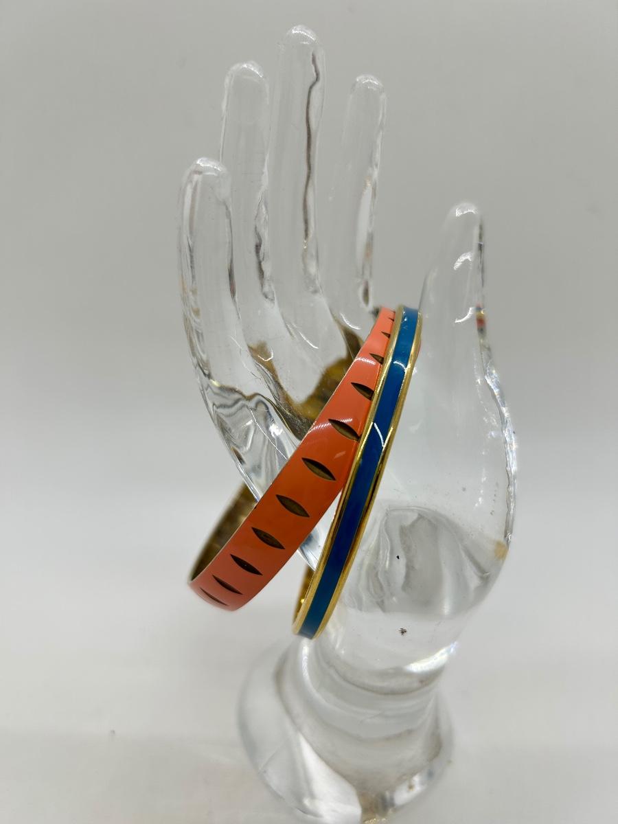 Pair of Retro Metal and Colorful Enamel Fashion Bangle Bracelets Coral and Blue. In good condition.