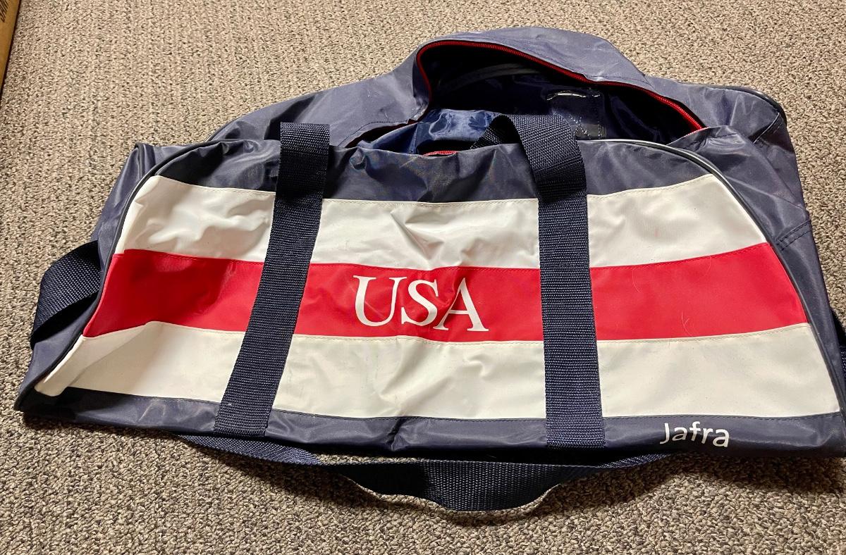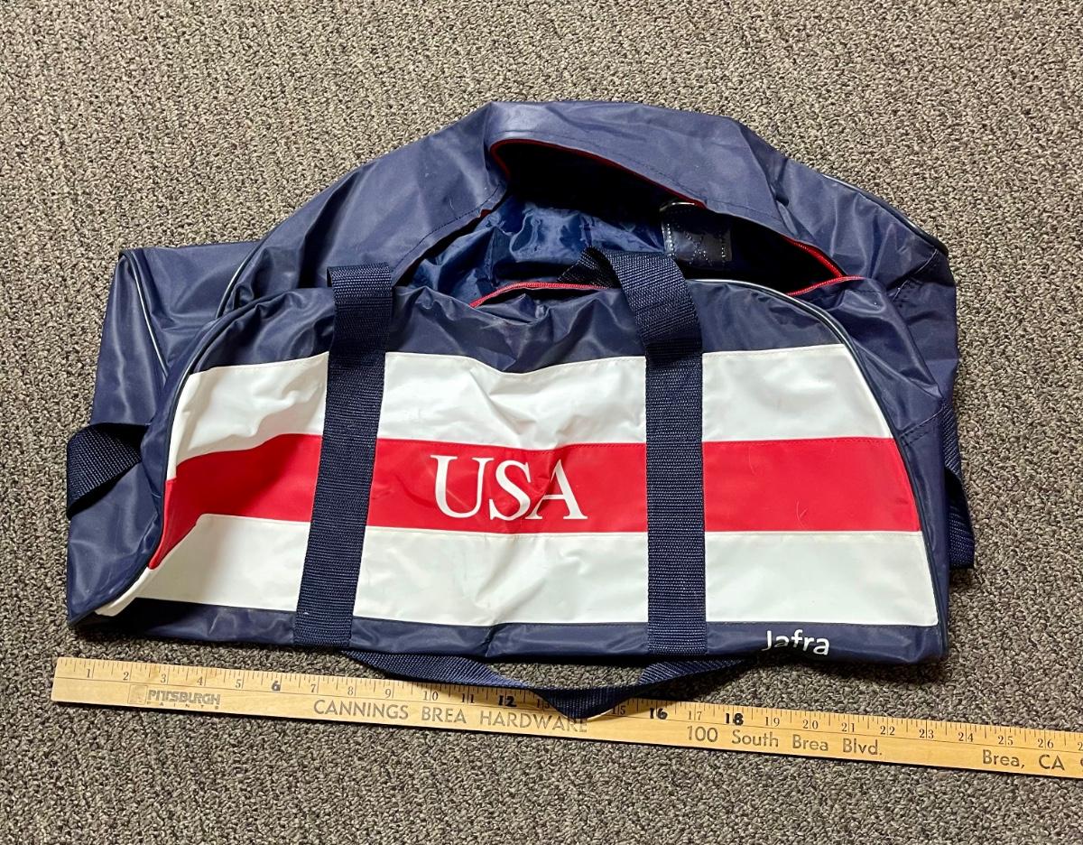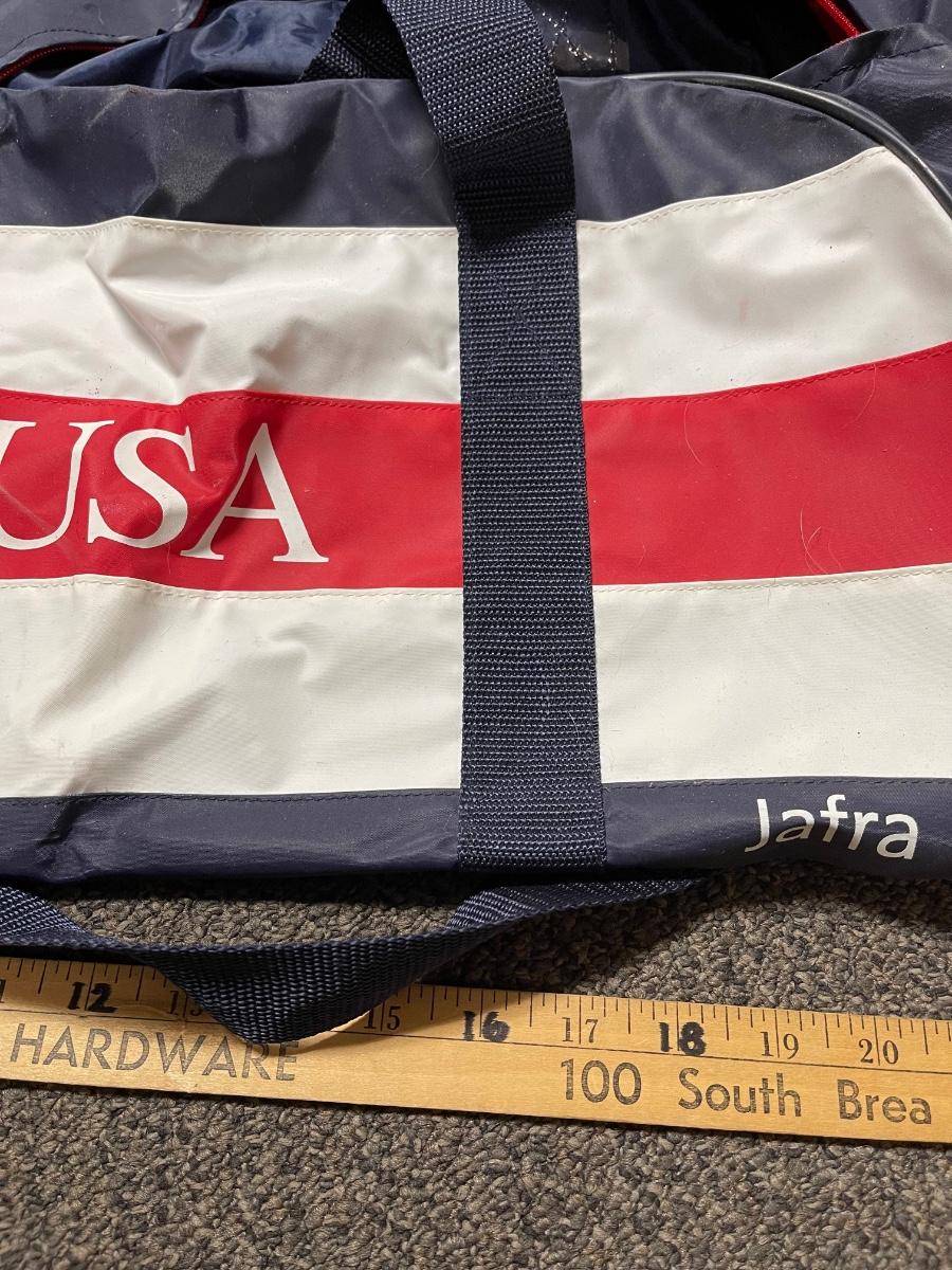Dark blue with red and white stripes. Block letters "USA" on each side. Zipper closure at top. Approx. 24" long with blue nylon webbing shoulder strap. Good used condition.